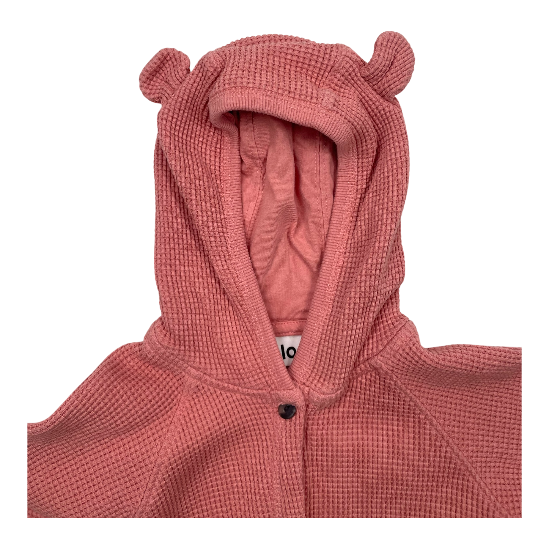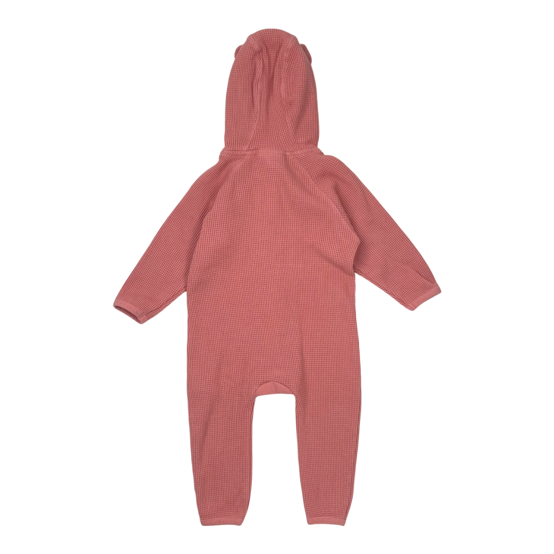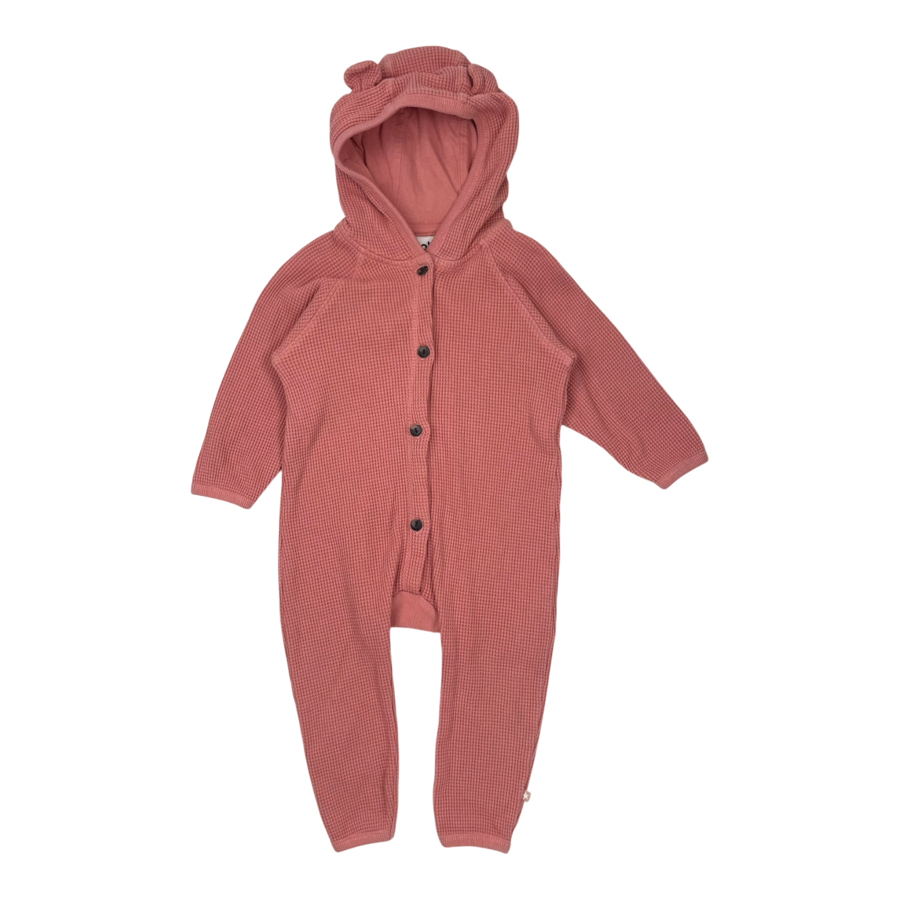Molo Faith jumpsuit with bear ear hood, long sleeves and button down closure.