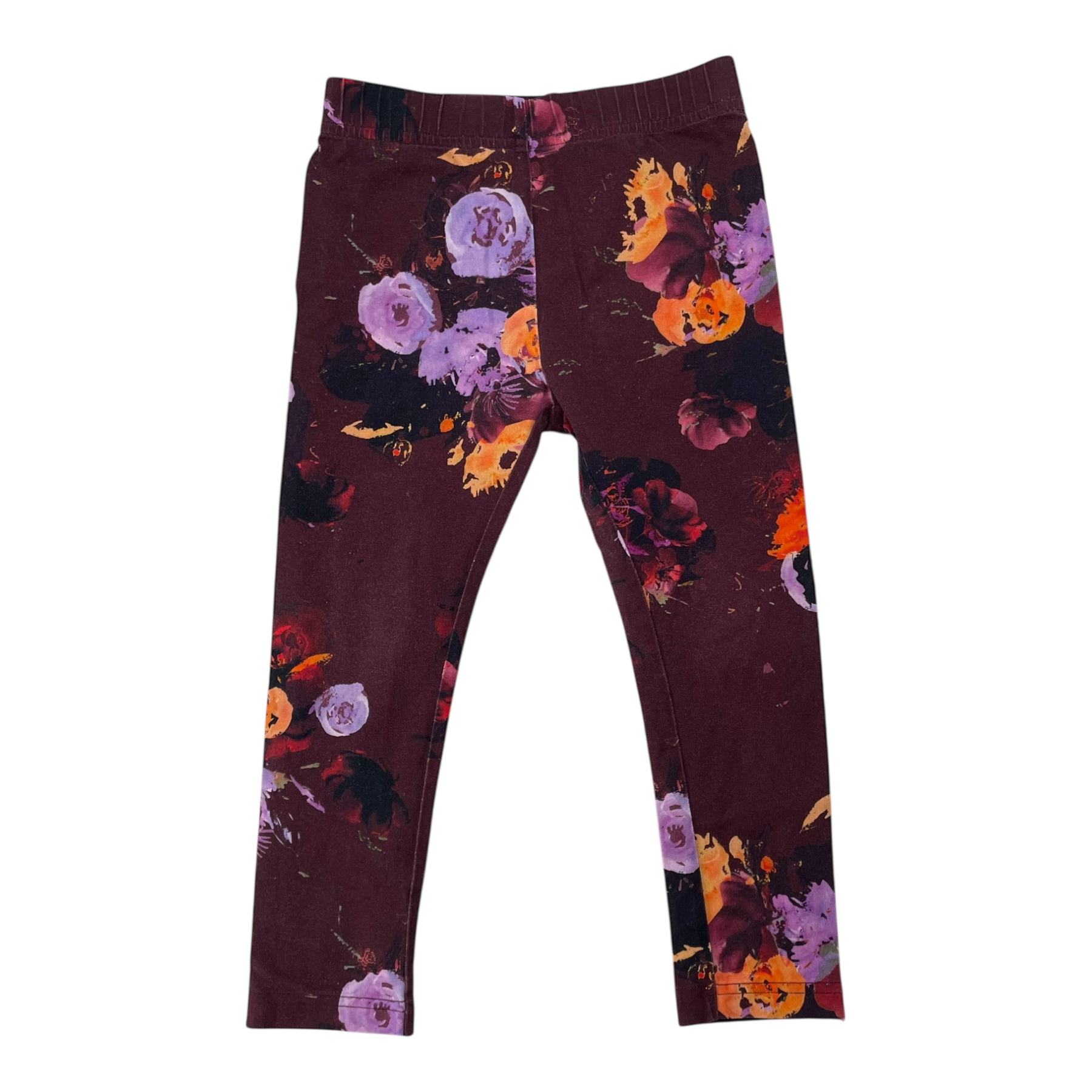 Kaiko leggings in purple flower print. There is some light fluff on the fabric.