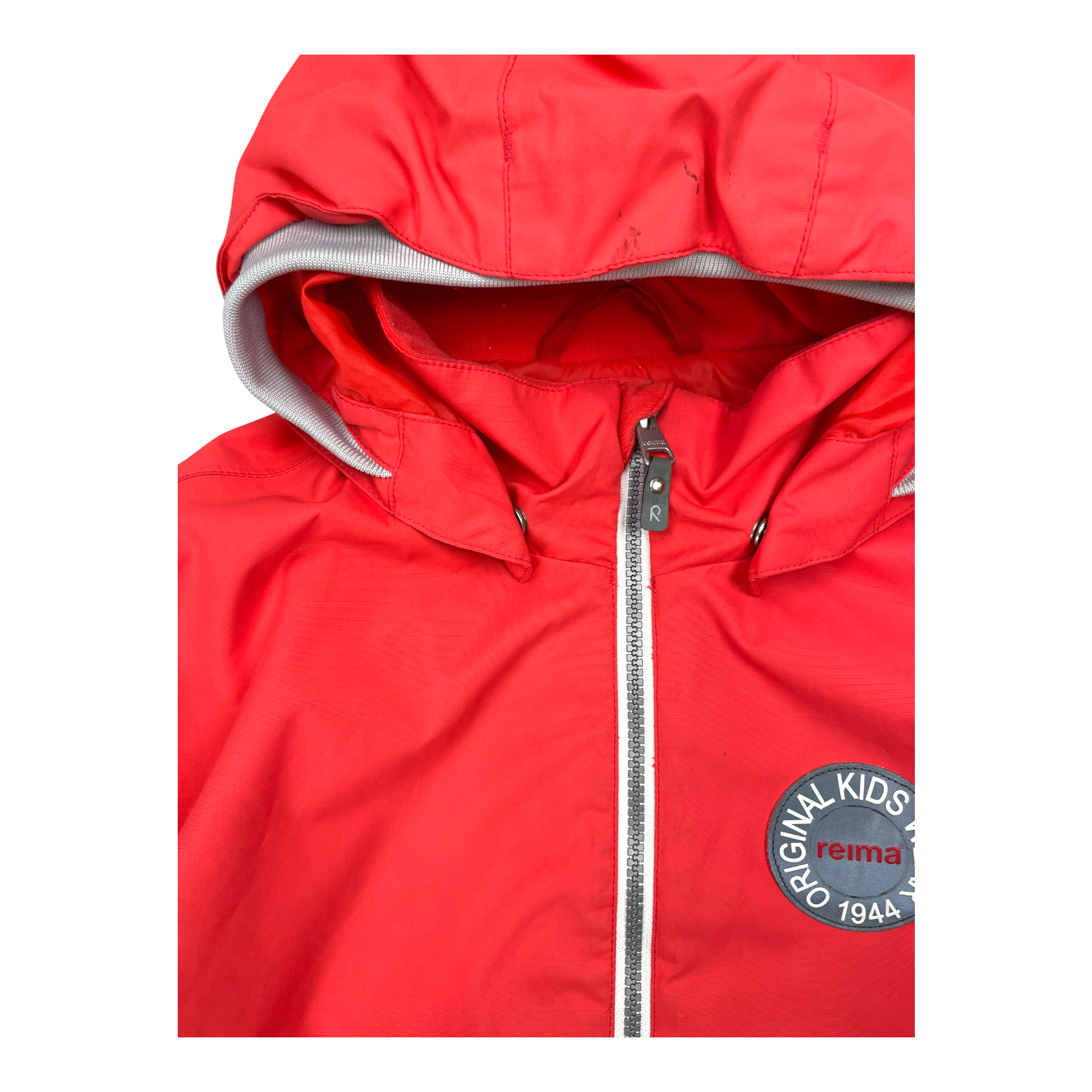 Reima Taag midseason jacket with detachable hood, two snap button pockets, reflective details, and adjustable elastic at the hem. The material is originally waterproof up to 8,000mm water column, and the main seams are sealed.