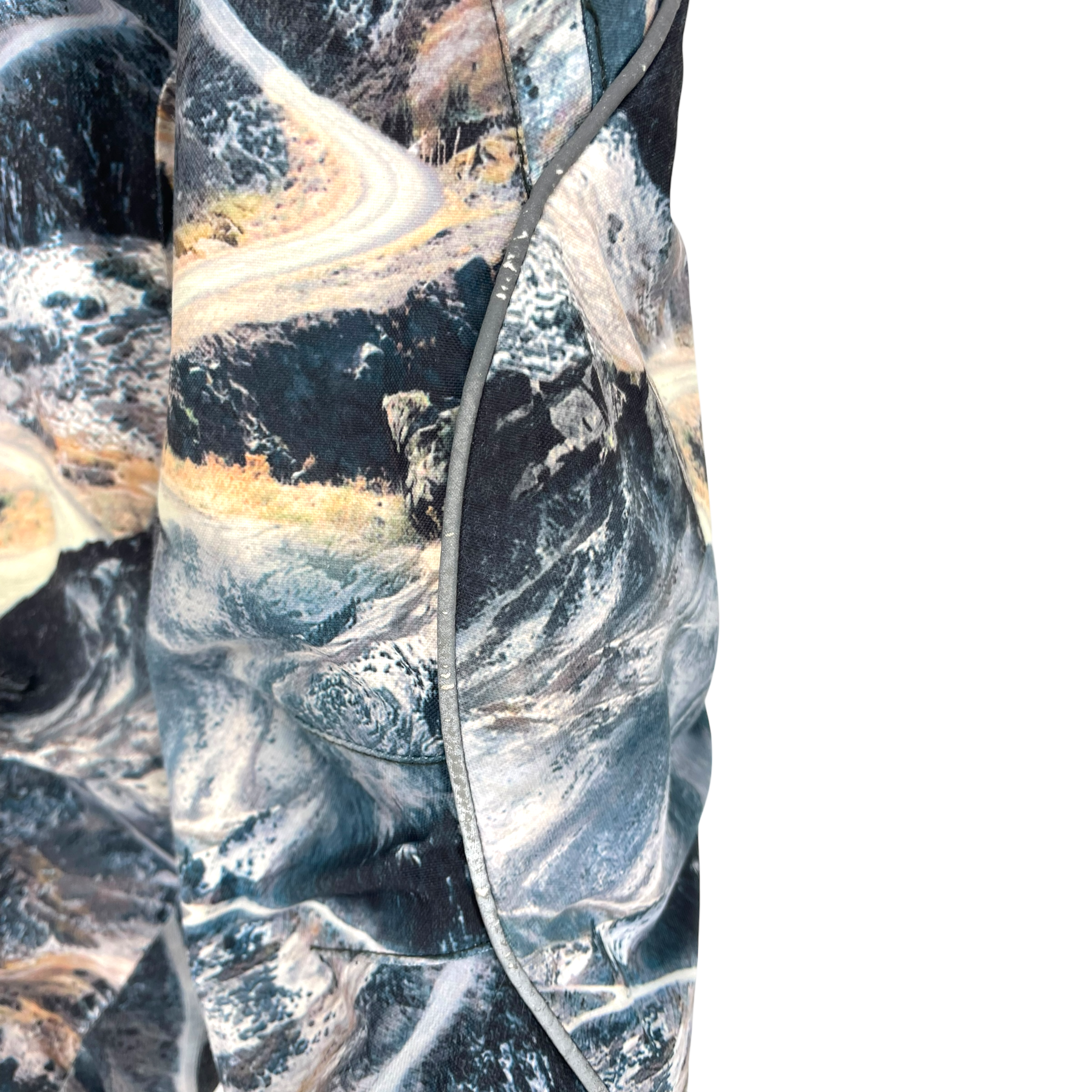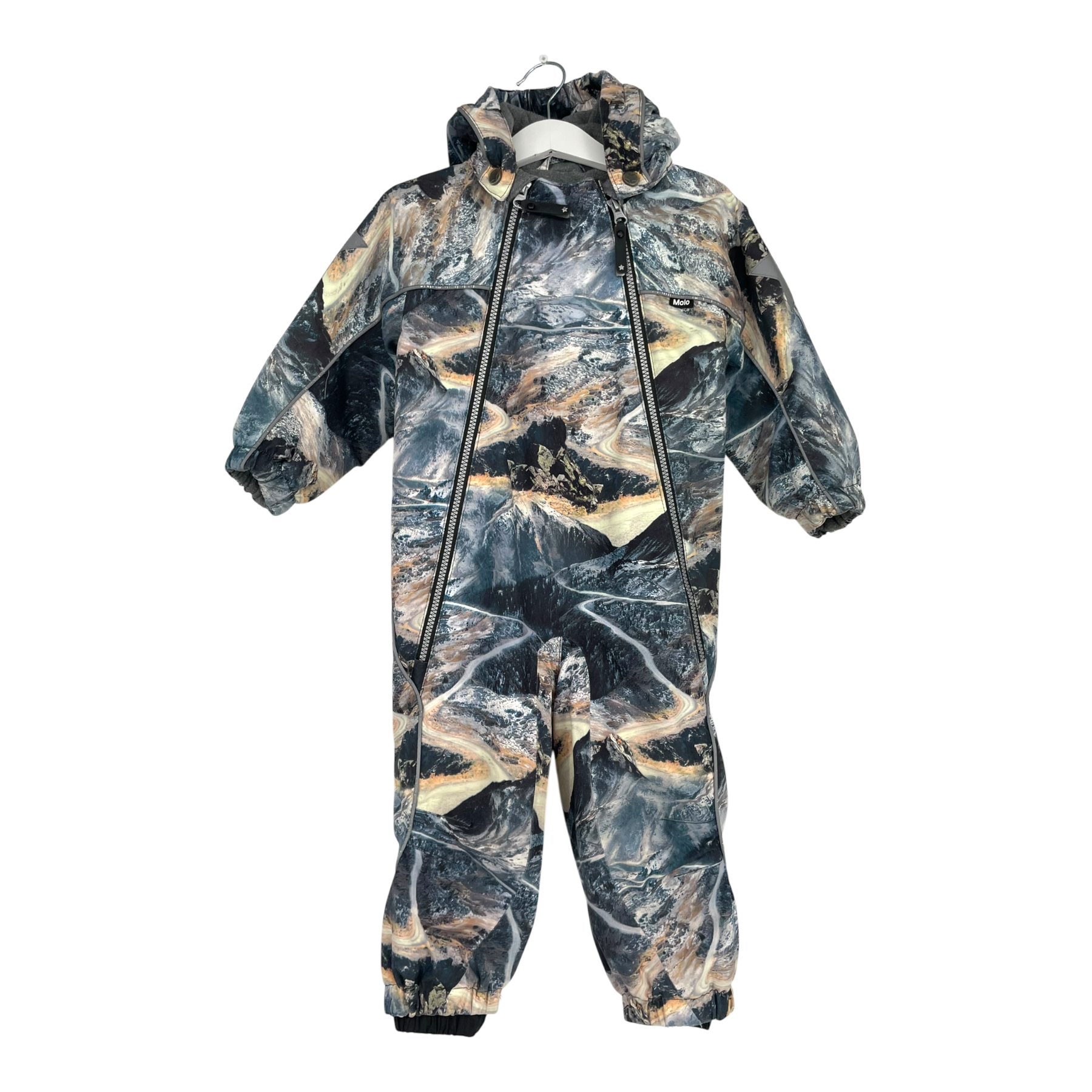 Molo Pyxis overall in a landscape print. The overall is a functional snowsuit with reflector piping. Polaris has a detachable hood, a double zip closure and Molo's star reflectors on the sleeves and legs and rubber foot loops. In this item the foot loops are missing. The reflecting details are worn near the zipper.