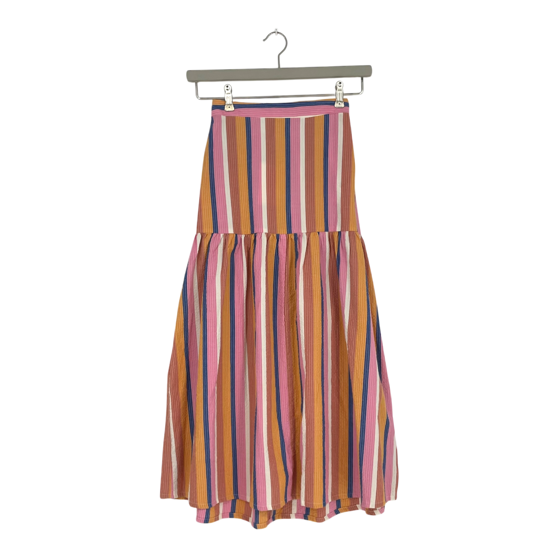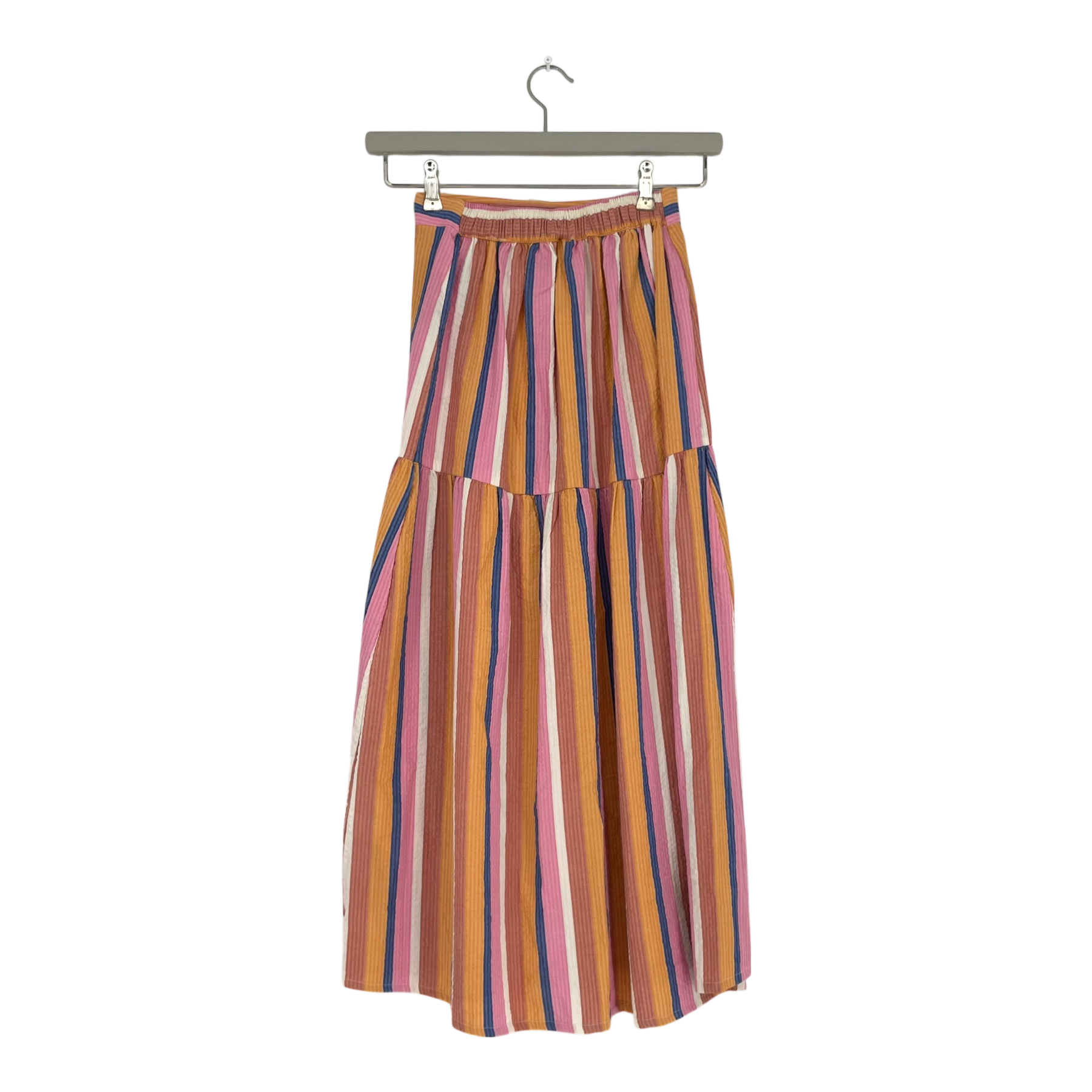 Dedicated skirt is voluminous and ruffled with elastic waist.