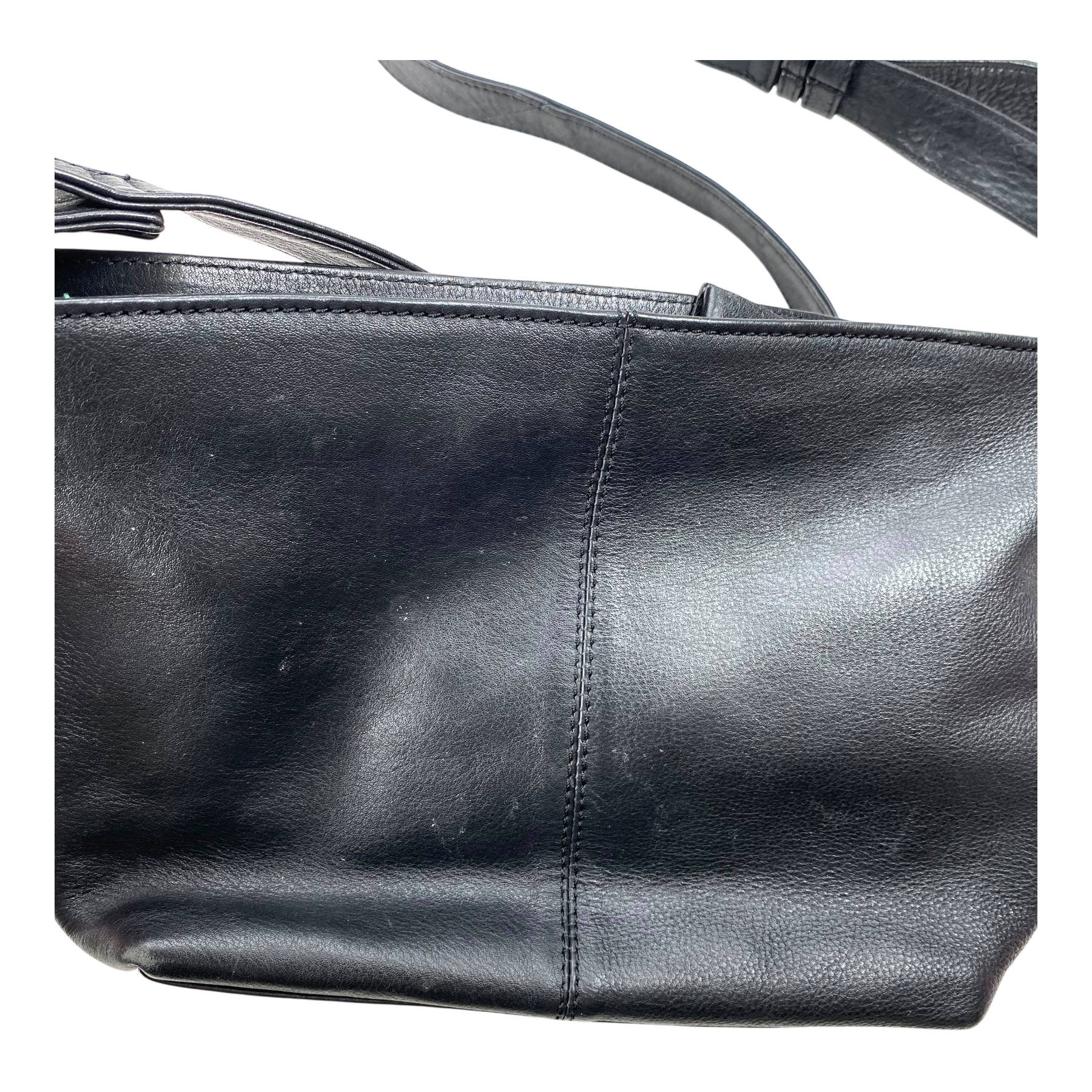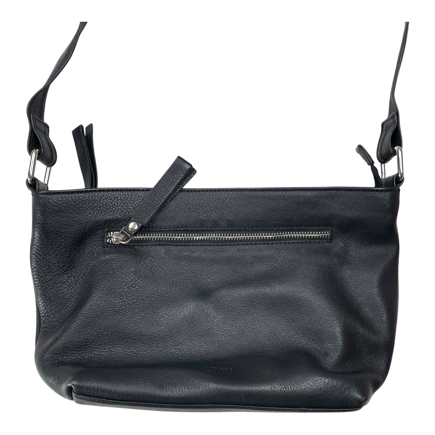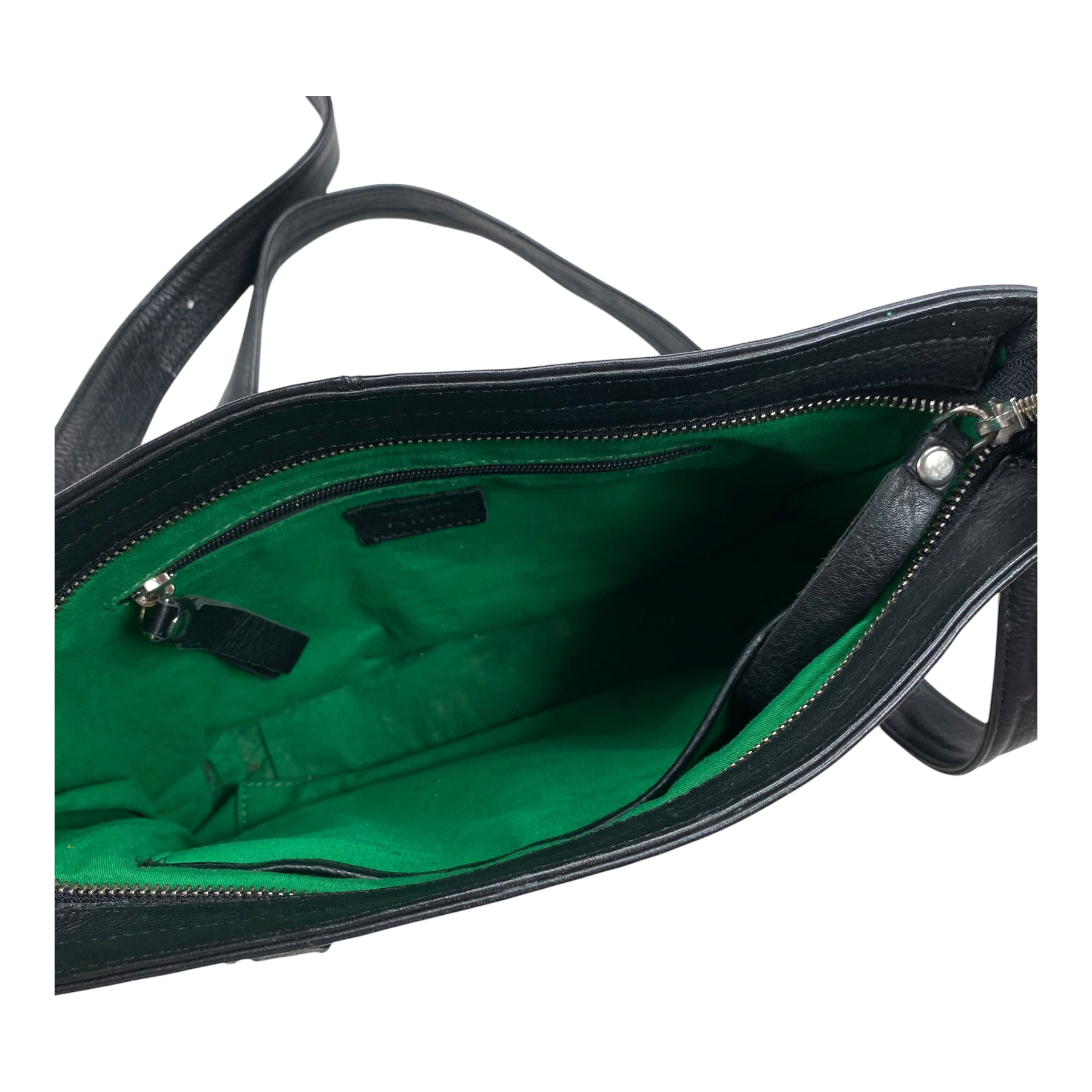 Lumi Arki collection medium sized crossbody has a green cotton lining and silver hardware. There is one main compartment with zipper closure and a pocket on the back with a zipper closure. The strap is adjustable.