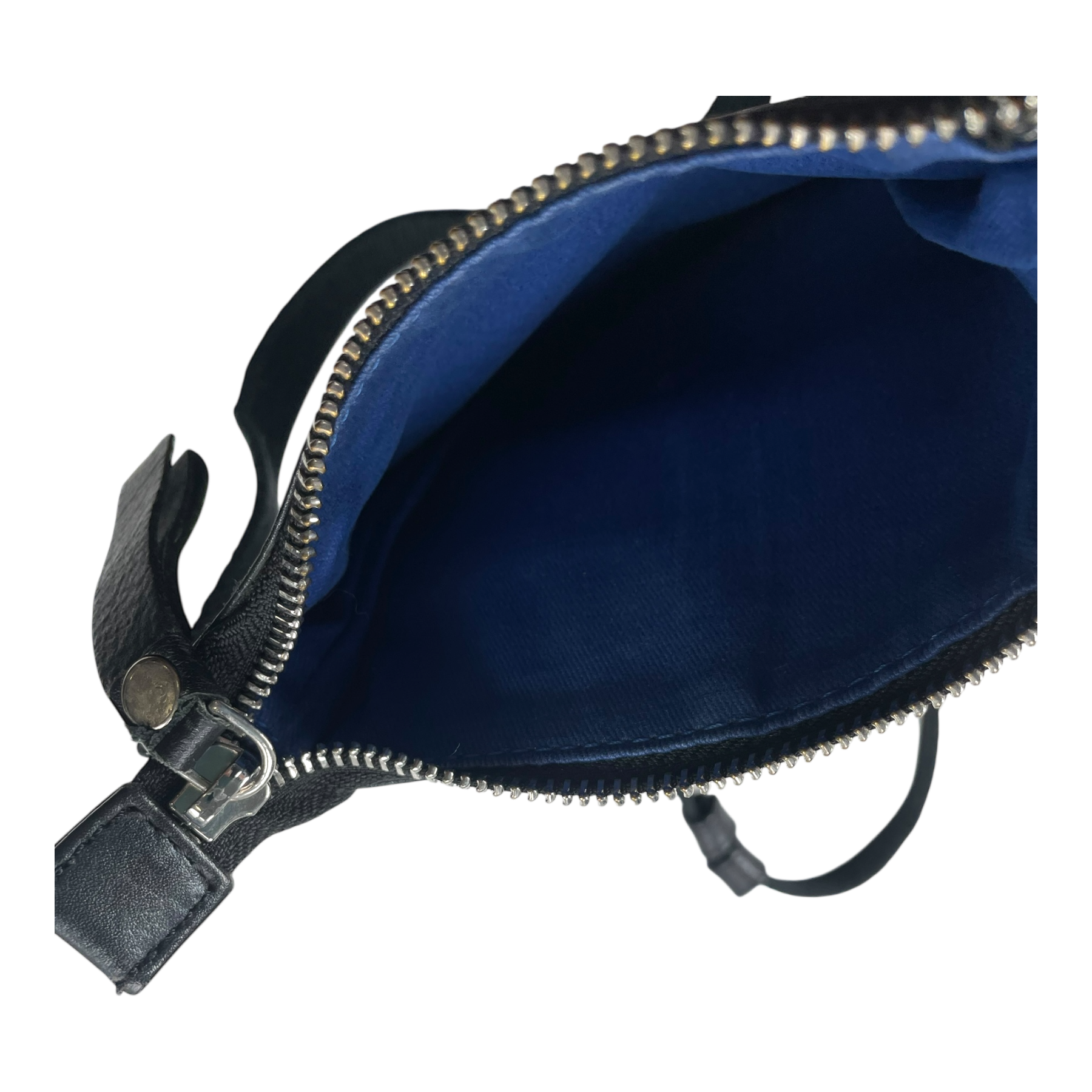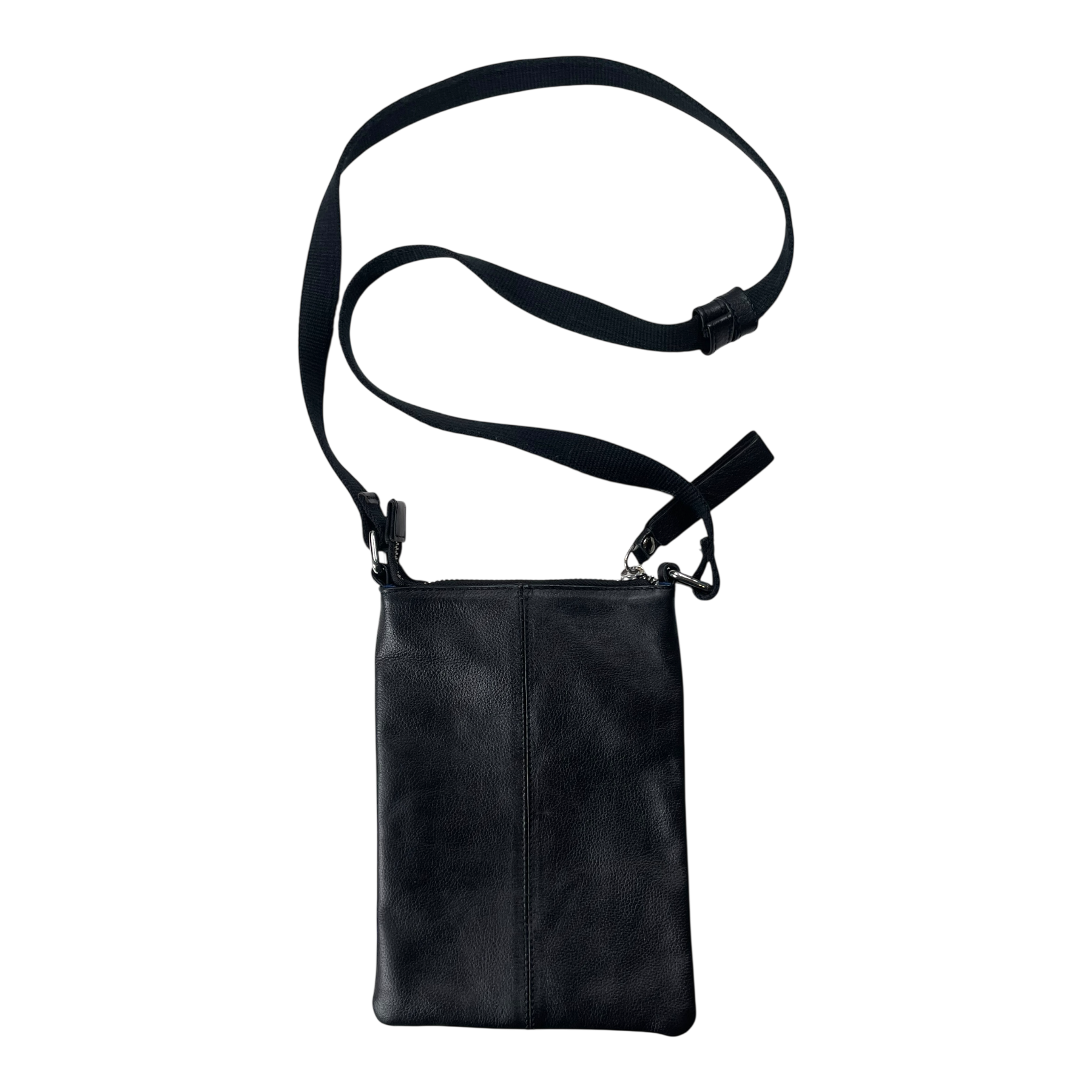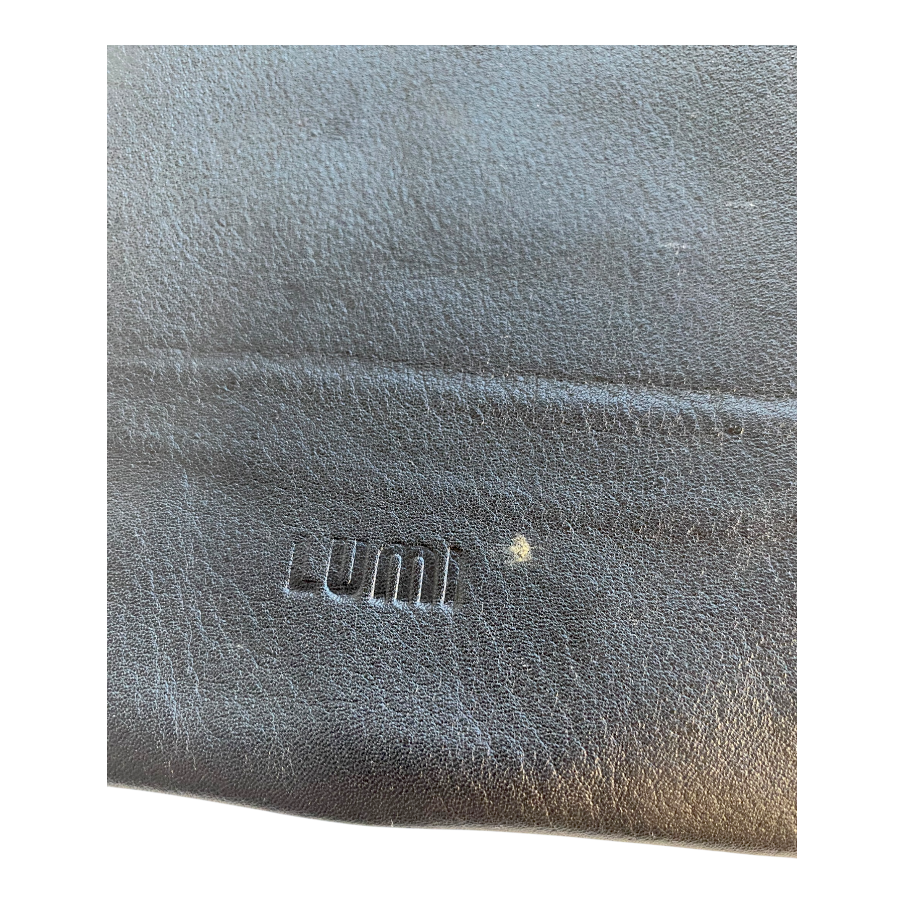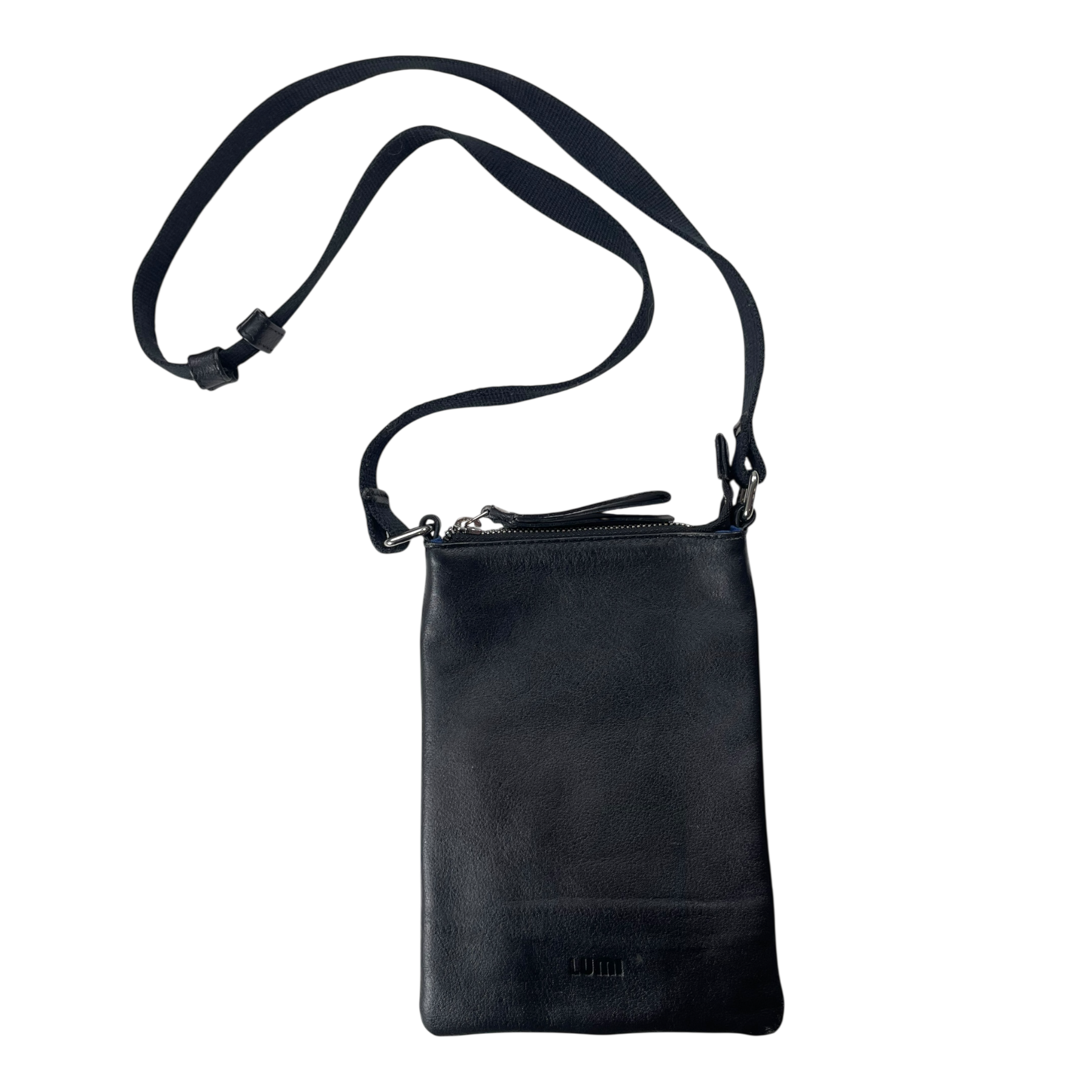 Lumi pouch bag is made out of full grain, trough-dyed cow leather with a cotton twill lining and metal hardware. The item has two stains and some wear on the strap.