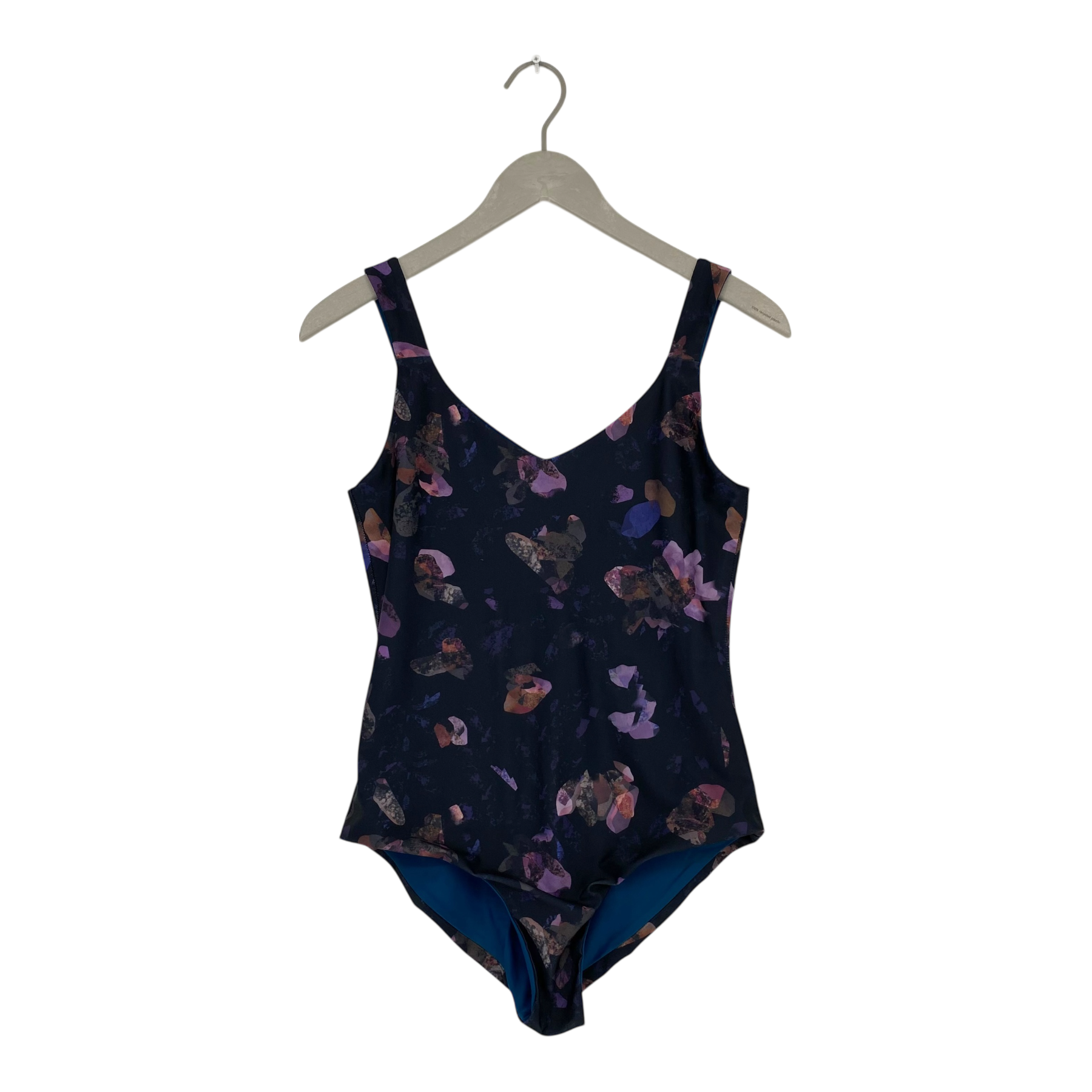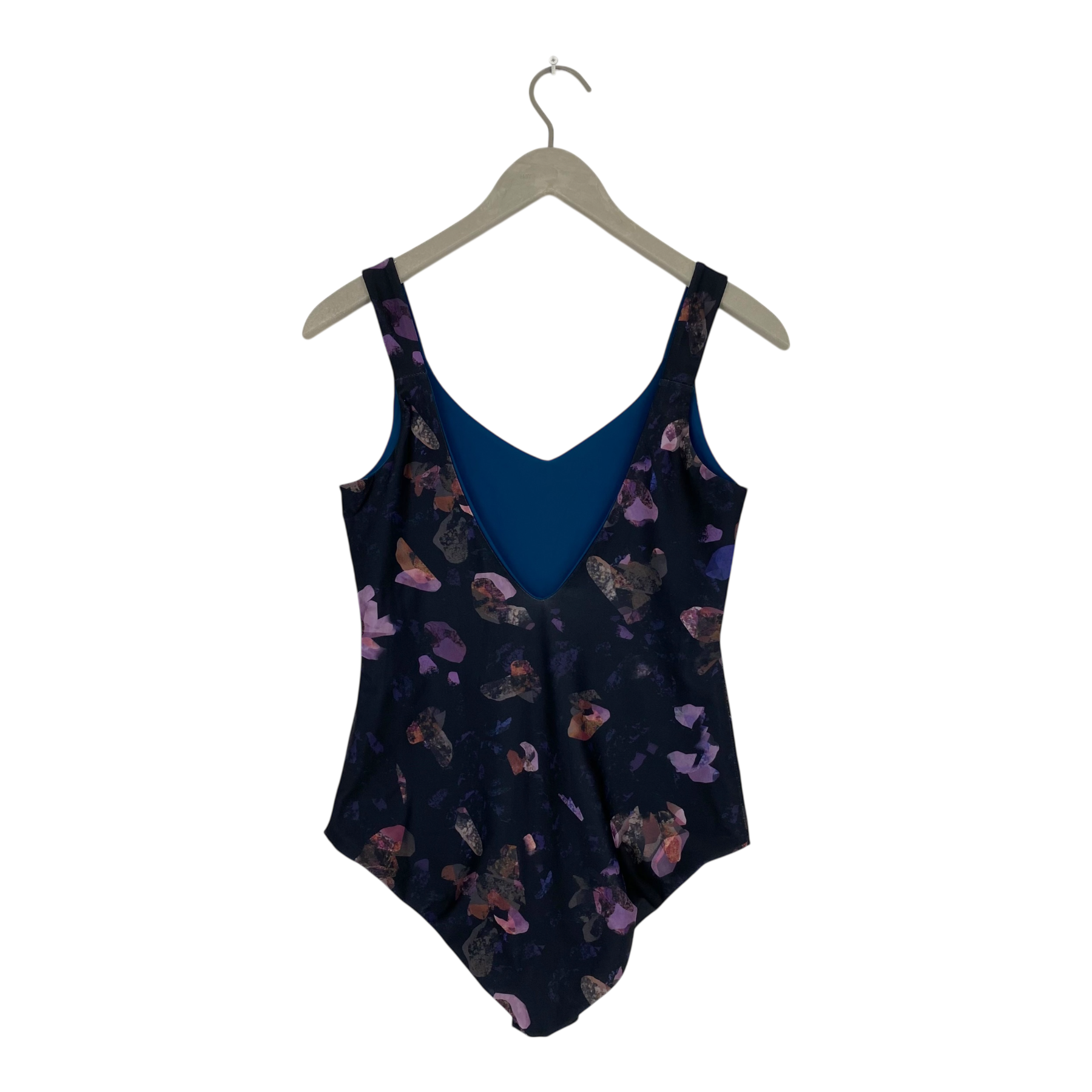 Morico women's one-piece swimsuit in Dark matter print. The swimsuit is reversible. Other side is petrol color and other side has abstract print on black base.