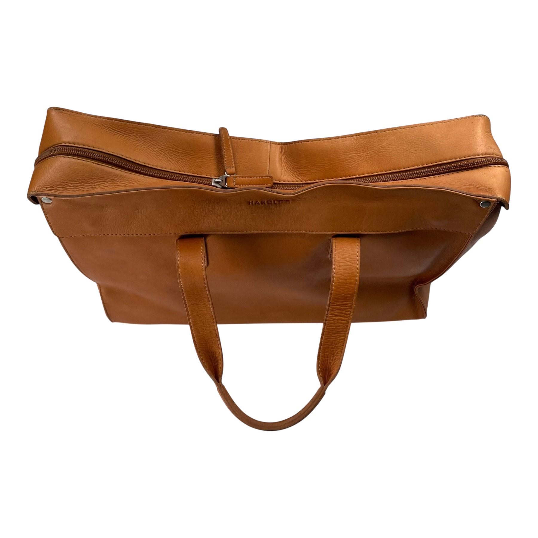 Harold's Bags weekender bag with two handles. The combination of the high-quality processed leather and the timeless cuts of the bags convey an authentic feeling that emphasizes the the beautiful patina created by regular use. There is a zipper closure main compartment and one small pocket on the back.