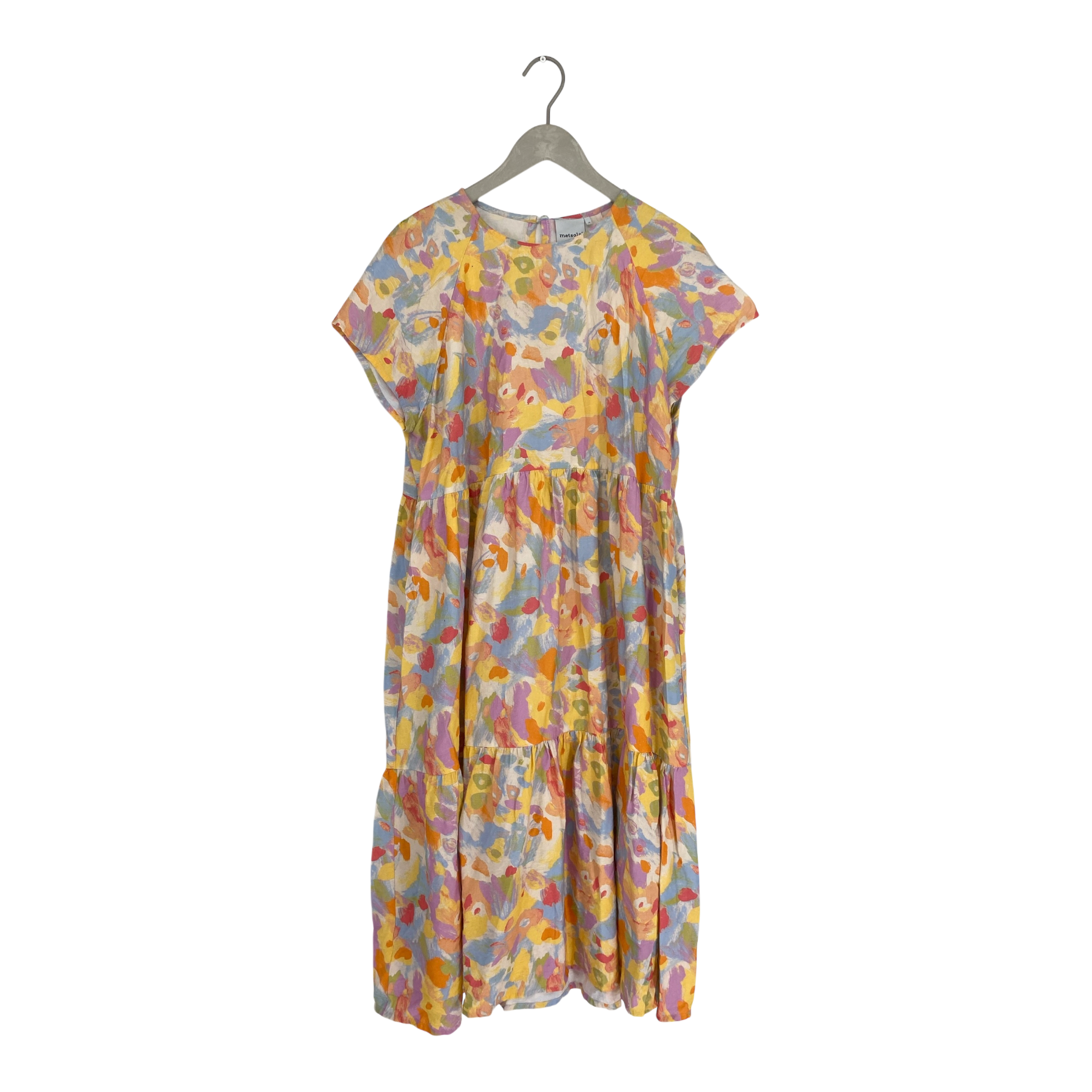 Metsola Tahiti tiered dress in Beach party print with short sleeves, side pockets and button on the neck.