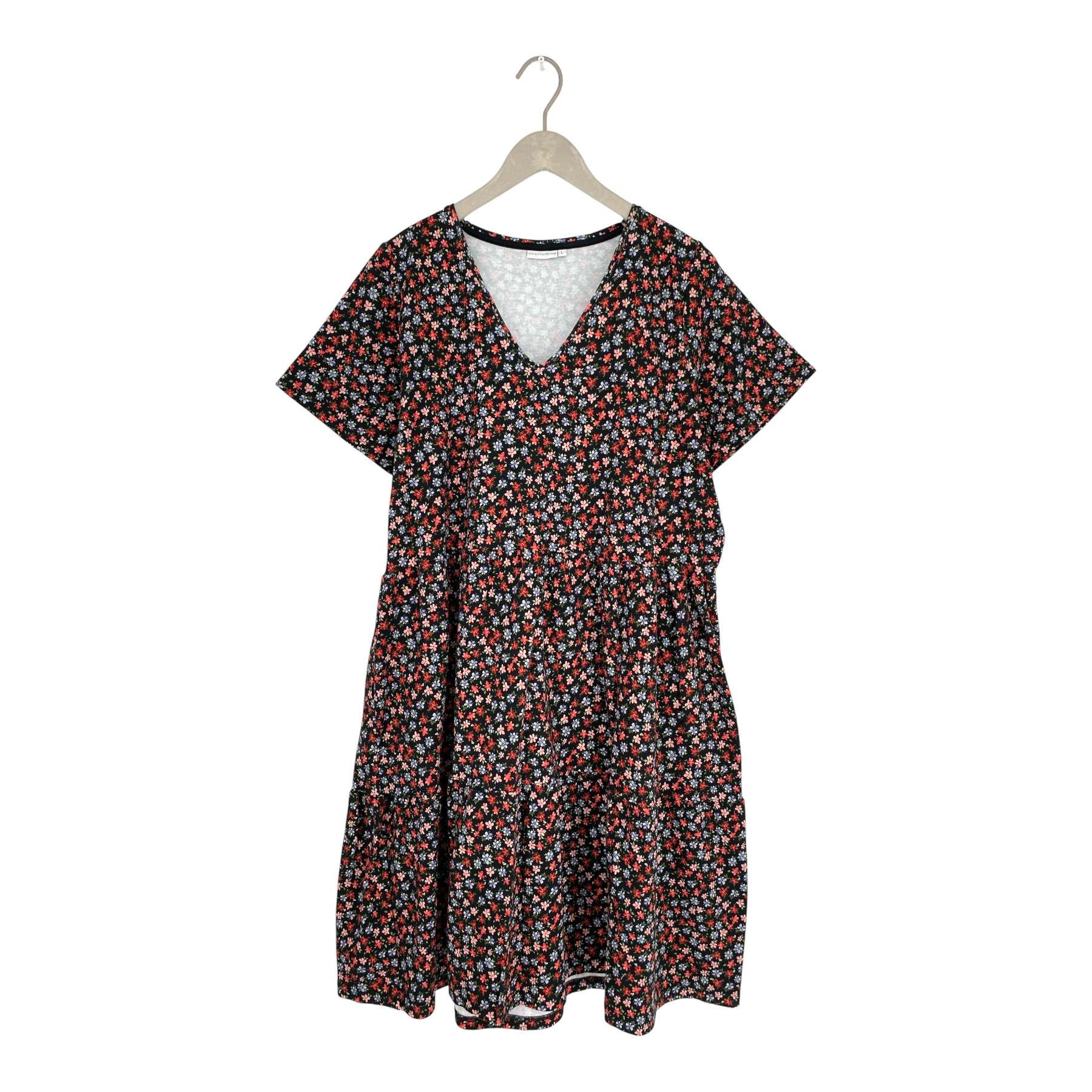 Riva Clothing dress in Meadow print with a v-neck, short sleeves and tiered hem.