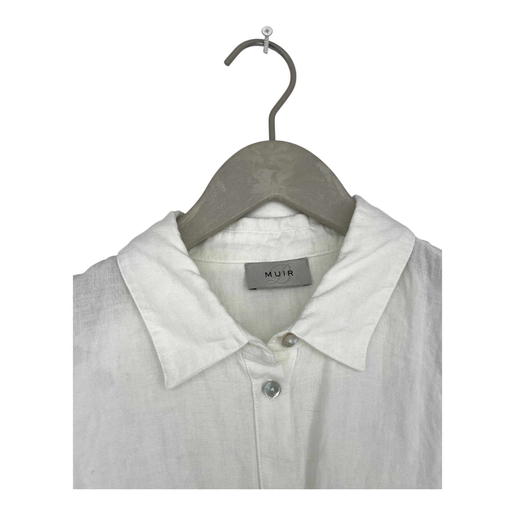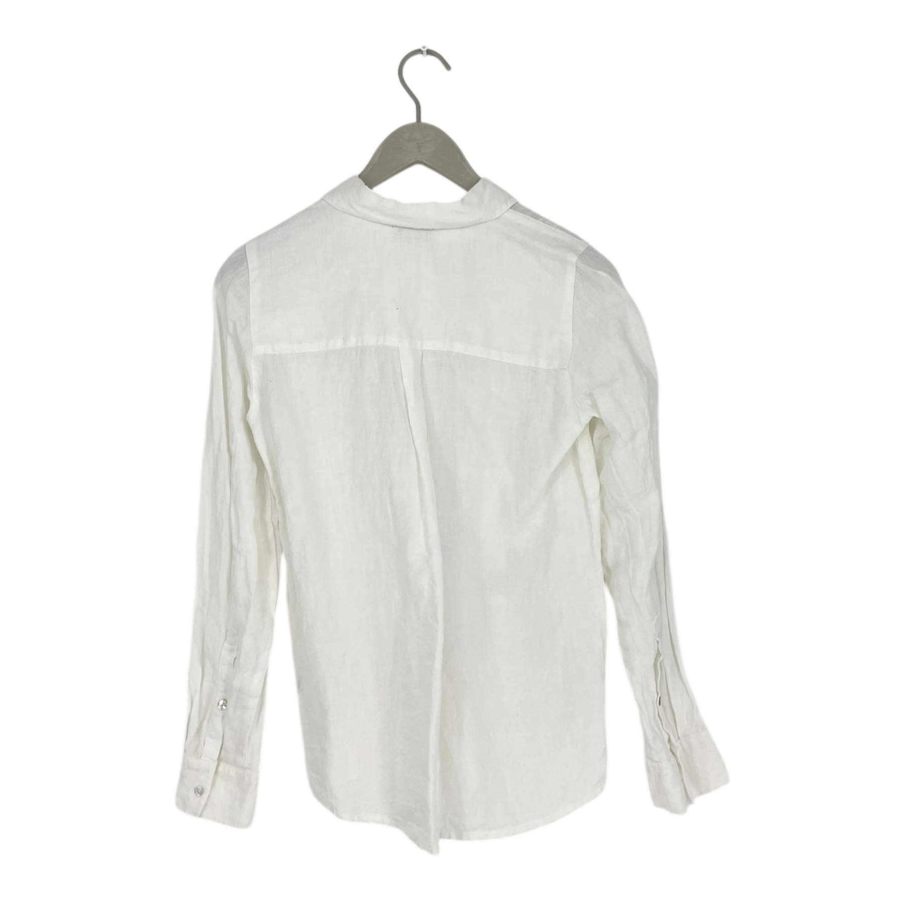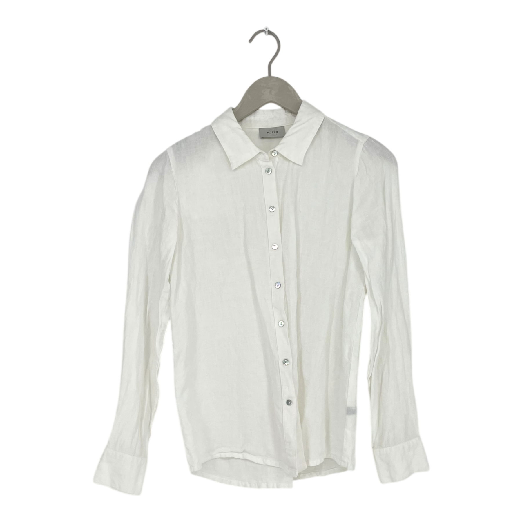 Balmuir women’s slim-fit classic linen shirt. The shirt has a button closure at the front and buttons on the cuffs. The item is otherwise in good condition, but there is a faint stain on the inside at the collar.