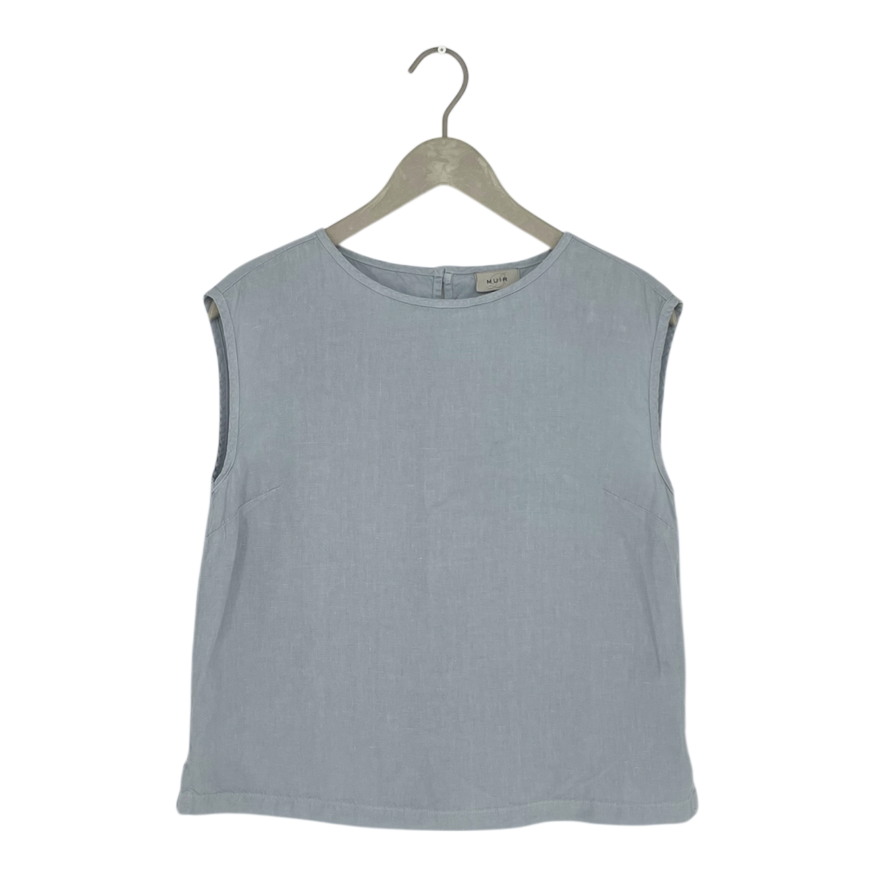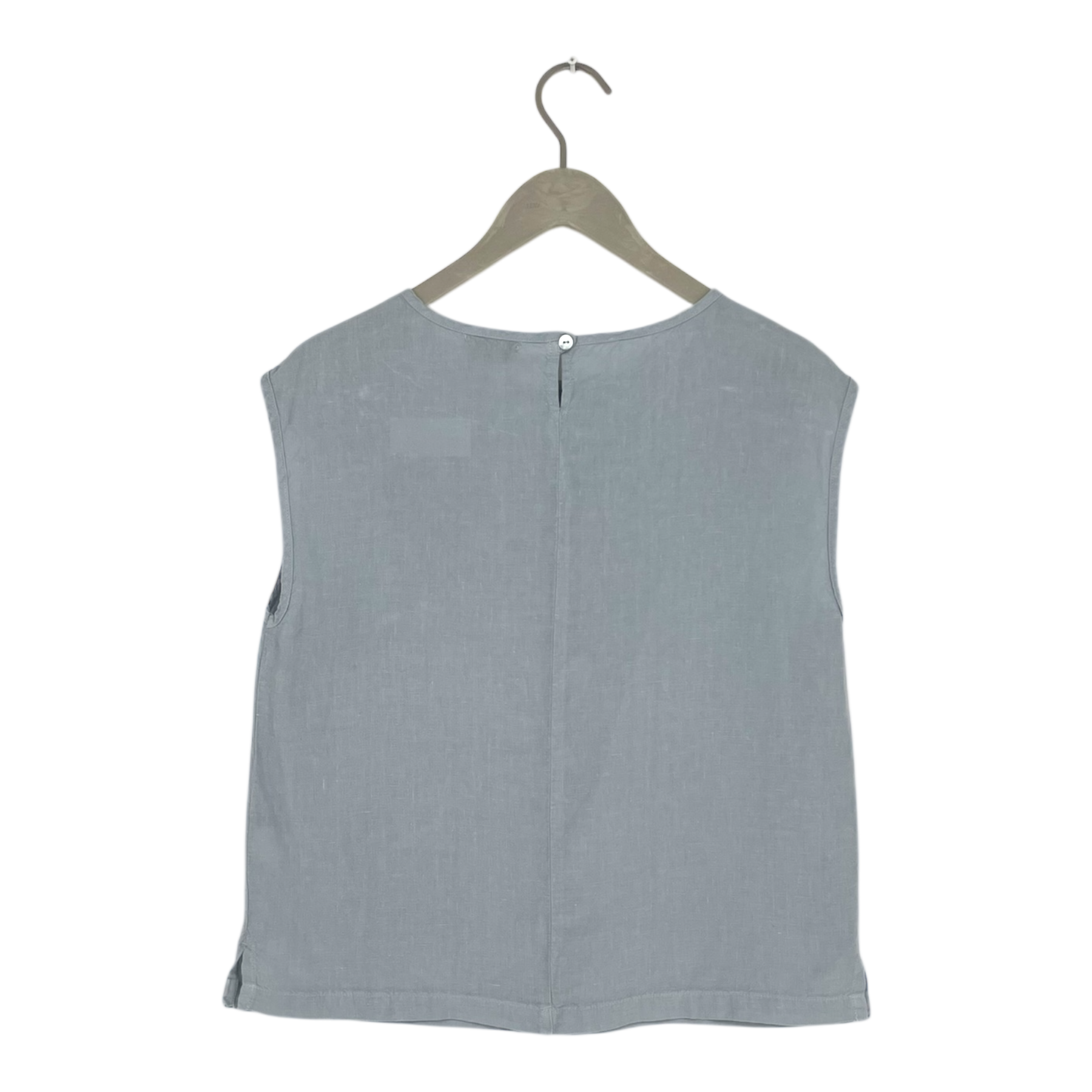 Balmuir women’s linen top. The top has a button closure at the back and small side slits at the hem. It has a straight cut and features a dart at the chest for shaping.