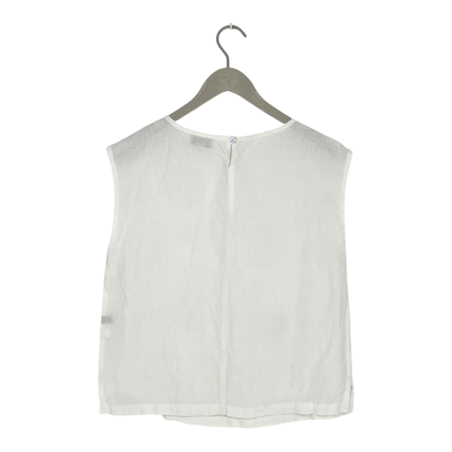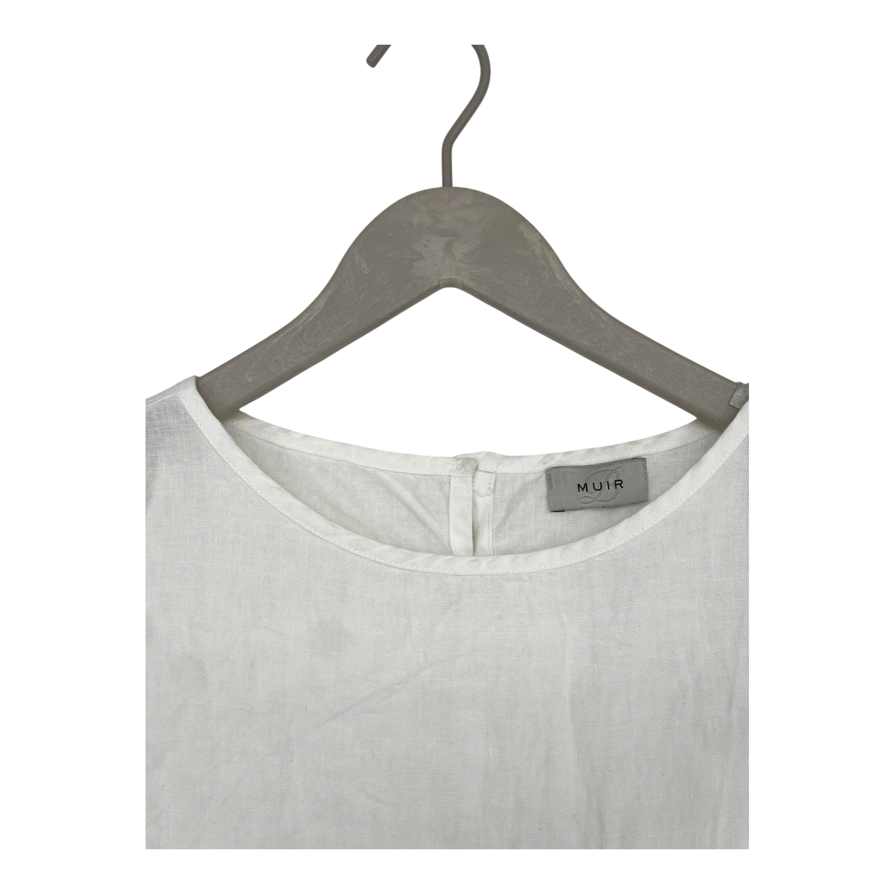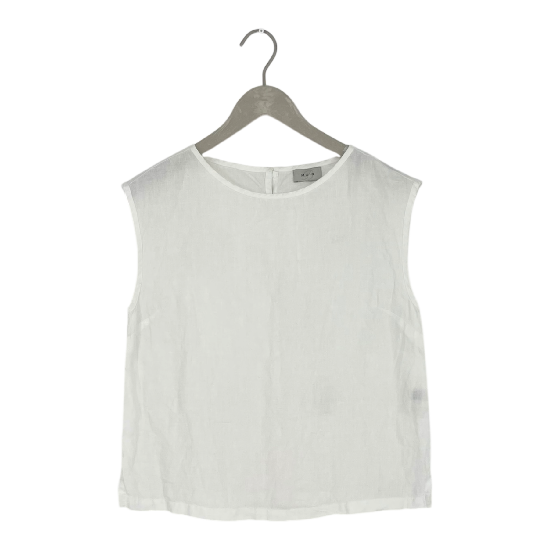 Balmuir women’s linen top. The top has a button closure at the back and small side slits at the hem. It has a straight cut and features a dart at the chest for shaping.