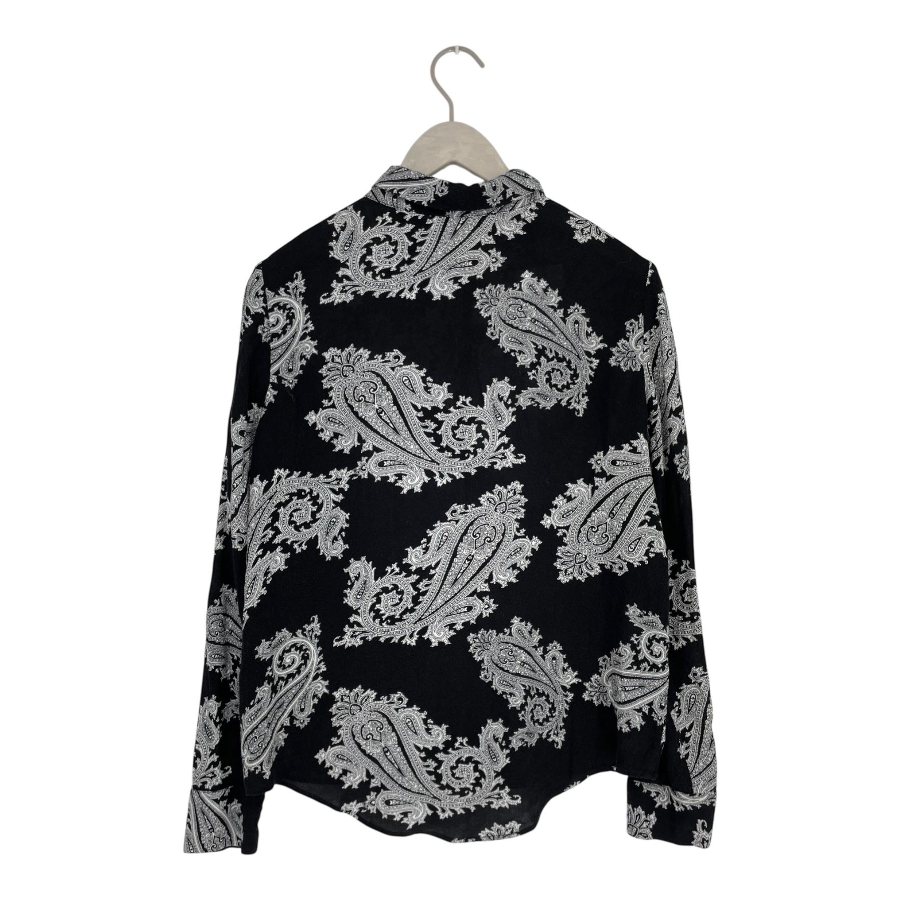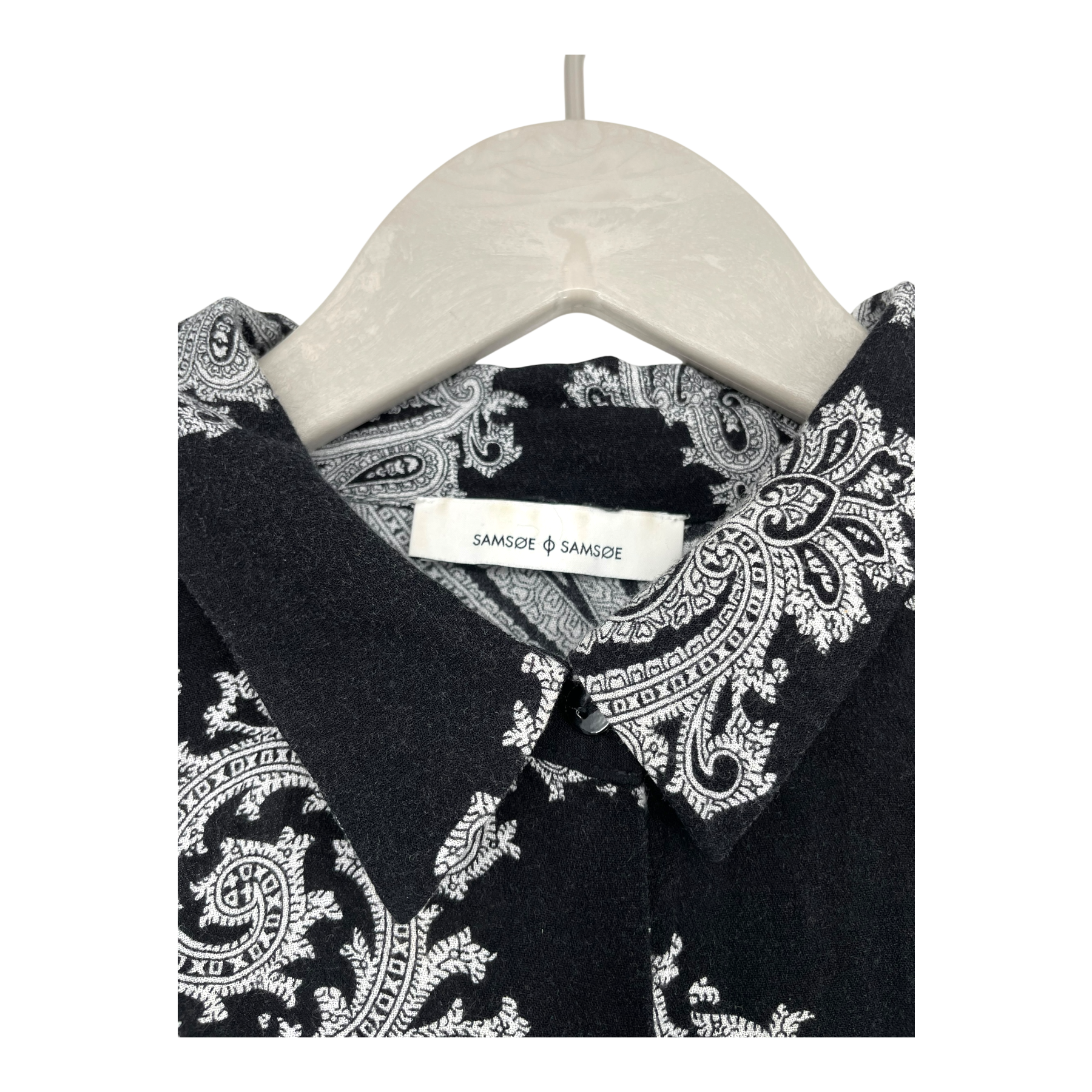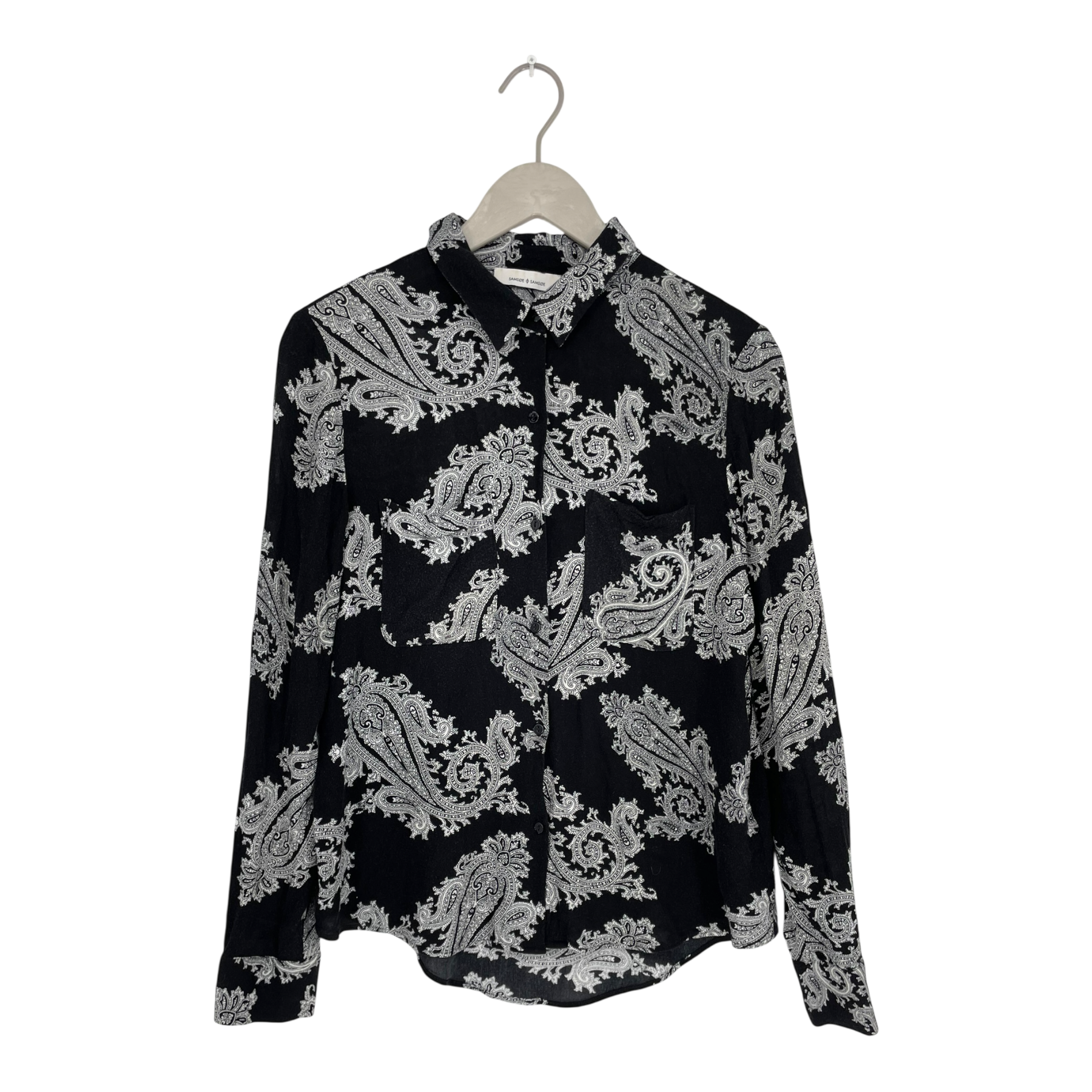 Samsøe Samsøe long-sleeved shirt with a classic pointed collar. The shirt features a black base with an all-over white paisley print, a full button placket, long sleeves with buttoned cuffs, and a single patch pocket on the chest.