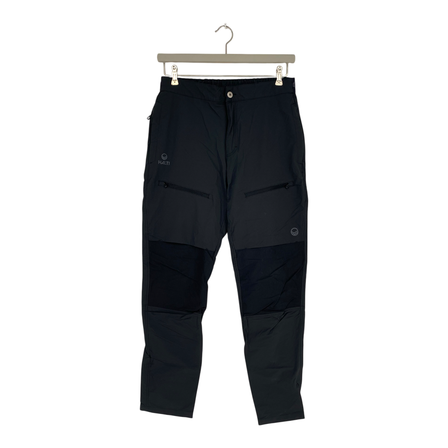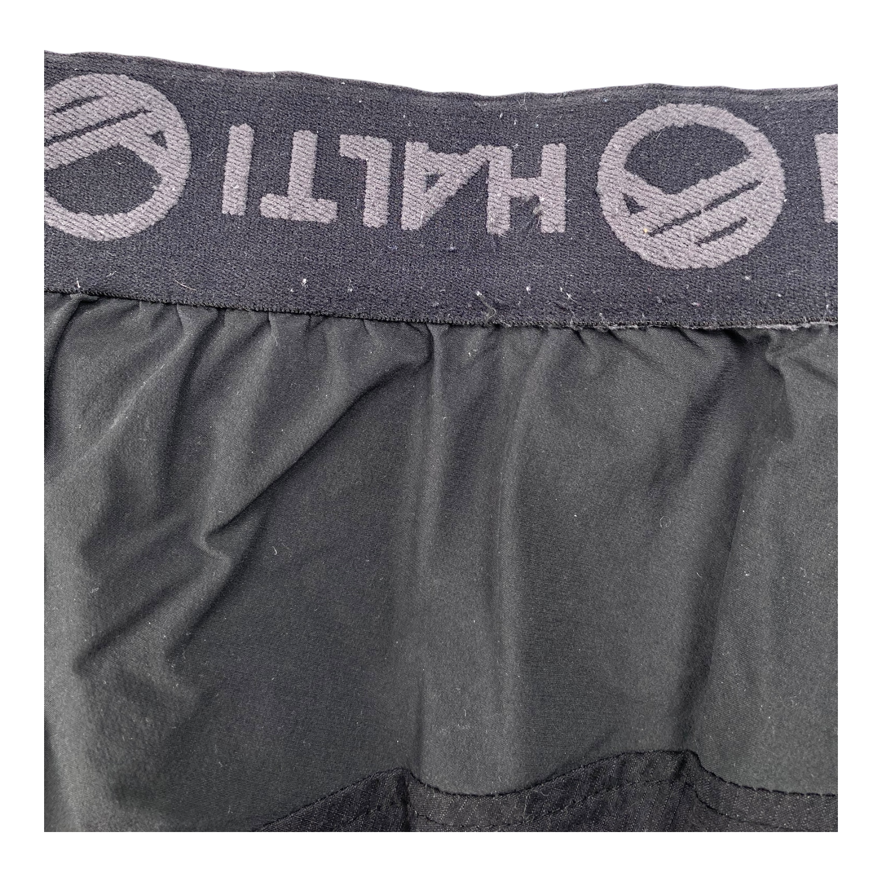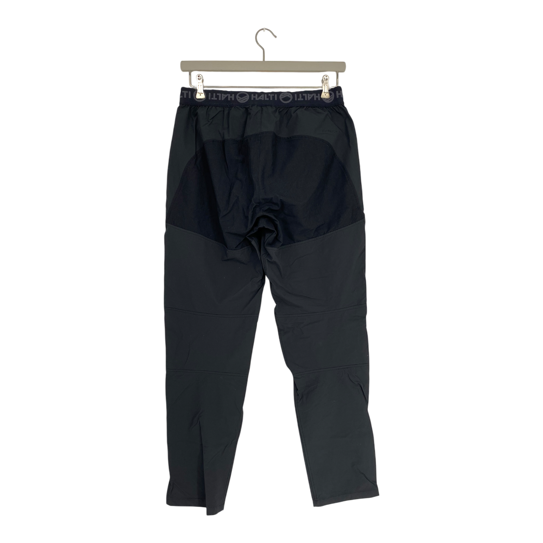 Halti woman's windbreaker pants with pockets. These shell pants are lightweight and have a stretchy waistband. They are made of two different fabrics.