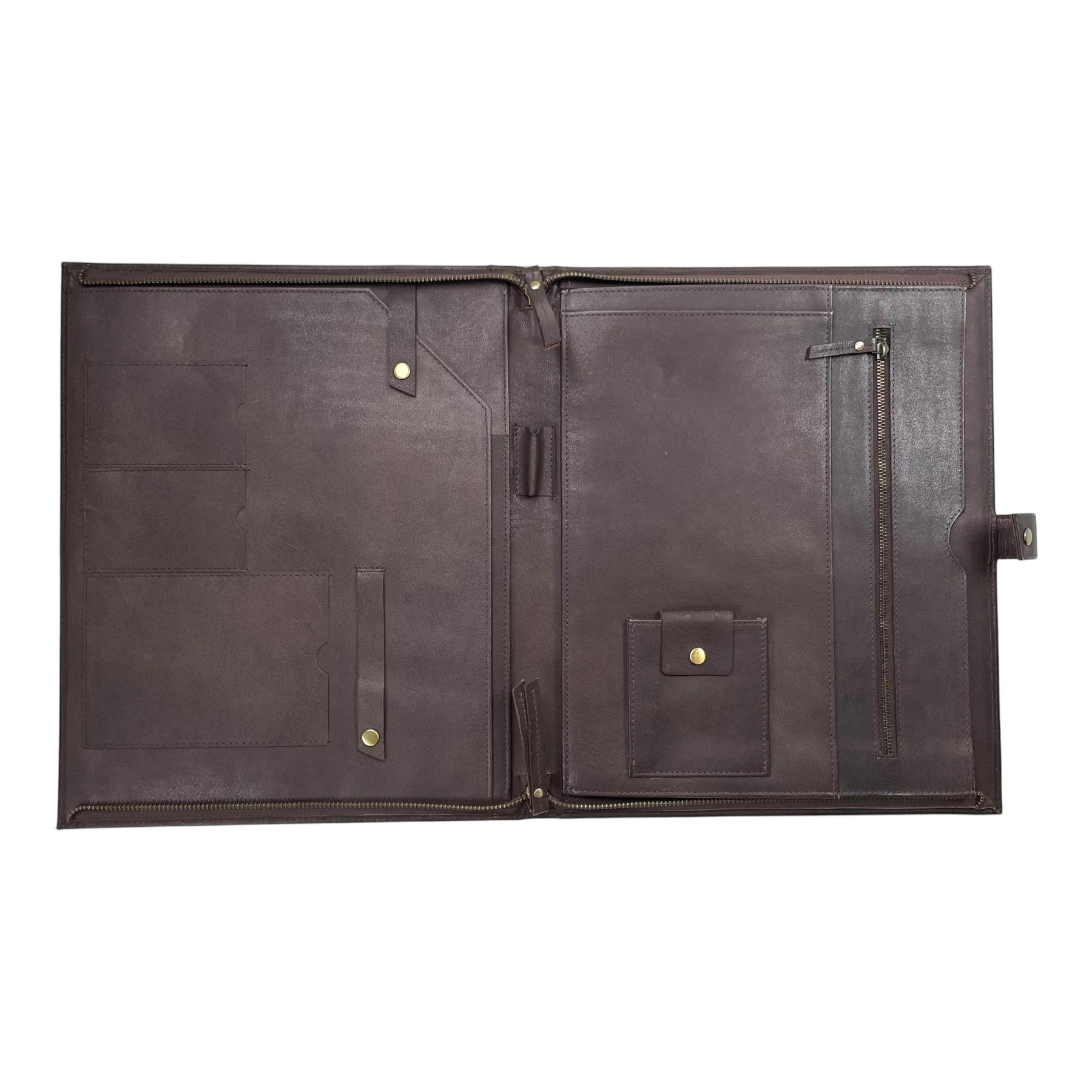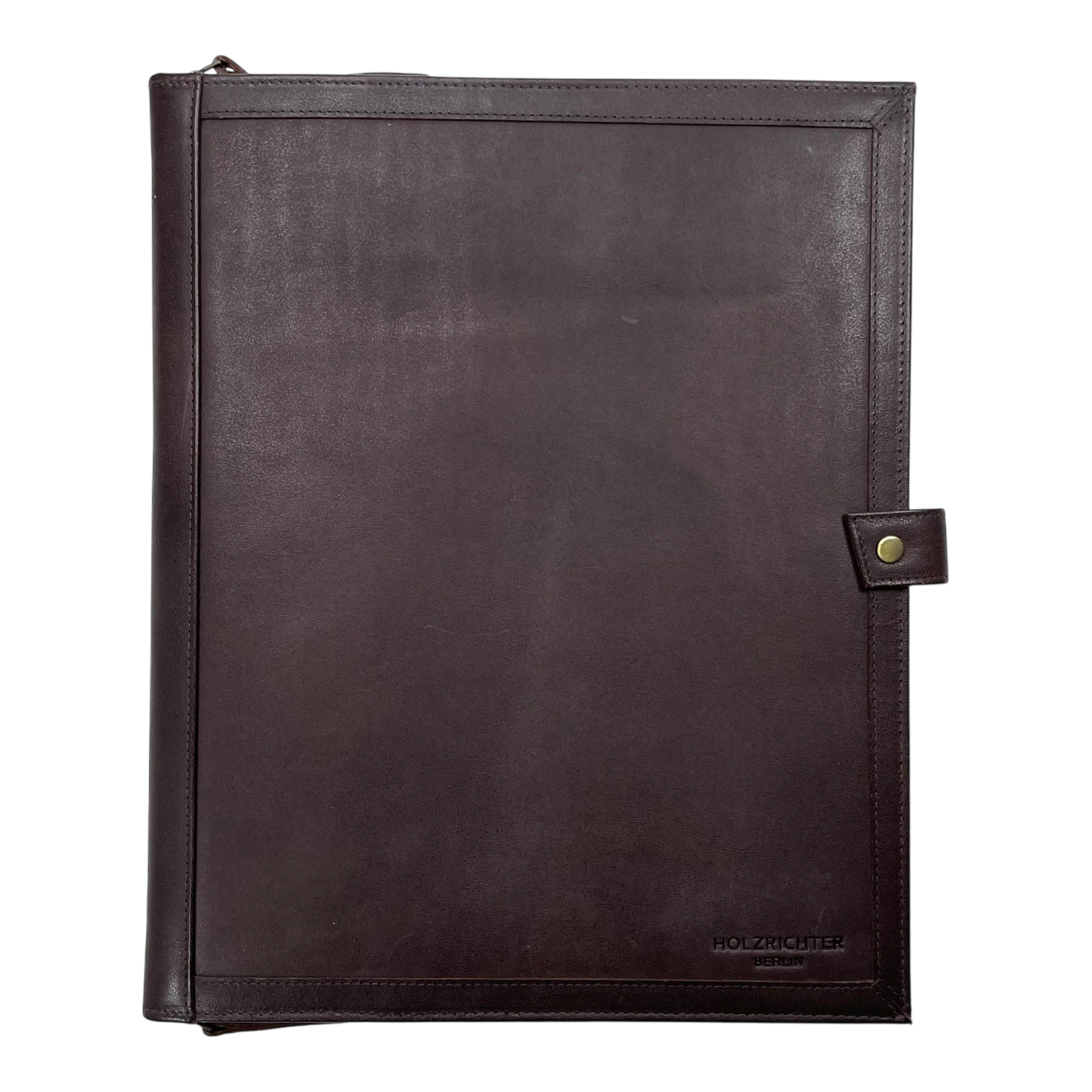 Holzrichter Berlin leather laptop portfolio is a functional and stylish all-in-one solution for modern professionals. Designed for 13" ultrabooks like the MacBook, it opens like a book to reveal a thoughtfully organized interior with dedicated compartments for pens, notepads, documents, business cards, and other daily essentials. A high-quality metal zipper ensures everything stays secure, while the padded cotton-lined interior with leather reinforcements offers reliable protection for your device. Perfect for meetings, travel, or hybrid work