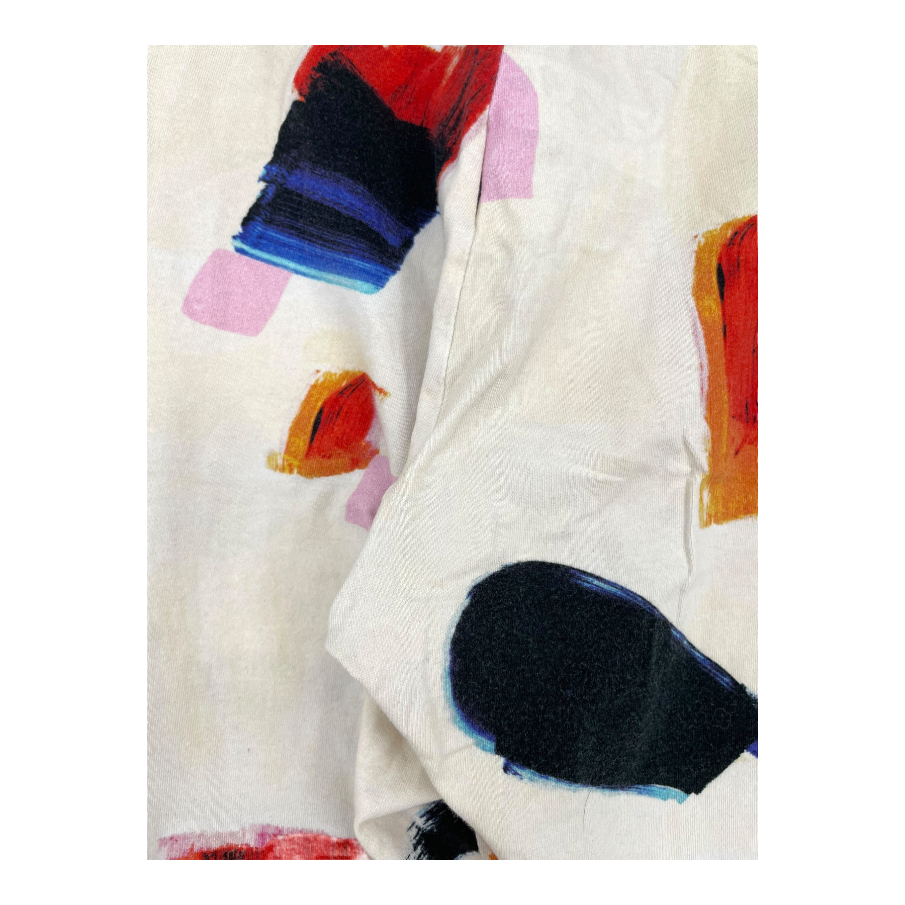 Papu women's leggings in an abstract print. The size label says M, but the sizing runs small and the item most likely fits size S better. The fabric of the item has worn in the wash somewhat, as shown in the picture.