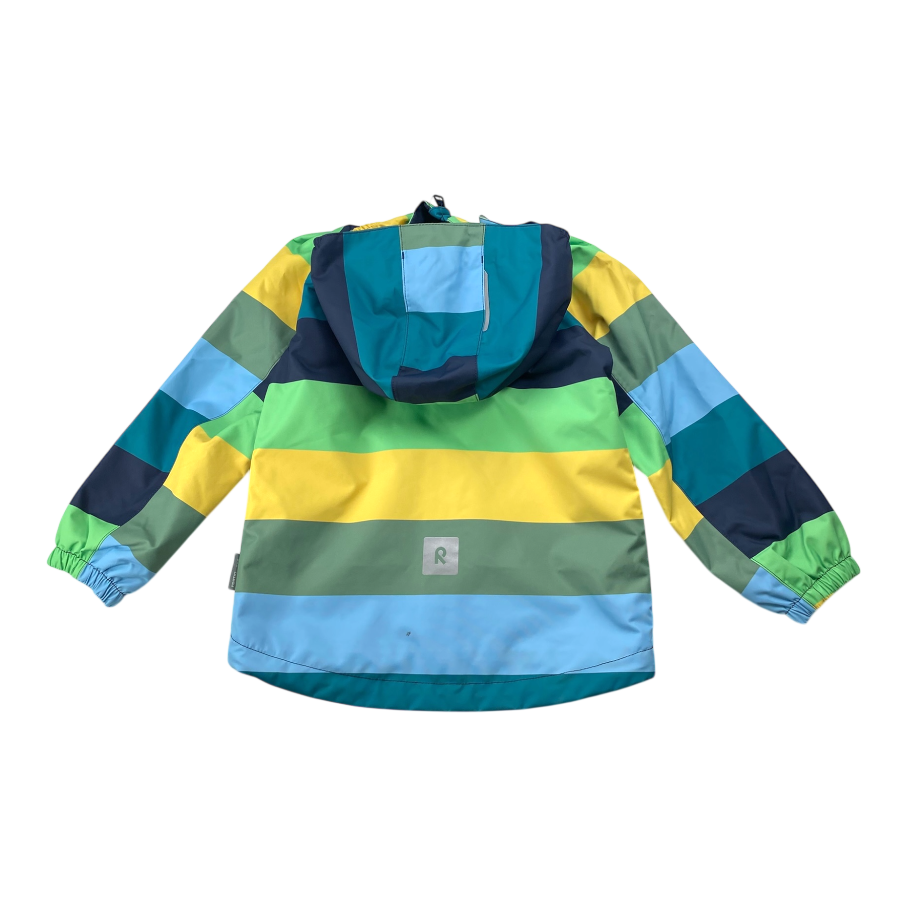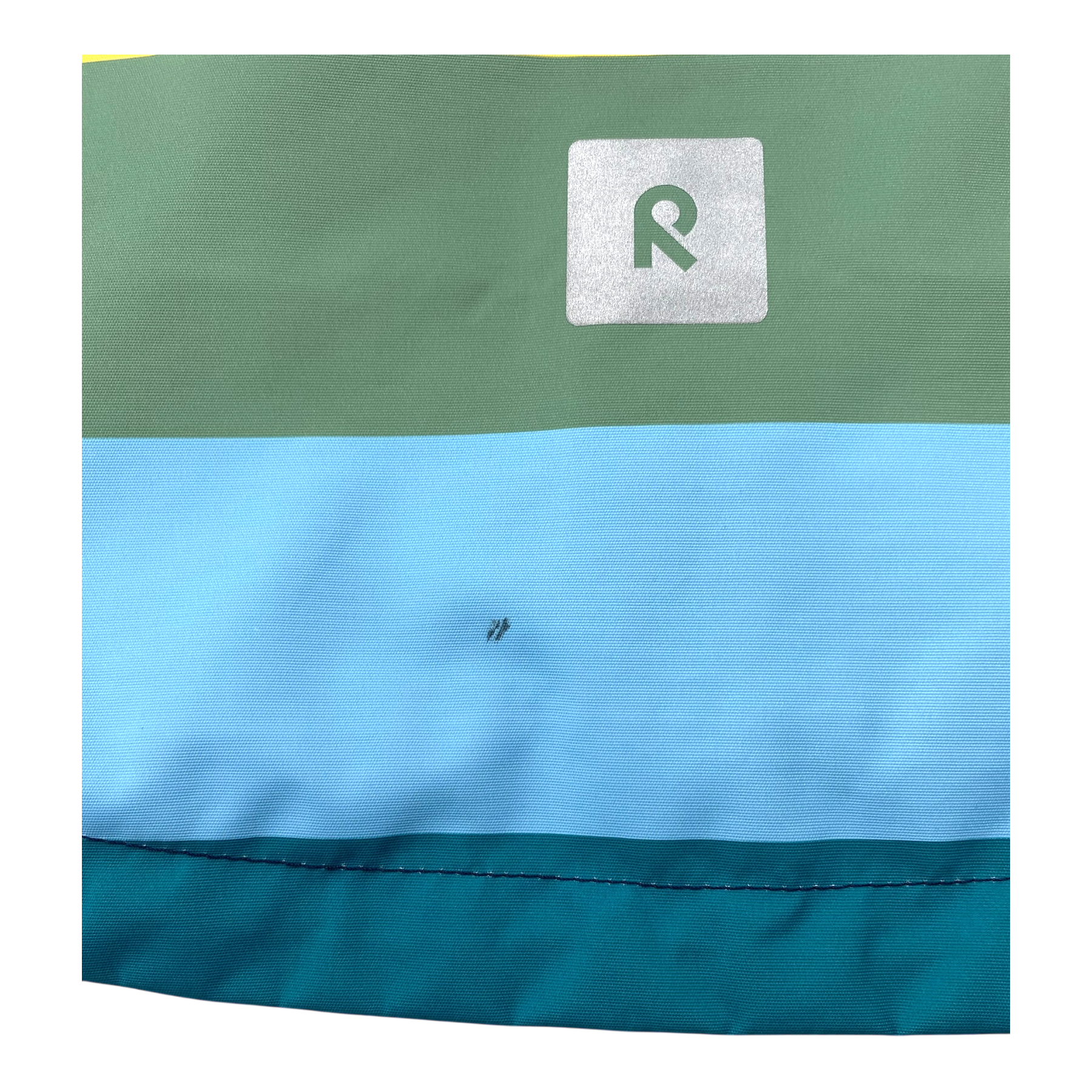 Reimatec Finbo jacket with a detachable hood, two zip pockets on the sides, reflective details, and adjustable elastic at the hem. The material is originally waterproof up to 8,000mm water column, and the seams are sealed. Fluorocarbon-free water and dirt repellent finish BIONIC-FINISH®ECO. This item is a sample and has tags still attached yet it has some stains.