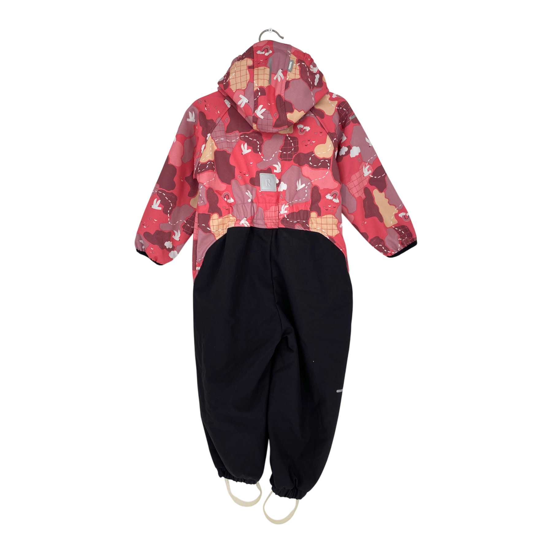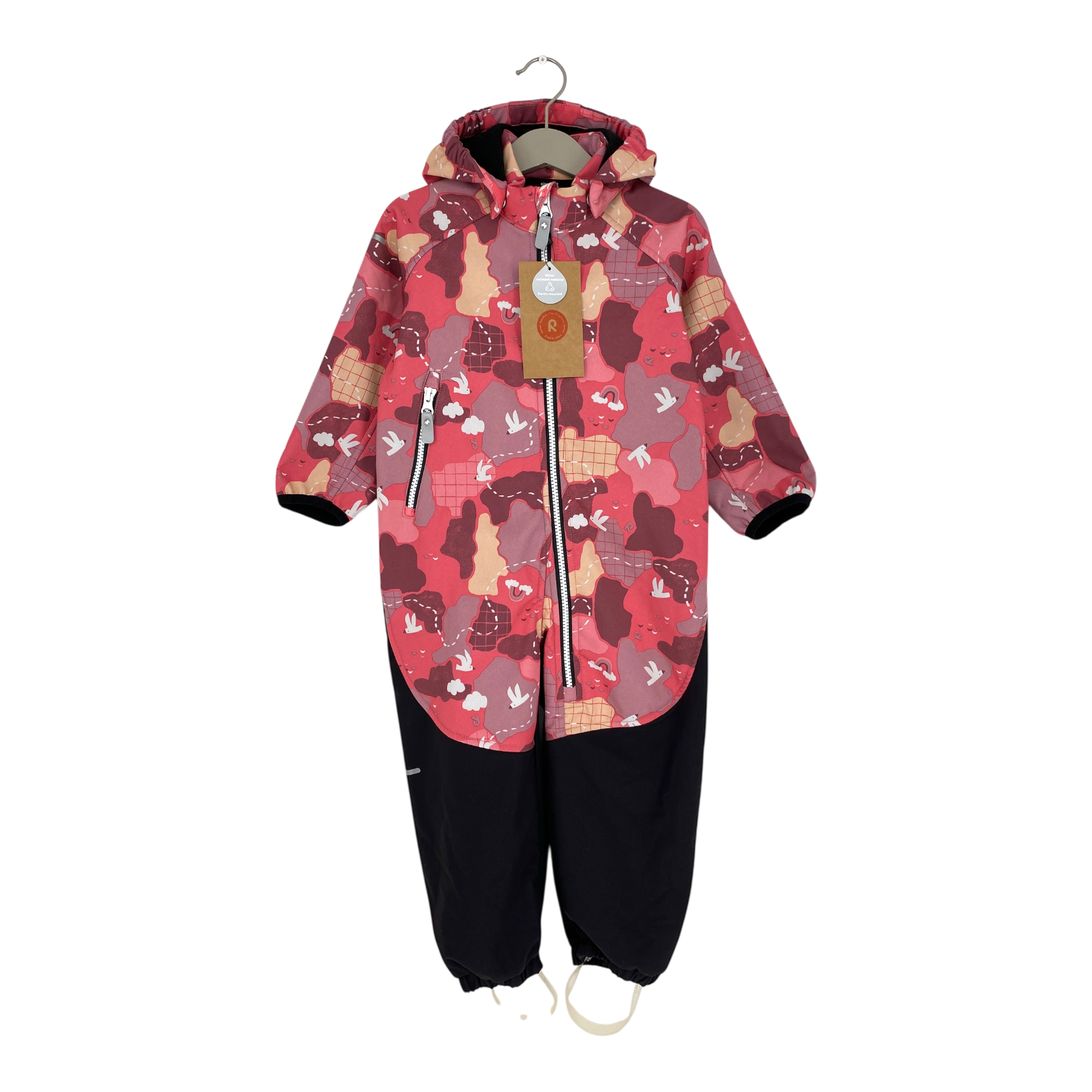 Reima Mjosa softshell midseason overall with detachable hood, one zipper pocket, reflective details, and detachable foot loops in hems. The material is originally waterproof up to 10,000mm water column, and the bottom part is very durable.