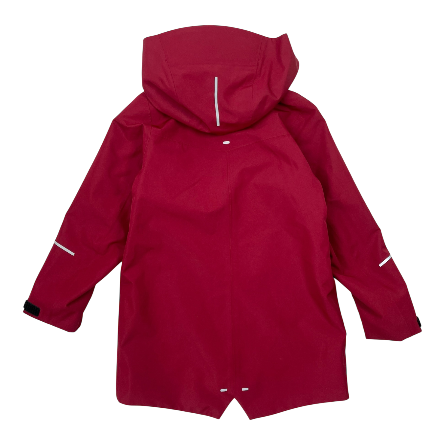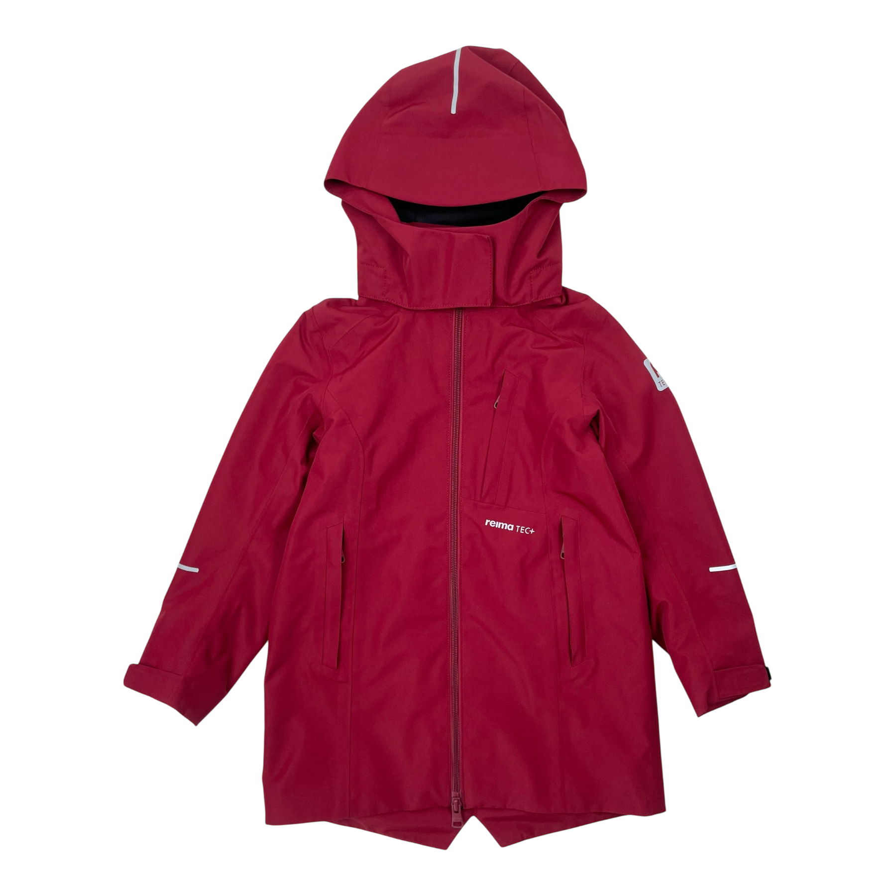 Reima Muutun light shell jacket with detachable hood, zip pockets on sides, reflective details, and one chest pocket. The jacket is made entirely from one material and contains a lot of recycled fiber. The jacket has won the ISPO Award in 2021.