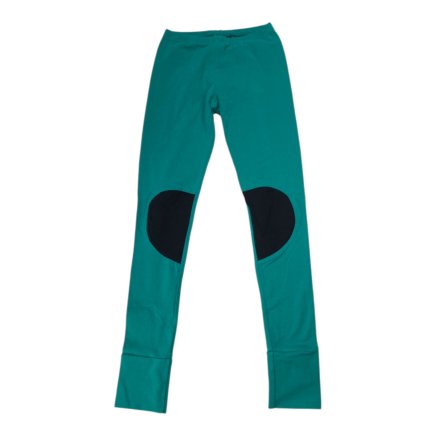 Papu leggings with contrast knee patches. Made from elastic organic cotton that feels comfortable to wear. Foldable leg ends for a longer fit for one child.