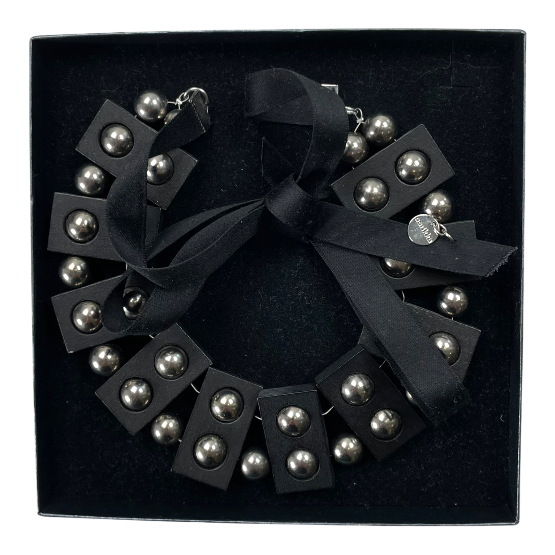 Aarikka Fenix necklace with ribbon closure and interwoven metal balls and wood blocks. Comes in an Aarikka dust bag.
