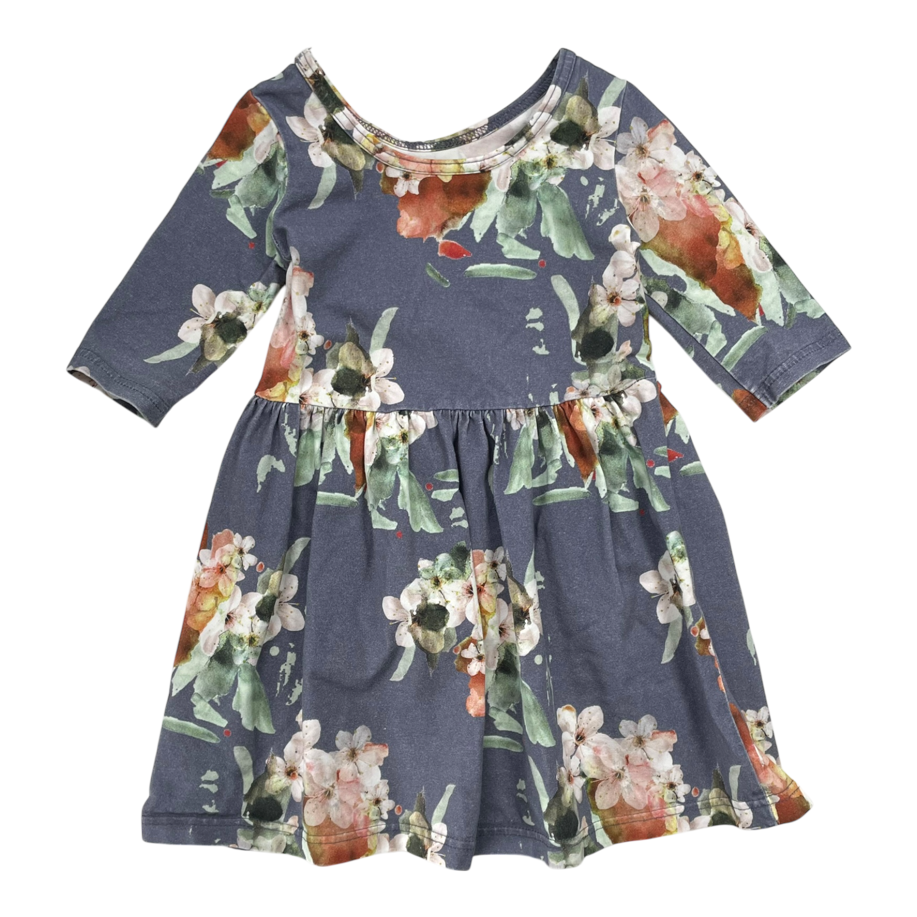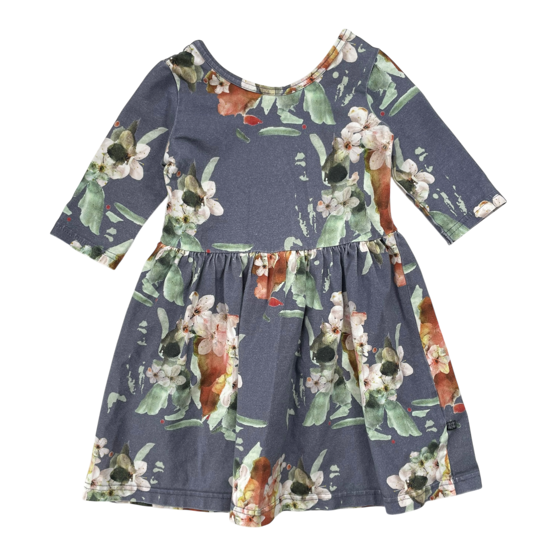 Kaiko tricot dress in blue blossom print with 3/4 sleeves.