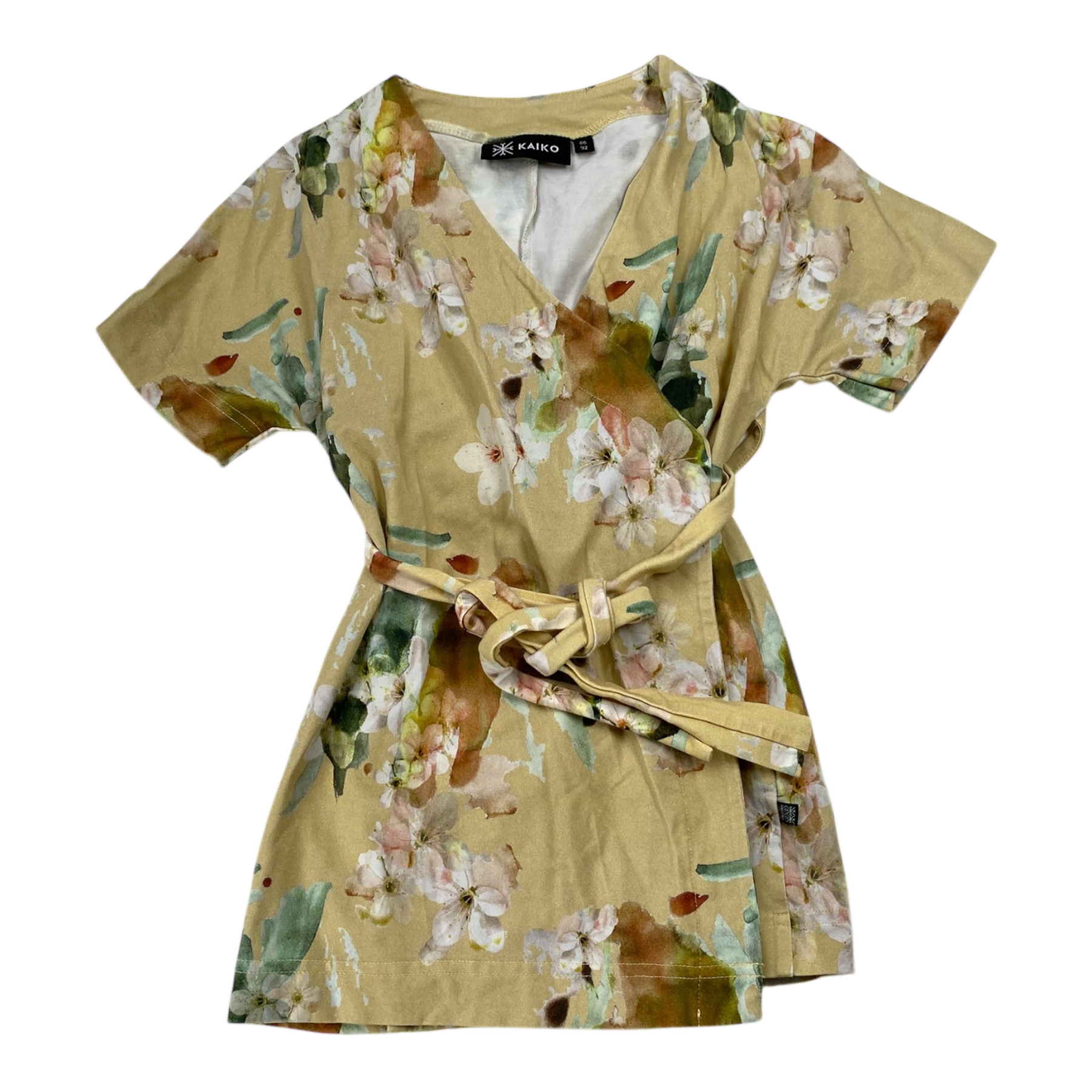 Kaiko kimono style wrap dress with a belt in yellow blossom print.