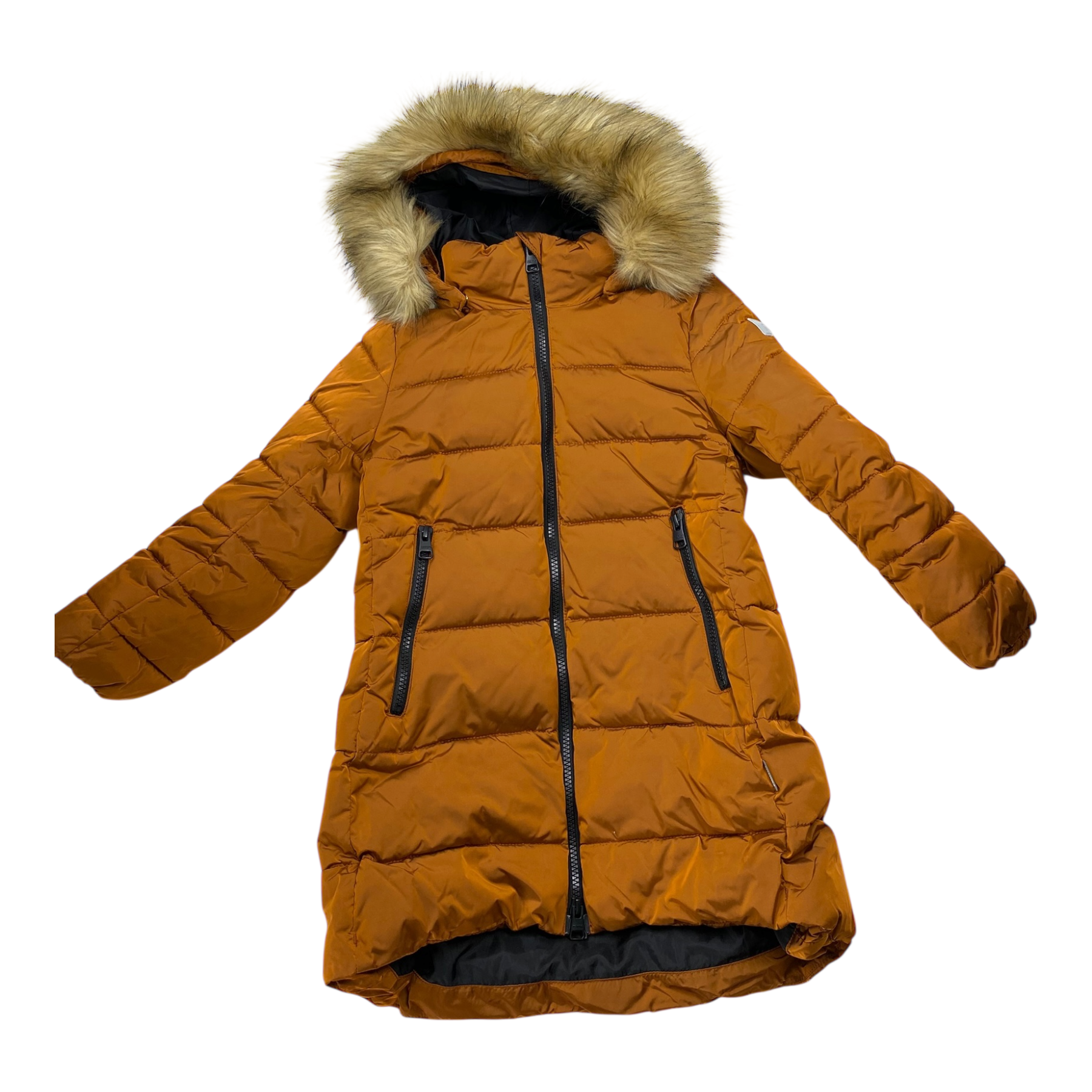 Reima Lunta is a winter jacket with a removable hood and fur lining, two pockets in the side and a zipper closure.