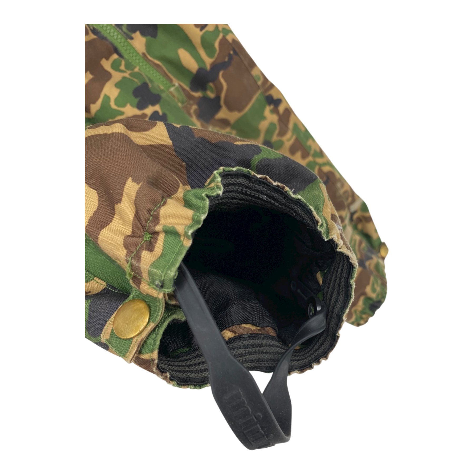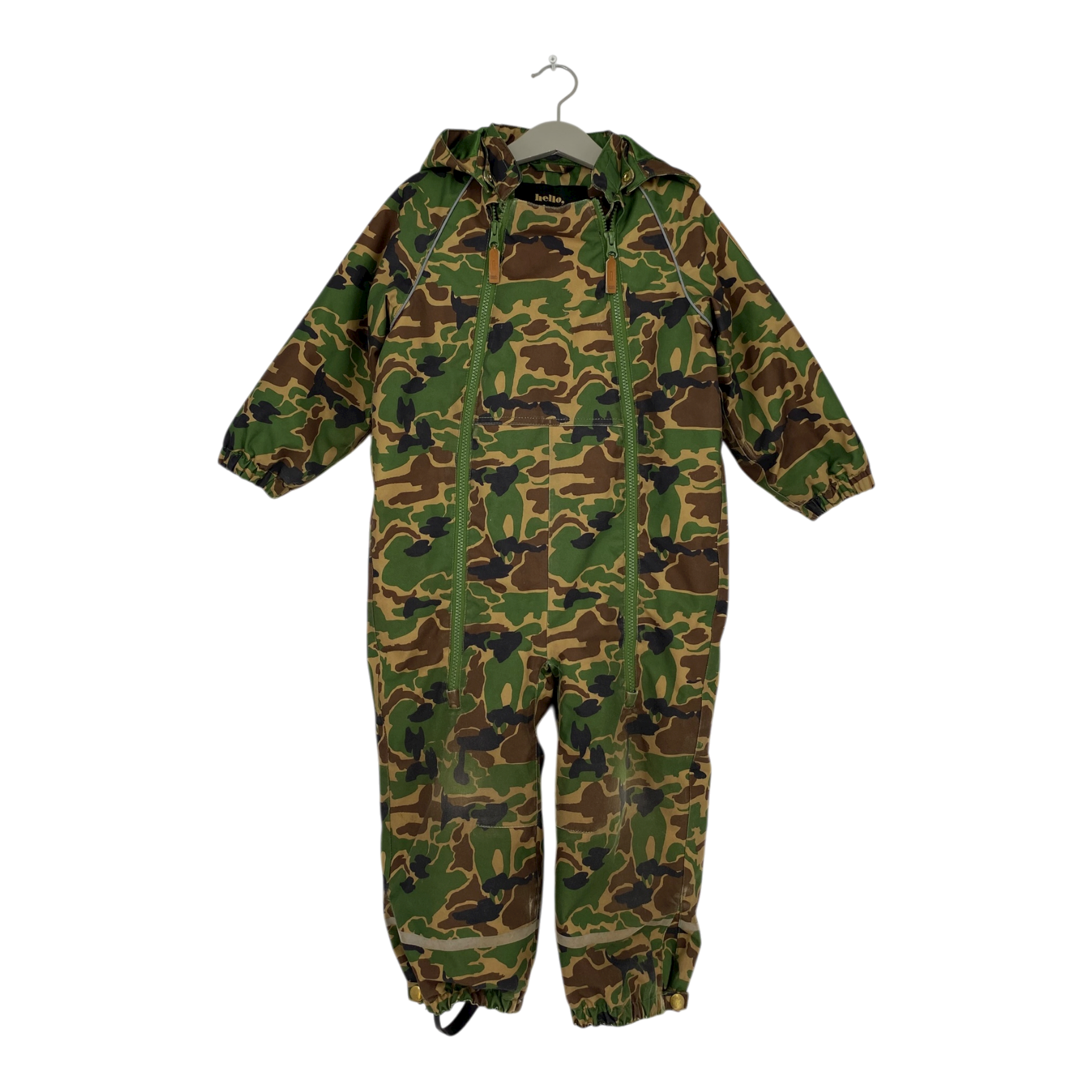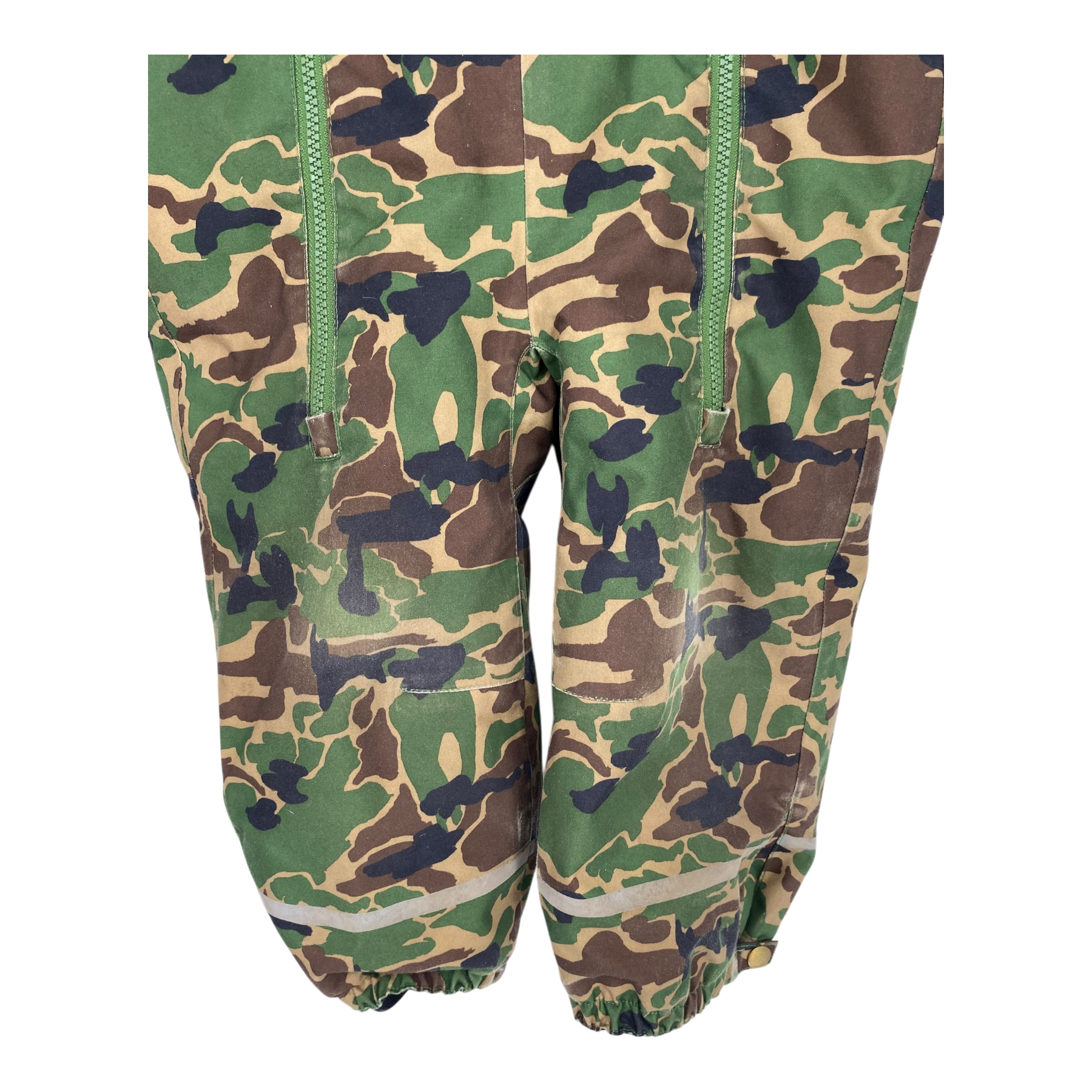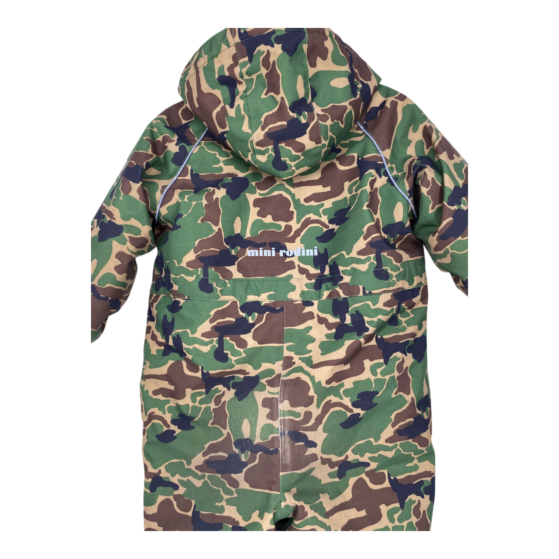 Mini Rodini padded winter overall with a detachable hood and multiple reflectors. Two zippers going down the front. The other foot strap is missing, the knee and back areas have some visible wear to them.