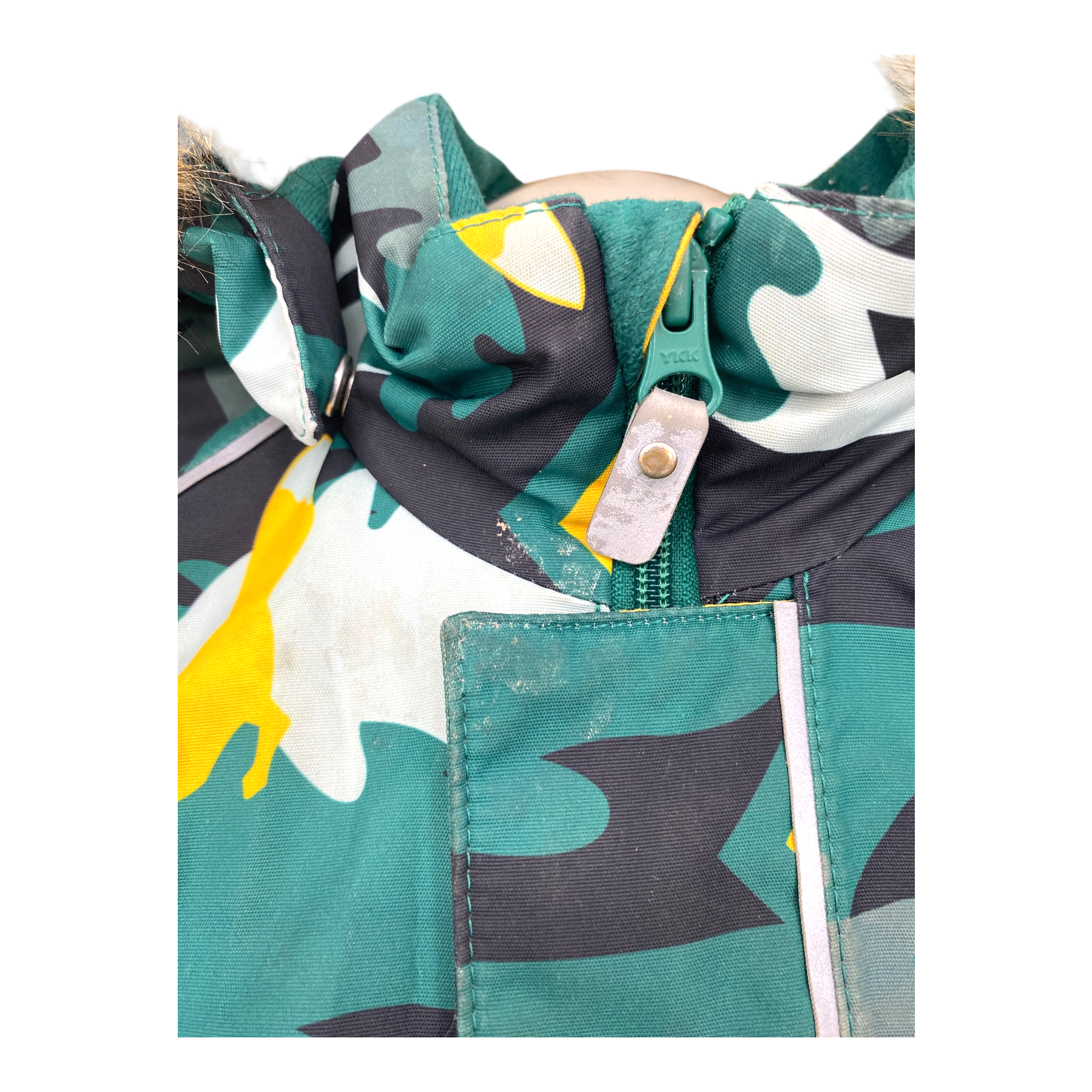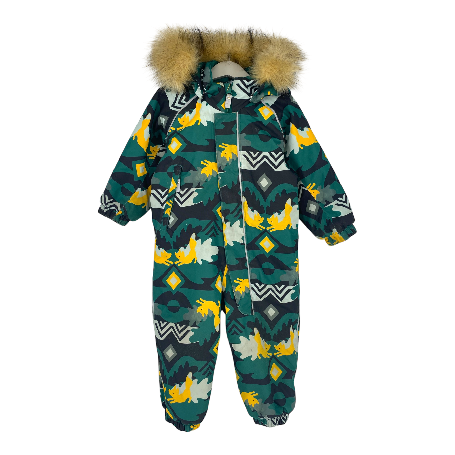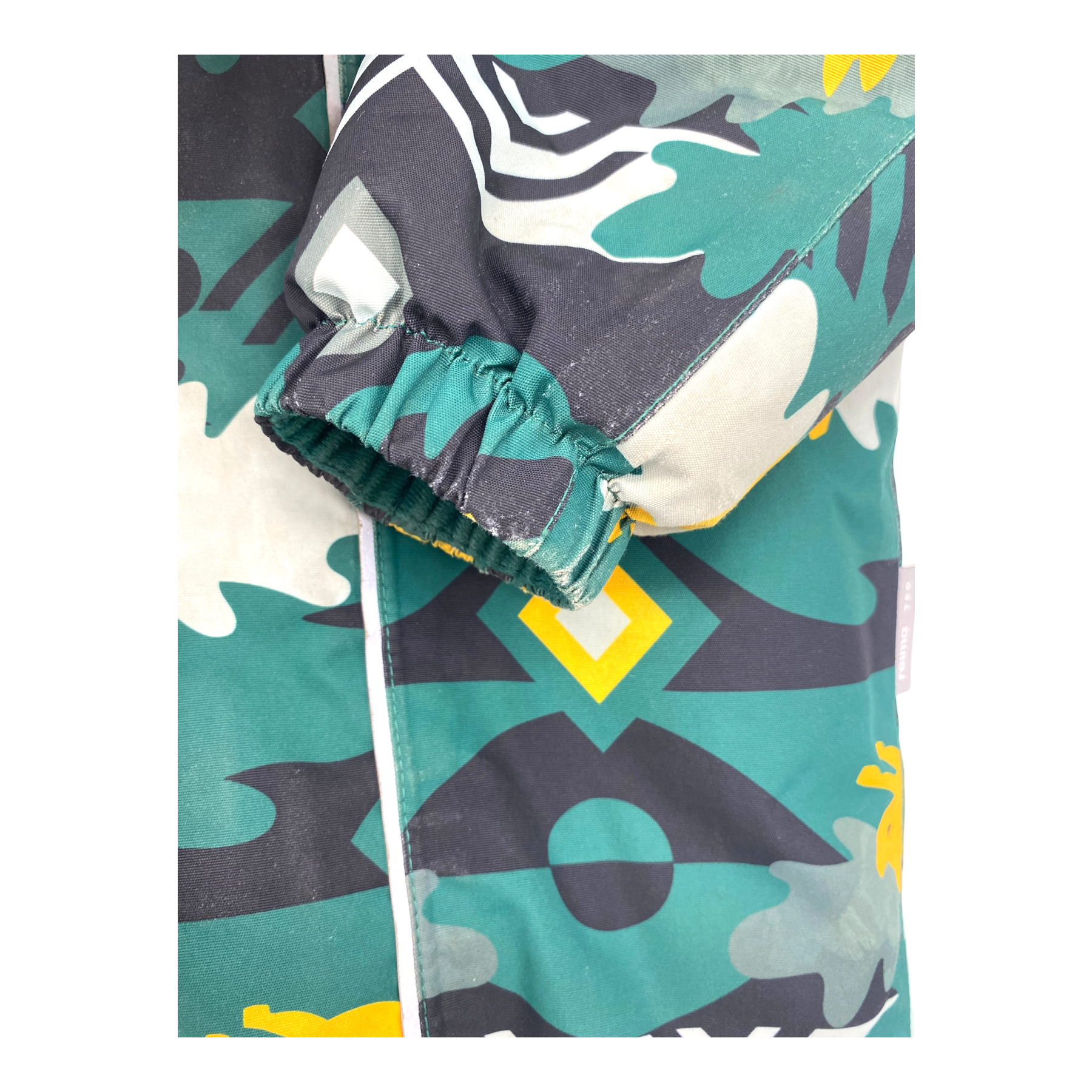 Reima Lappi overall with detachable and adjustable hood, two front pockets, and durable silicone foot loops keep the leg ends in place, protecting ankles from moisture and the cold. The material is originally waterproof up to 10,000mm water column, and the seams are sealed. Jacket is also wind- and dirt repellent, so it's easy to take care of. The seat is insulated to keep bottoms warm and dry during cold-weather adventures.