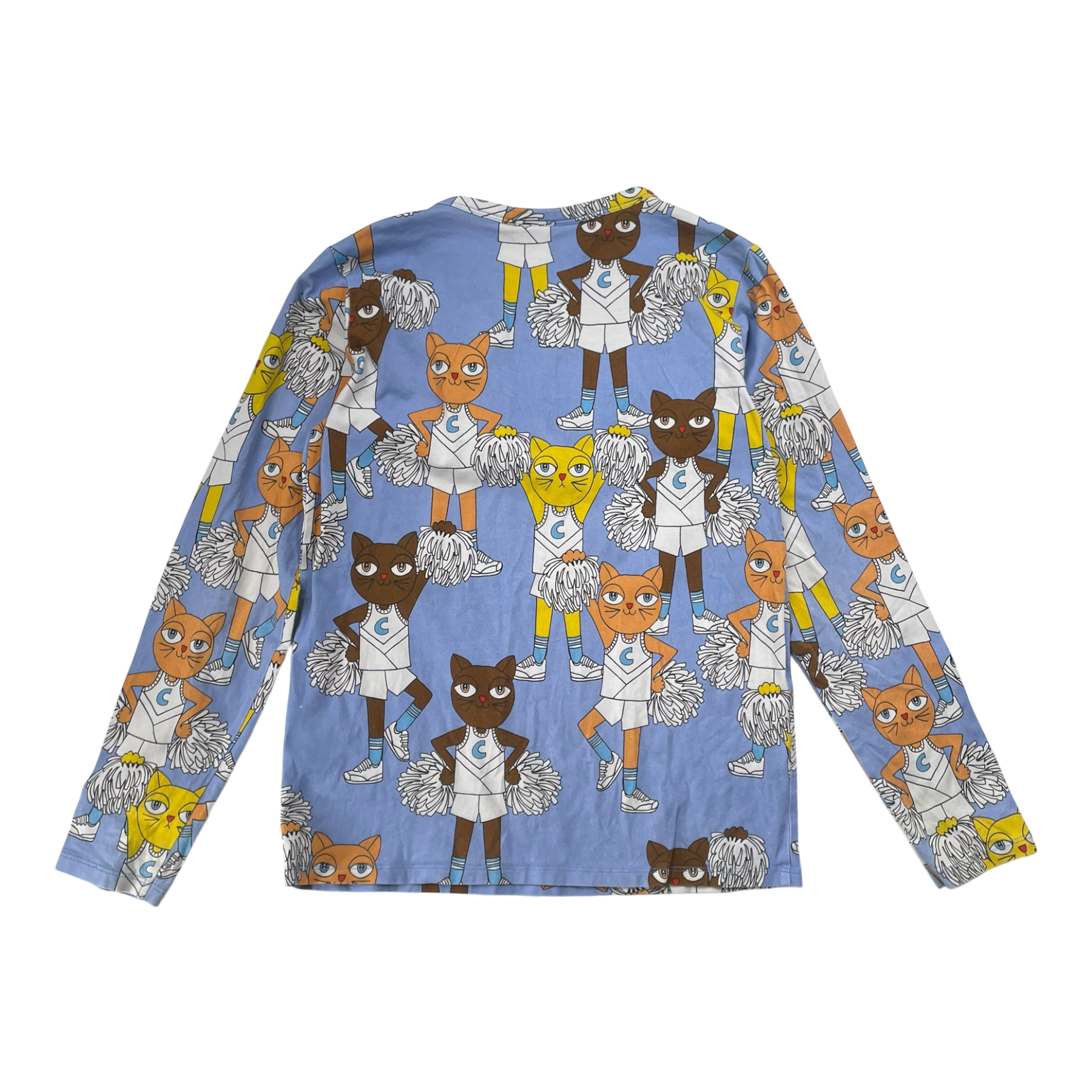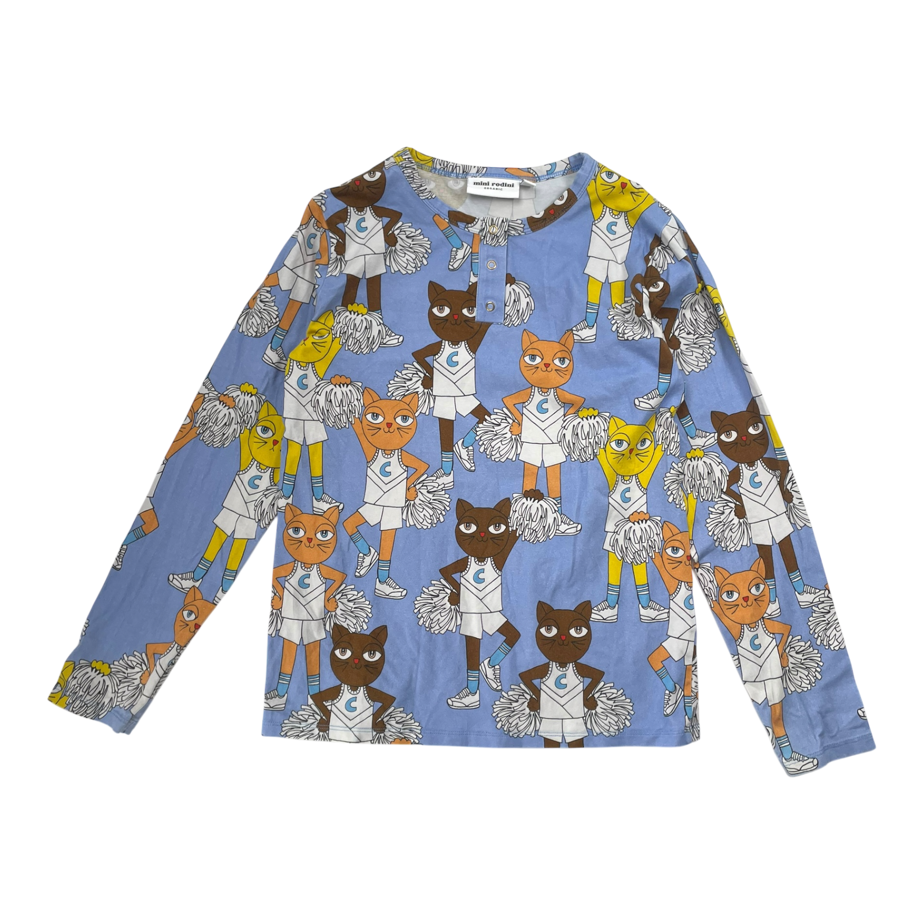 Mini Rodini long sleeve shirt in cat print with snap buttons in the front.