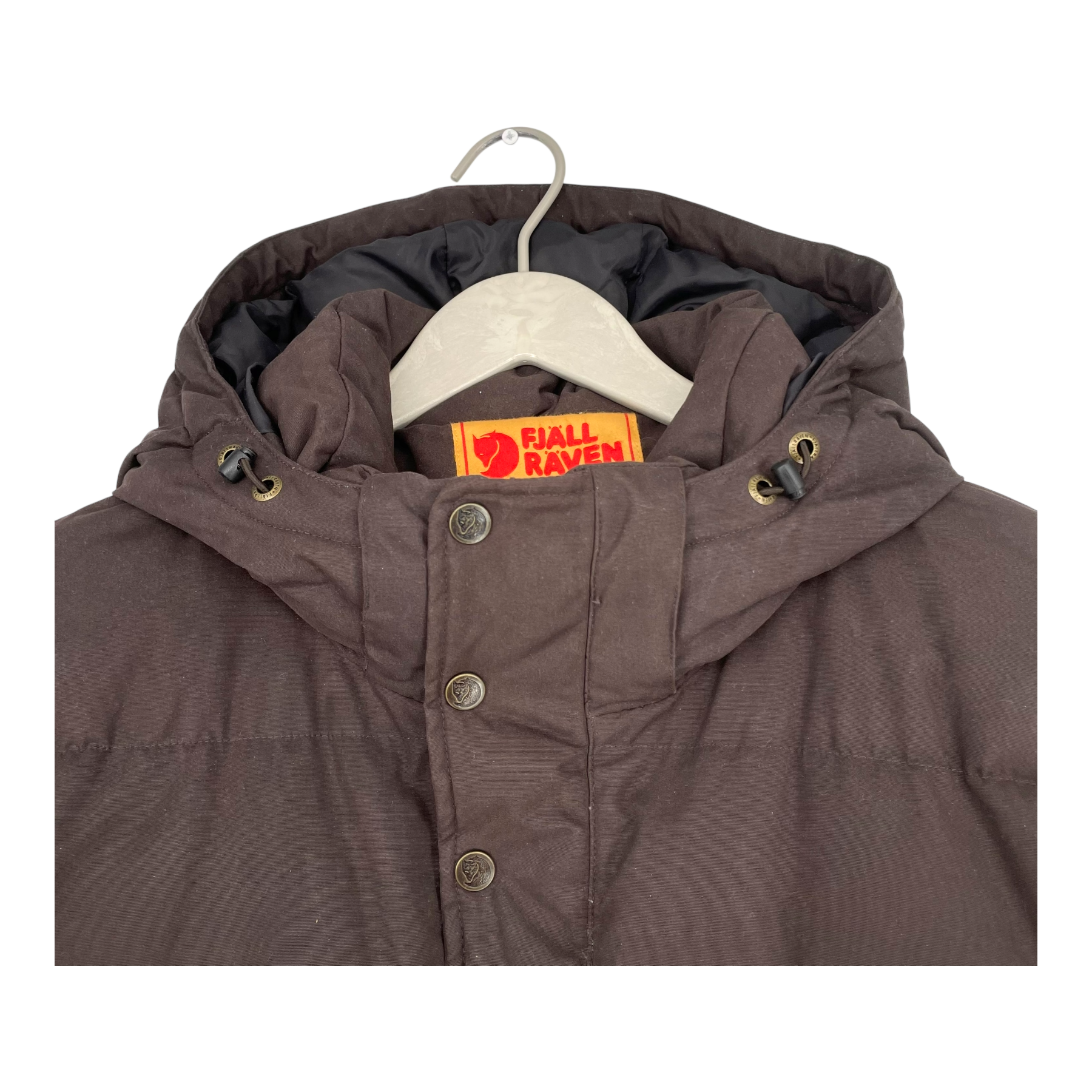 Fjällräven Övik down jacket in brown. Warm and durable down jacket with a double slider fastening zipper closure. A classic shorter model made out of hardwearing G-1000 material. Two large pocket with snap button closure and an adjustable elastic drawstring on the hem and the hood. Seems more like a L.