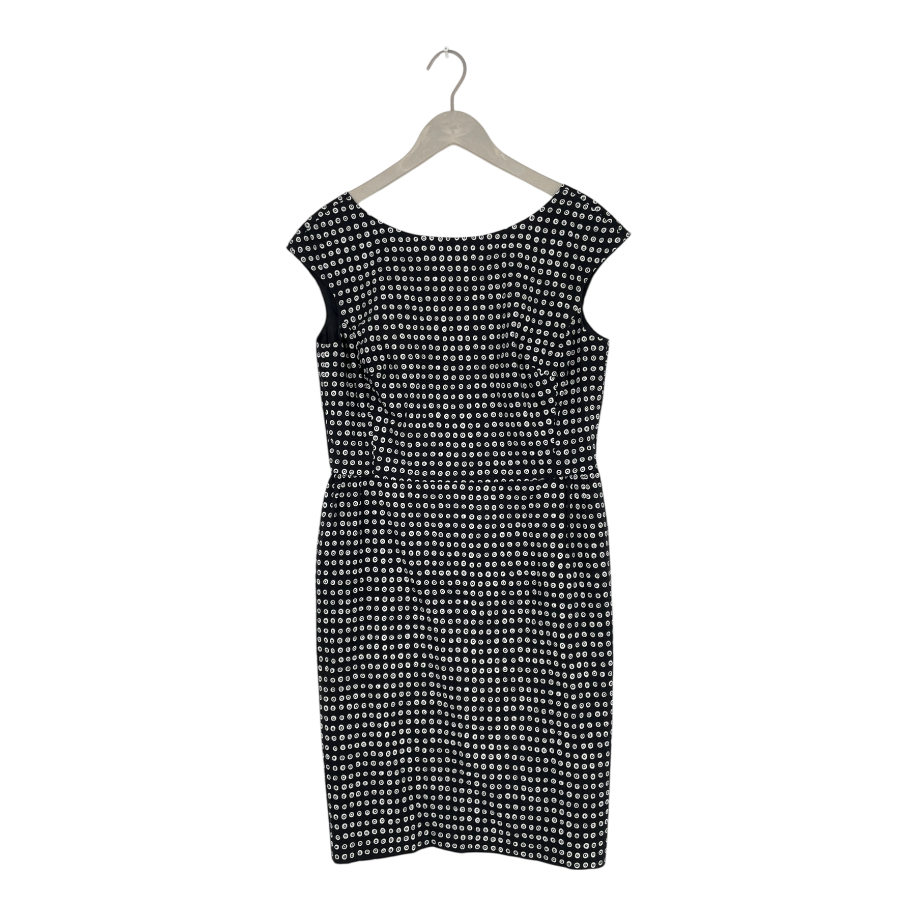 Marimekko sleeveless pencil dress with a round neckline and drop back detail, hidden zipper on the back, inner lining and darts on the bust. No fabric belt.