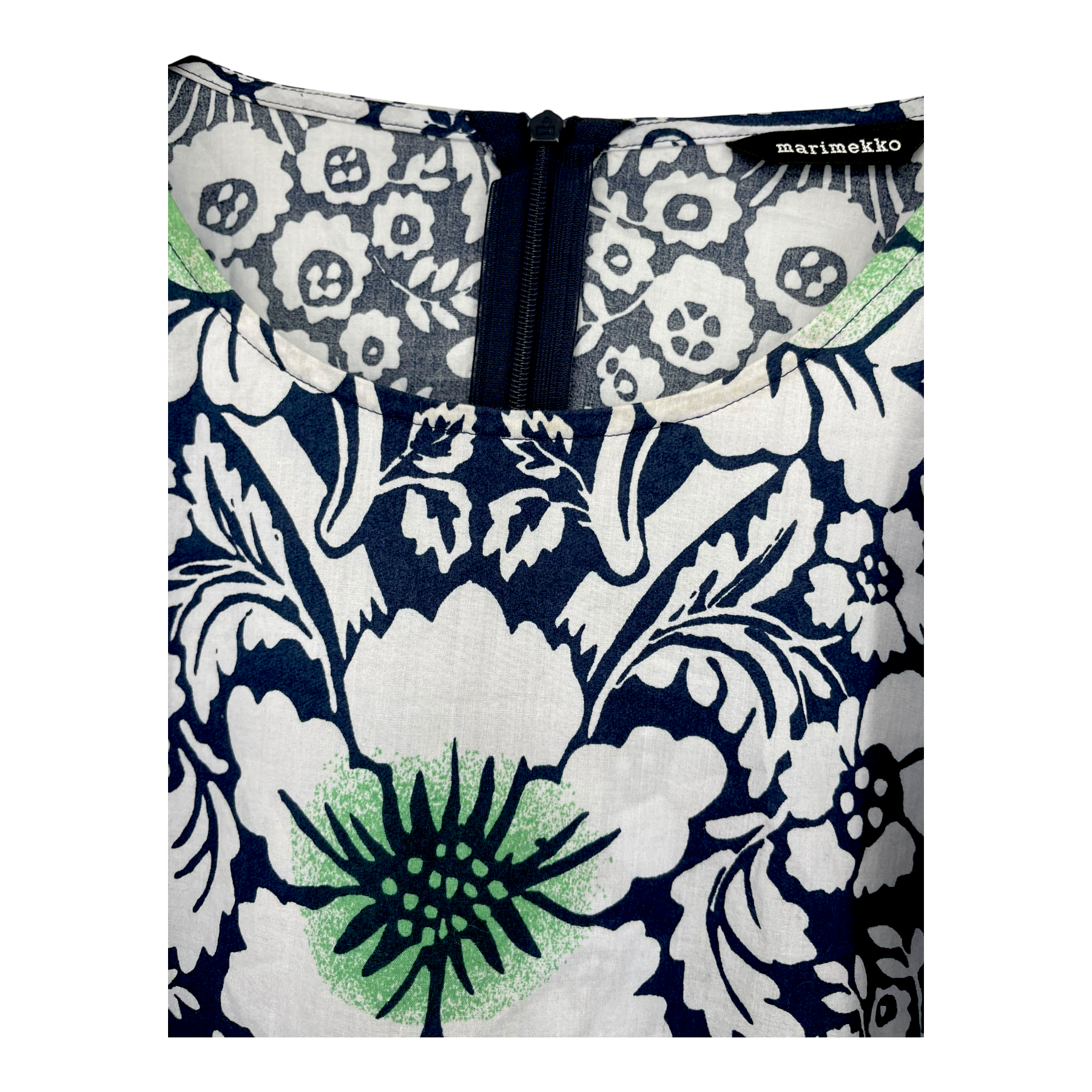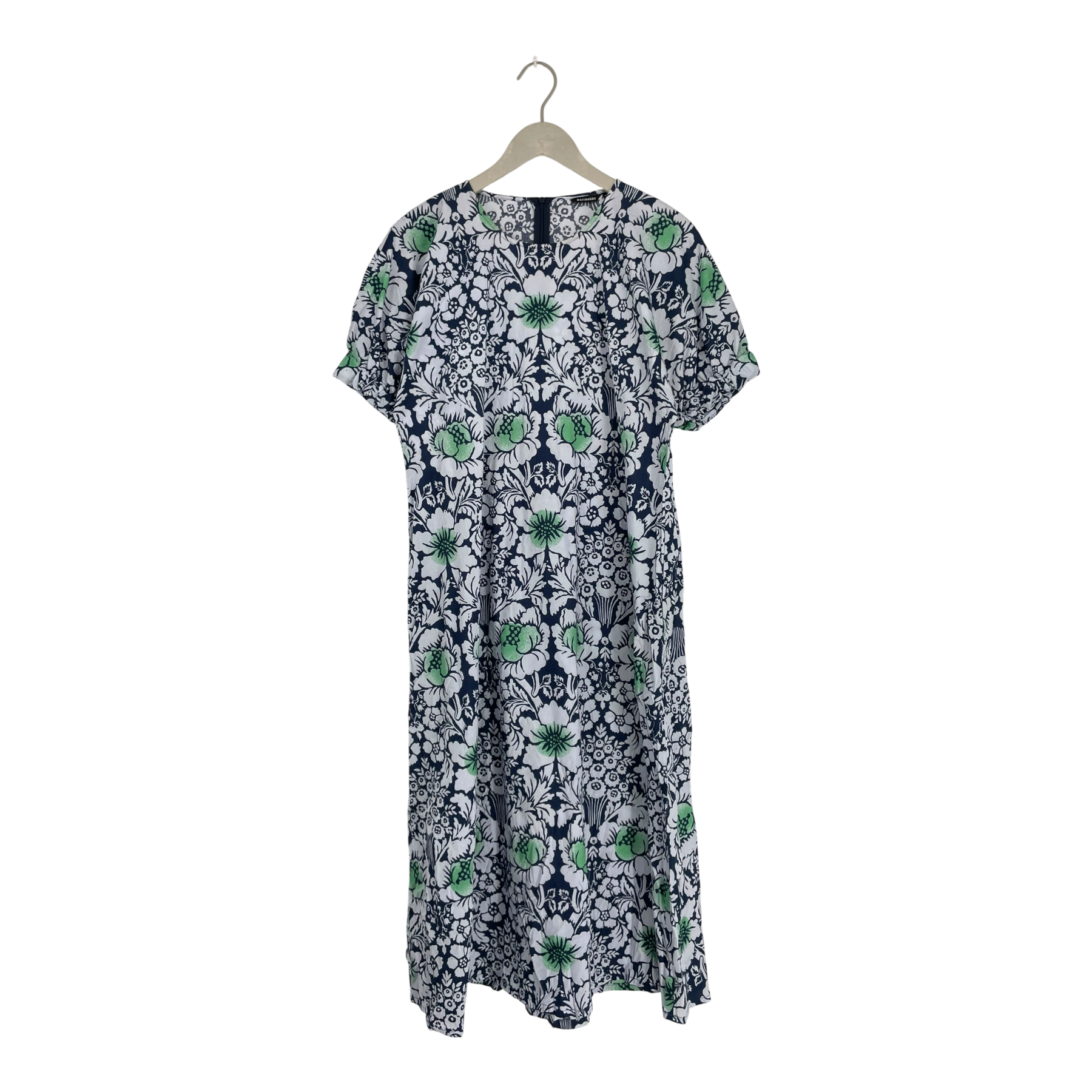 Marimekko maxi Veroinen dress in the intricate Juhannus print. The Veroinen dress has short sleeves with elastics, round neckline, side seam pockets and a long hidden zipper on the back for ease of dressing. The item has some very light discoloration on the collar, barely visible.