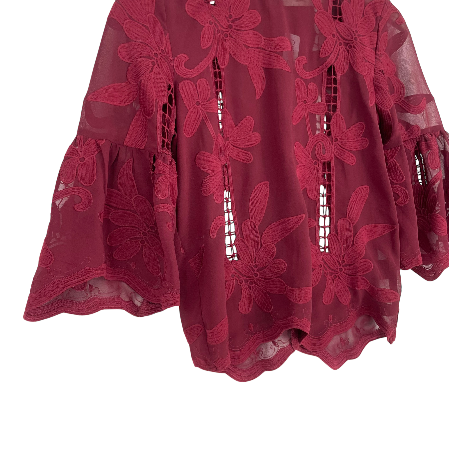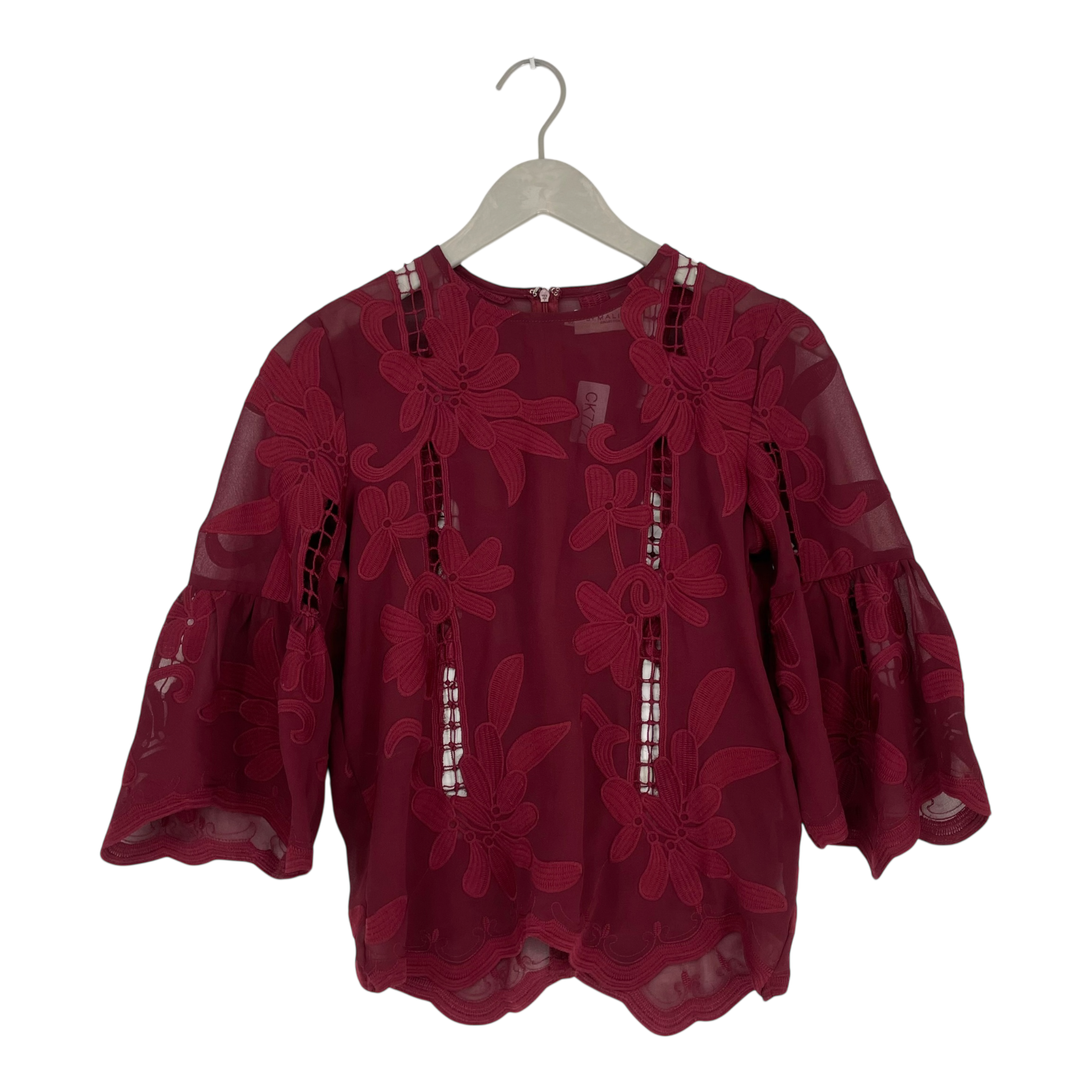 By Malina Melina chiffon blouse shirt with 3/4 bell style sleeves, zipper on the back and embroidery flower details.
