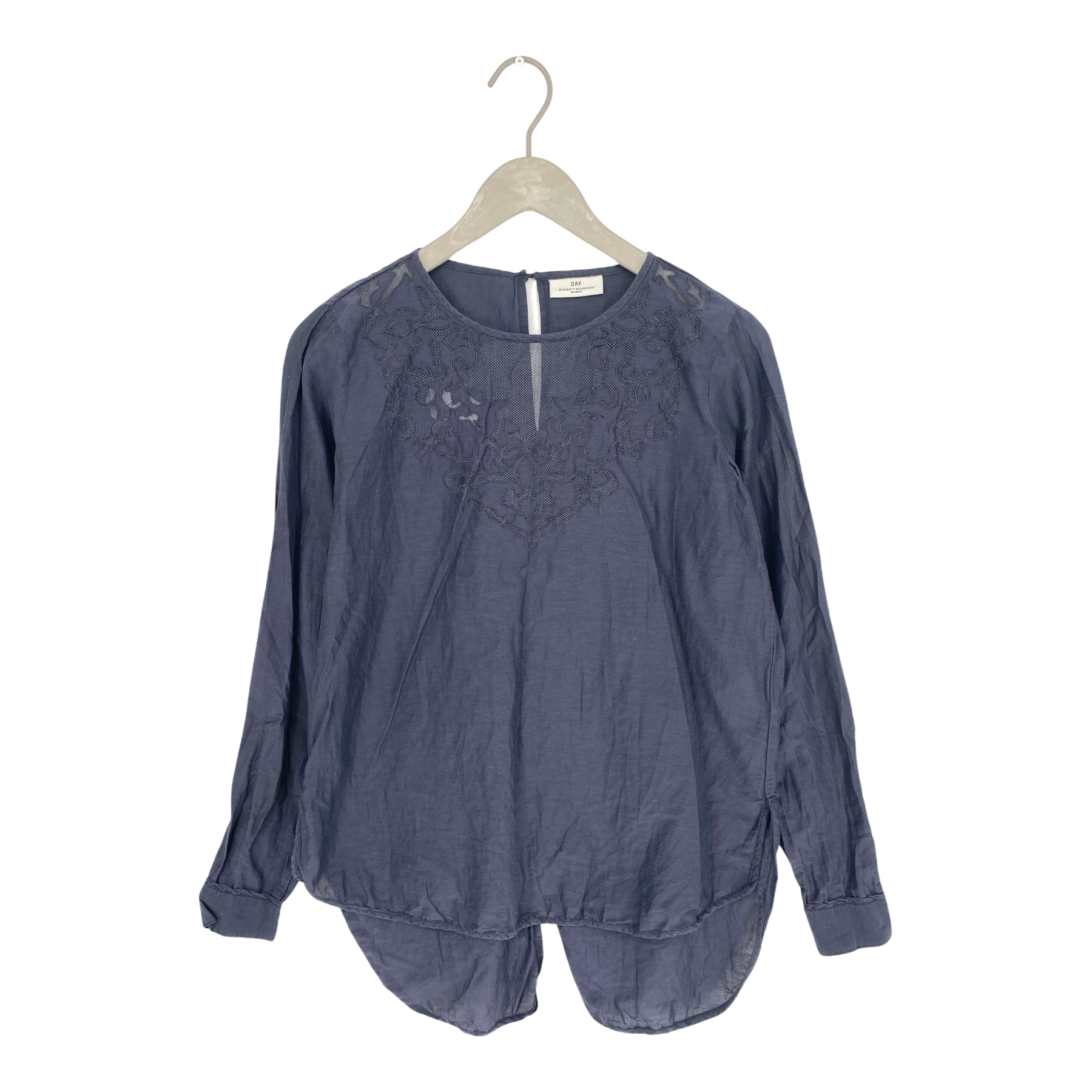DAY Birger et Mikkelsen blouse with lace detail on the front. The shirt has long sleeves and it is longer from the back side. Round hem with slits on sides and center back.