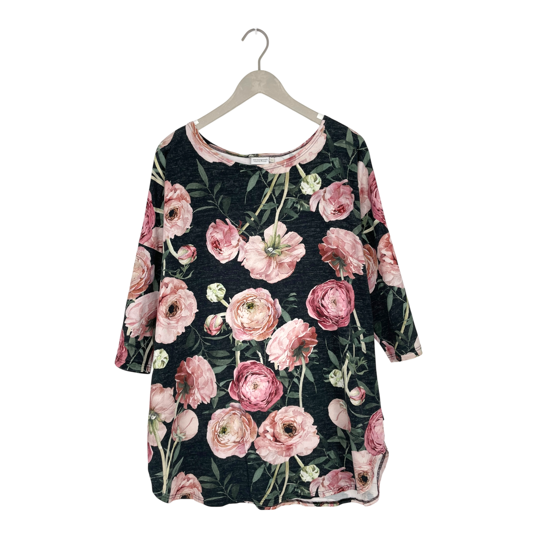 Versonpuoti long-sleeved shirt in flower print. Shirt is slightly longer, it has rounded hem and a boat neck.