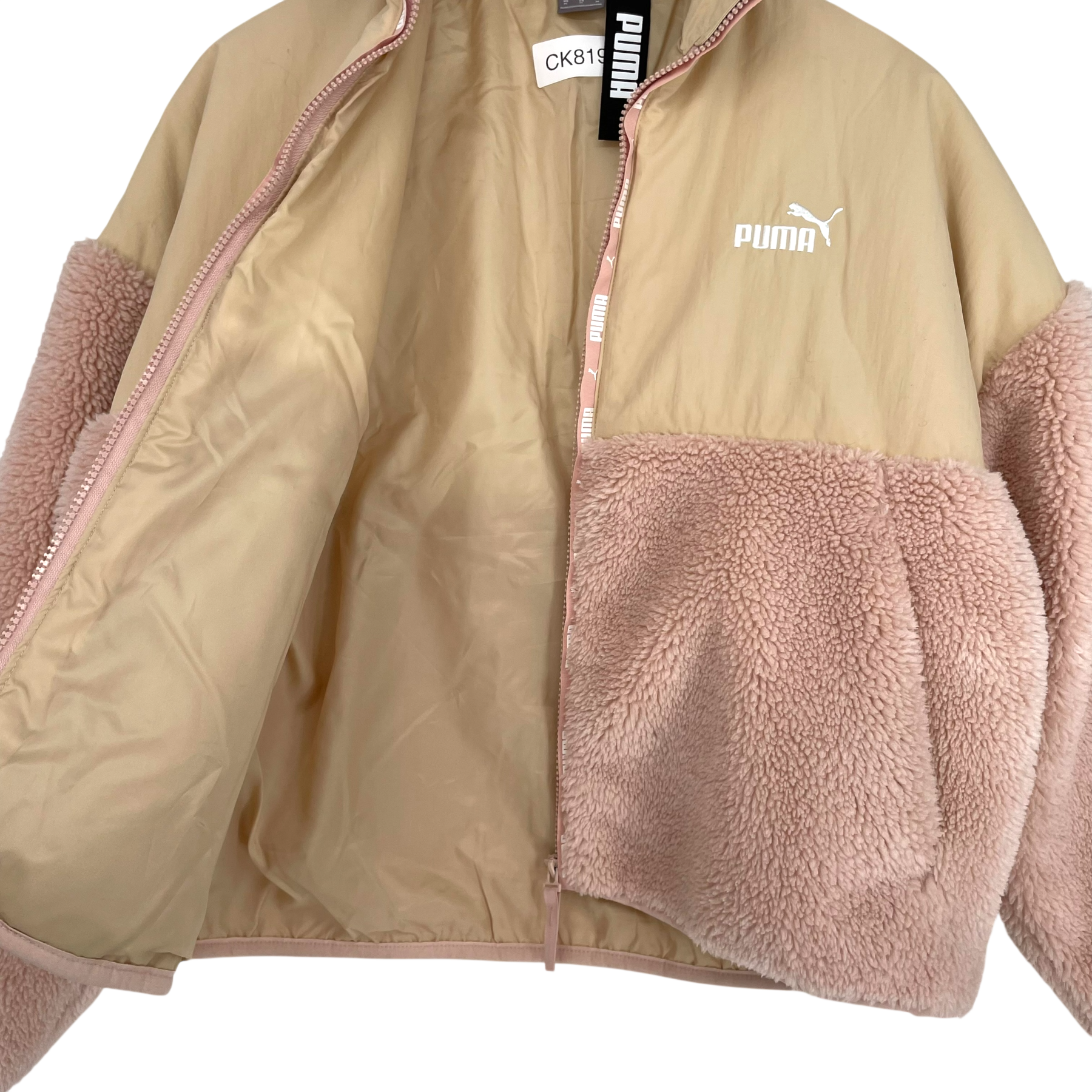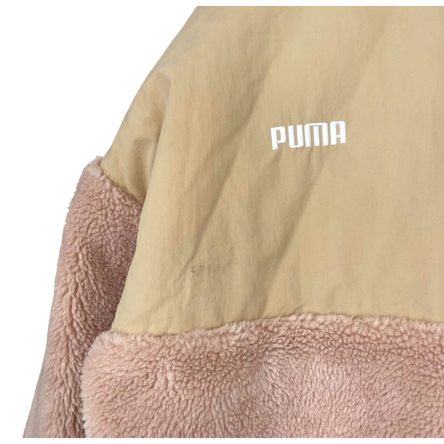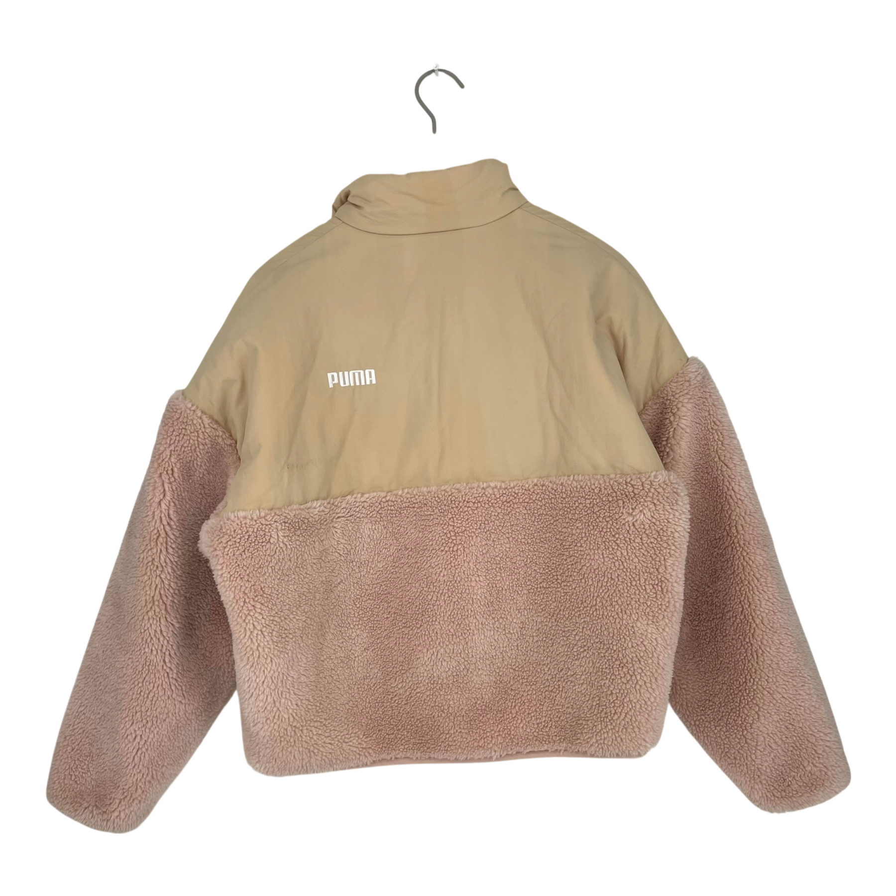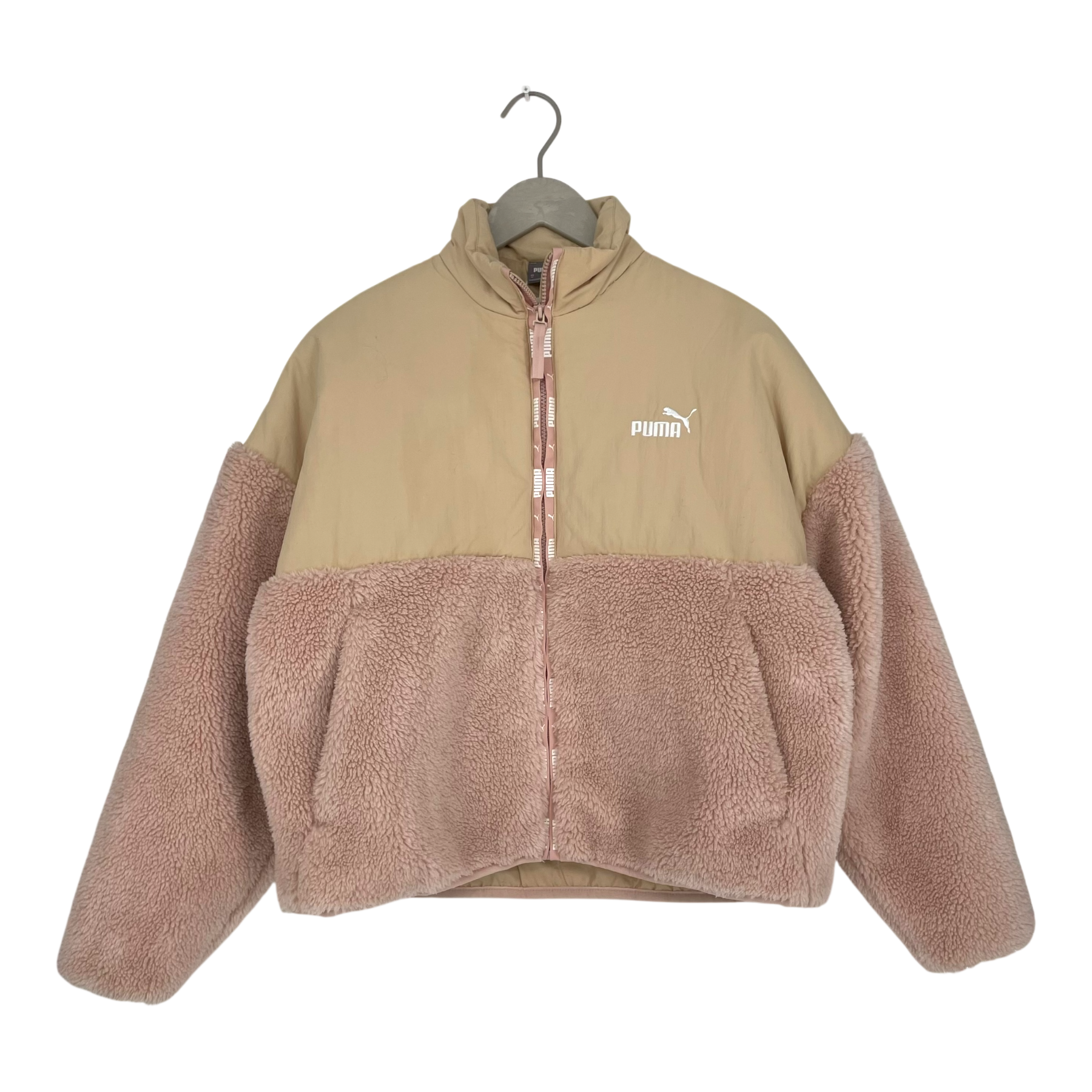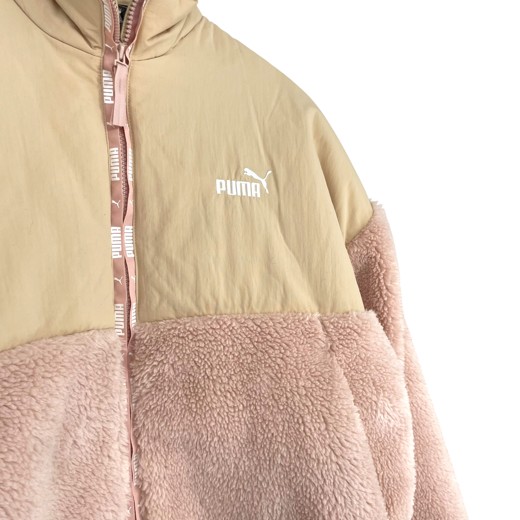 Puma women's Sherpa jacket in old rose and beige color. There is a zipper closure in the front and pockets on the sides.