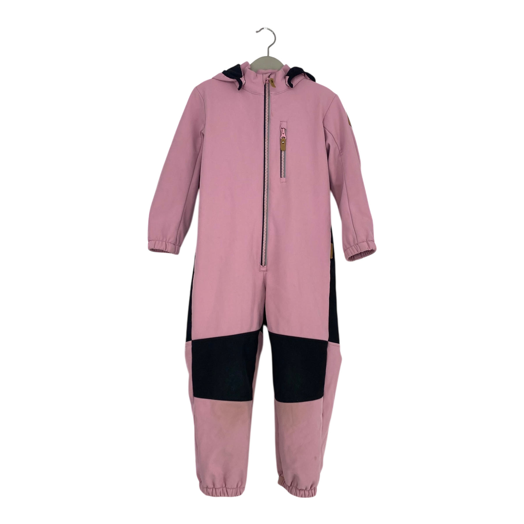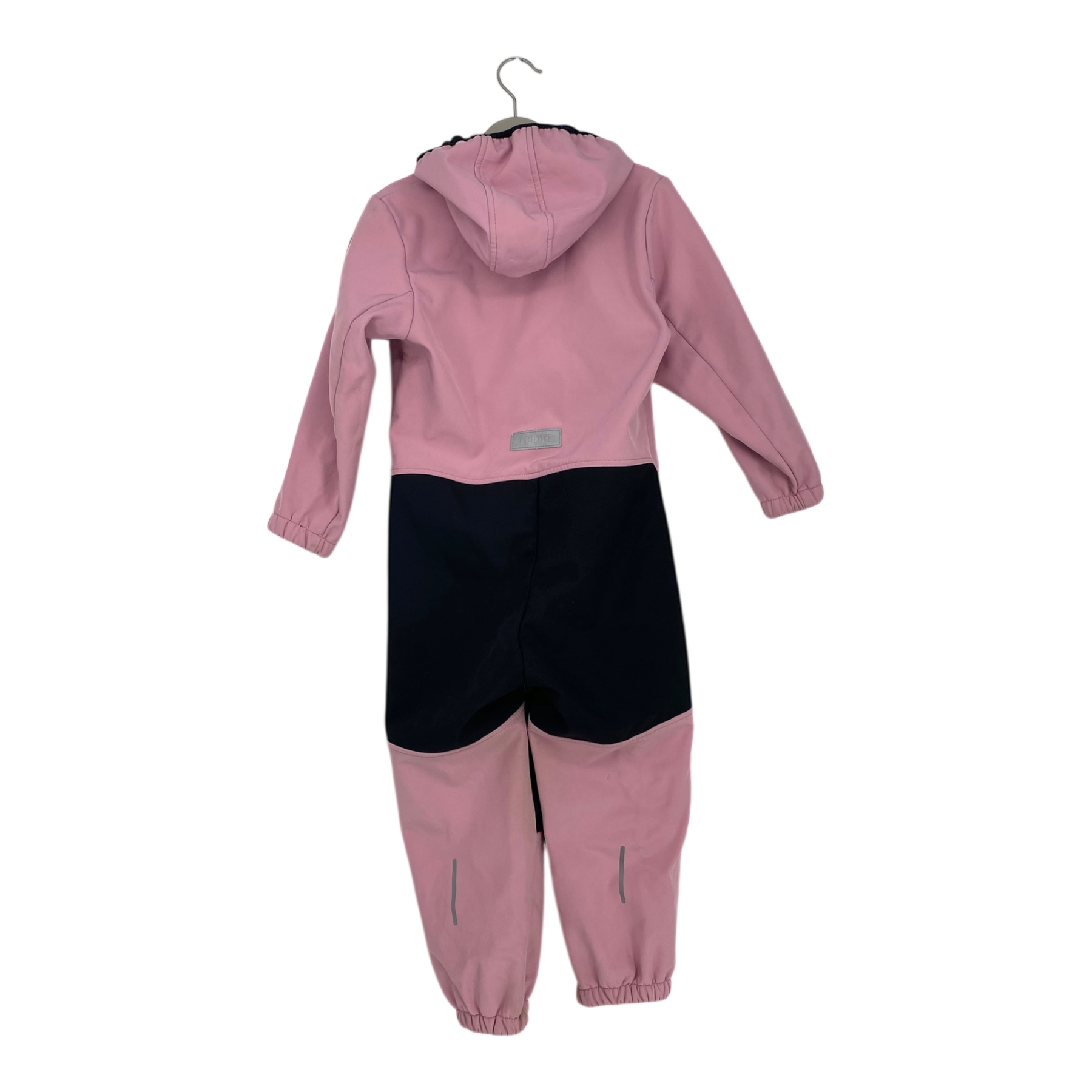 Reima Nurmes softshell midseason overall with durable reinforcements and fleece on reverse. Originally the surface has been treated with water-repellent finish. Elastic cuffs at wrists and leg ends together with the durable, detachable hood, a zipper pocket and zipper fastening in the front. Silicone foot loops are missing and the overall has some signs of use in the knee area.