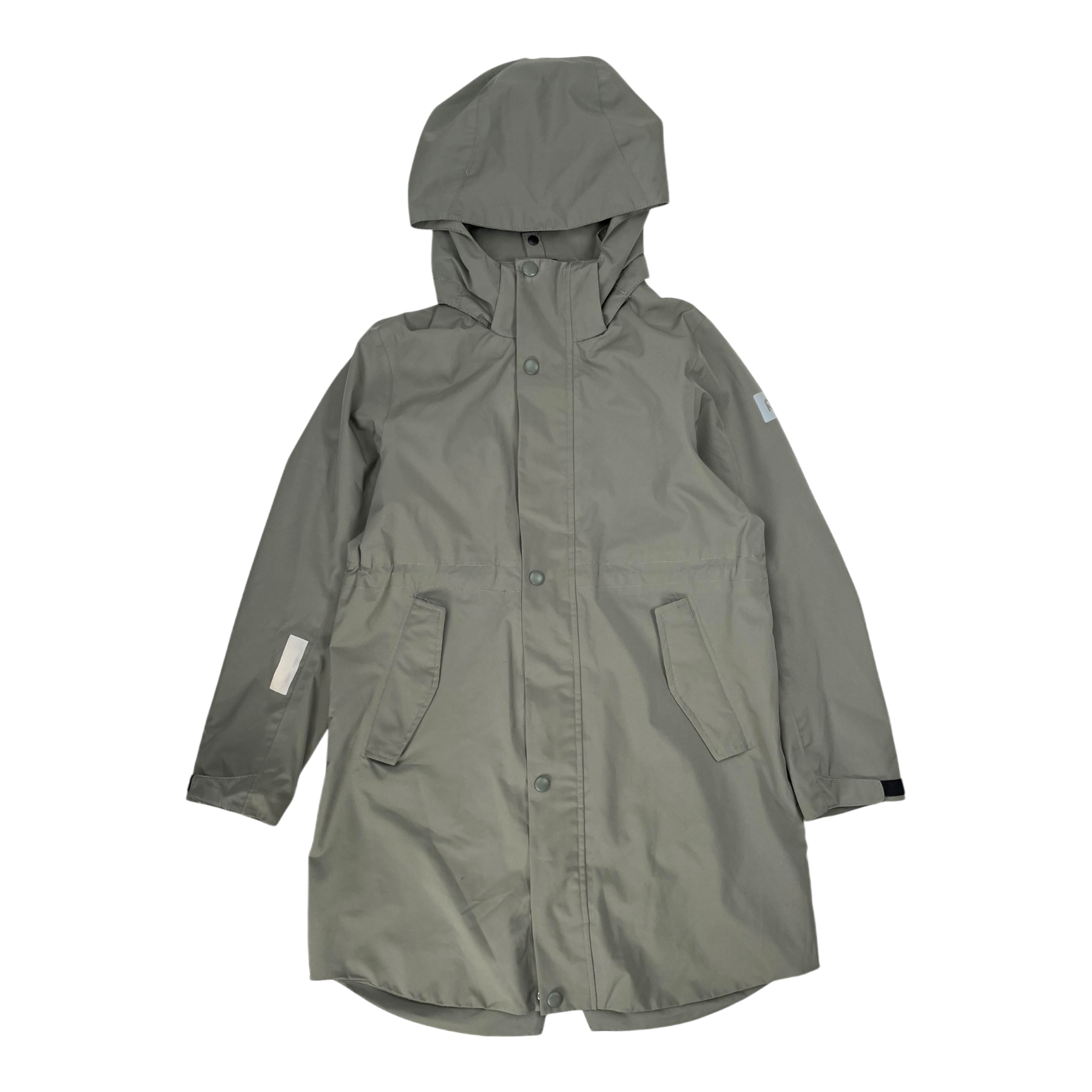 Reima Seiskari lightweight midseason jacket with detachable hood, two flap pockets, adjustable waist, and cuffs. Material is originally dirt- and water repellent.