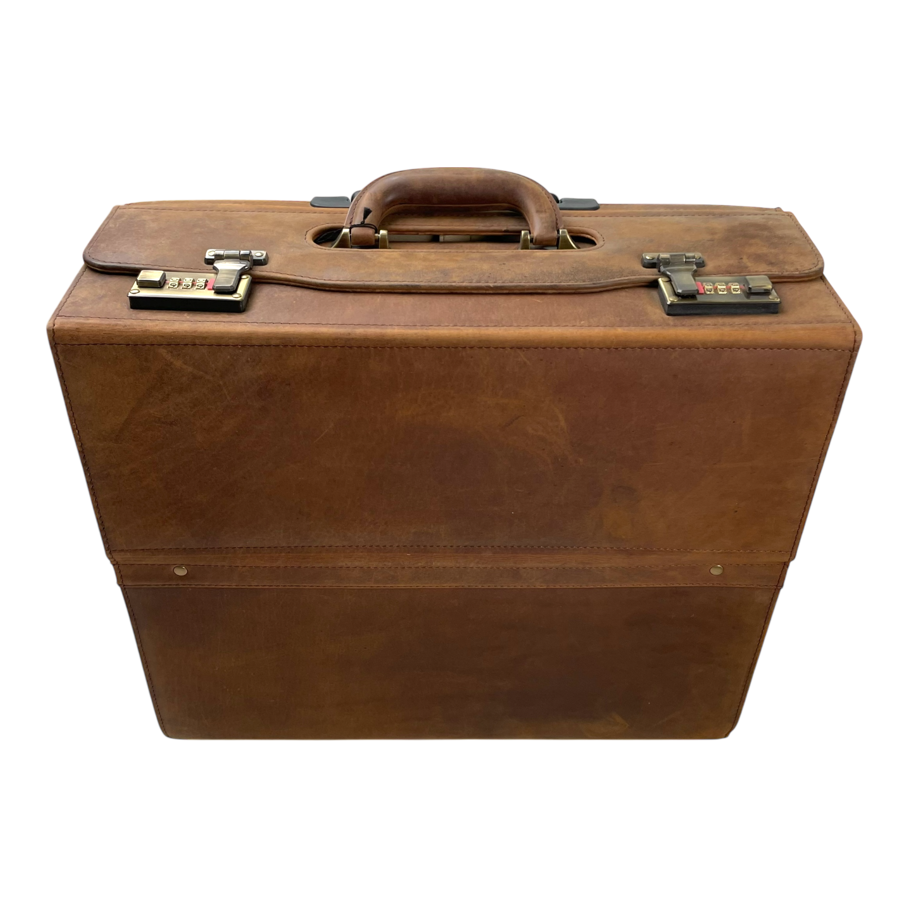 Harold's Bags leather pilot case style luggage in a brown color. The bag features a sturdy top-handle and a telescoping handle that you can pull it from. There is two wheels on the bottom and a main compartment secured by two combination locks. The two compartments on the inside where you can store your laptop and documents, are removable with velcro.
