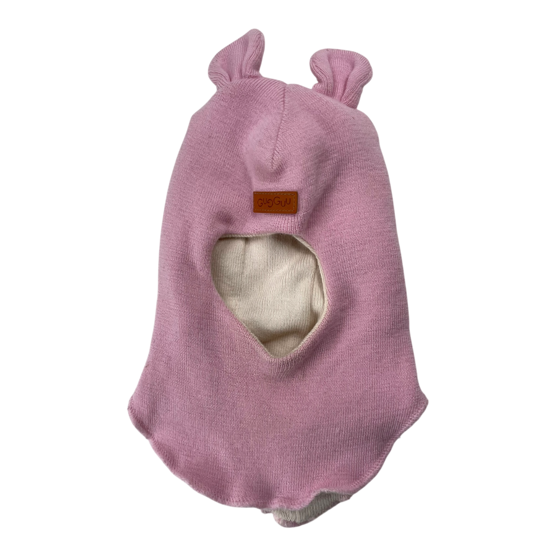 Gugguu merino wool balaclava with bear ears poms. The item has some pilling on the edges.