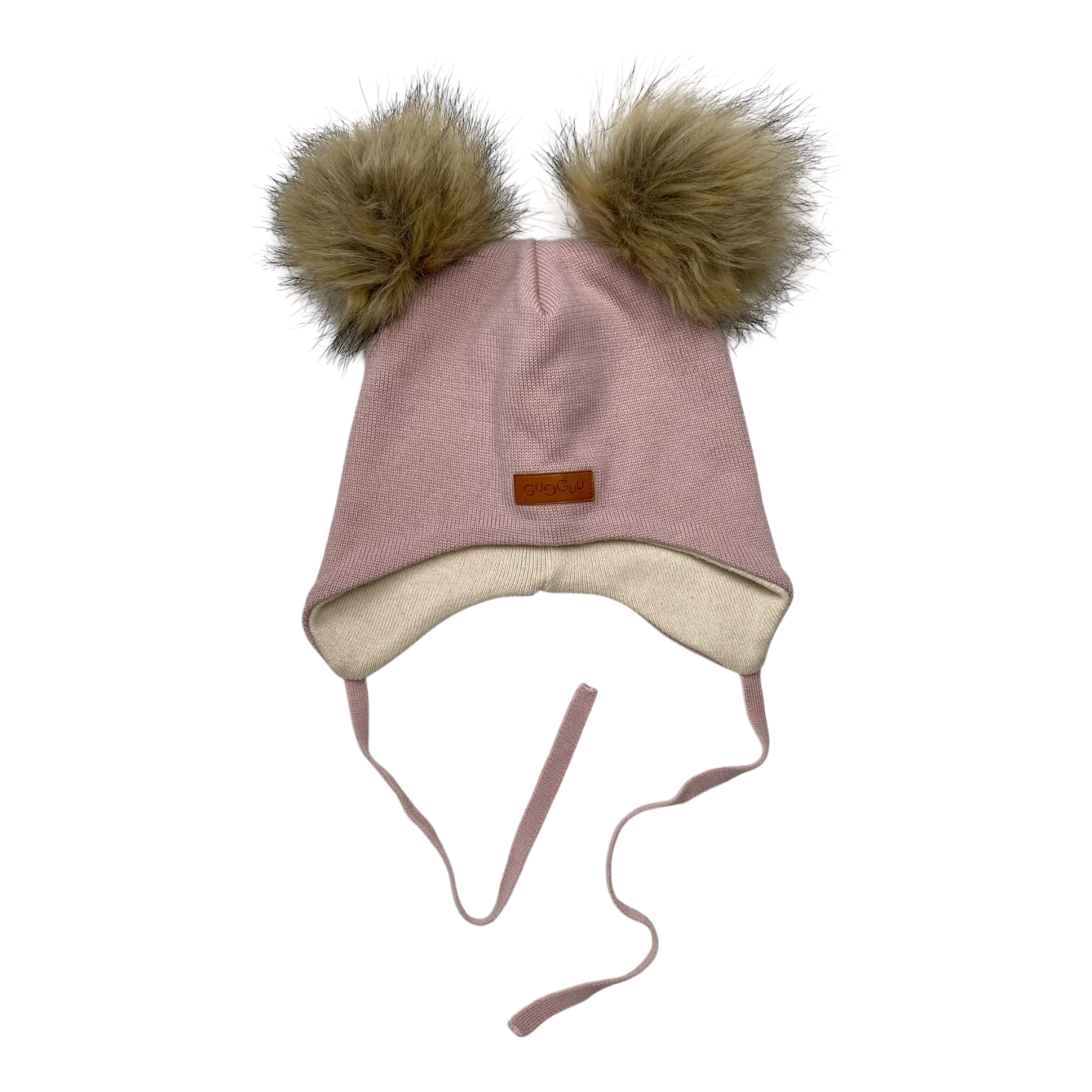 Gugguu merino wool beanie with two poms and strings to tie with.