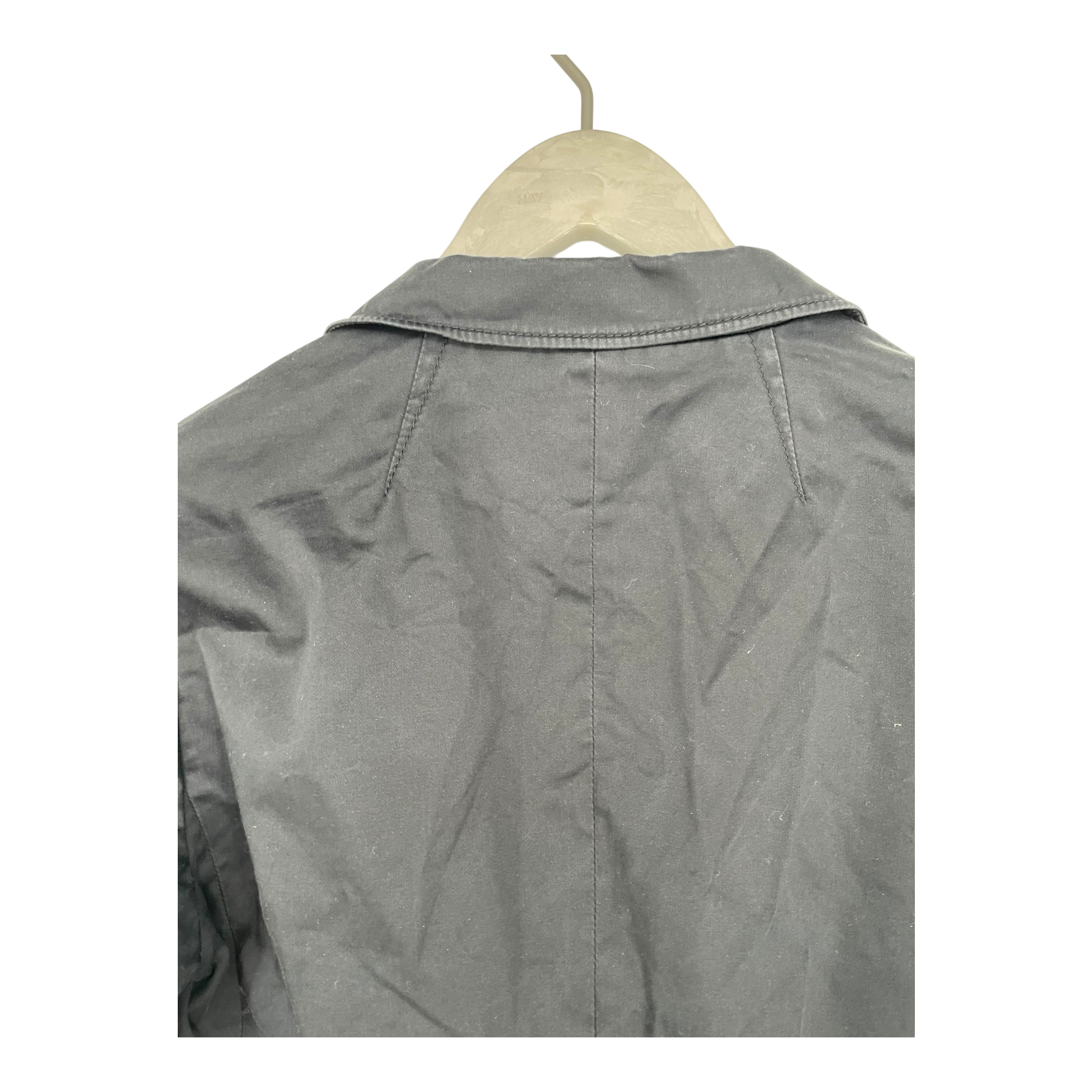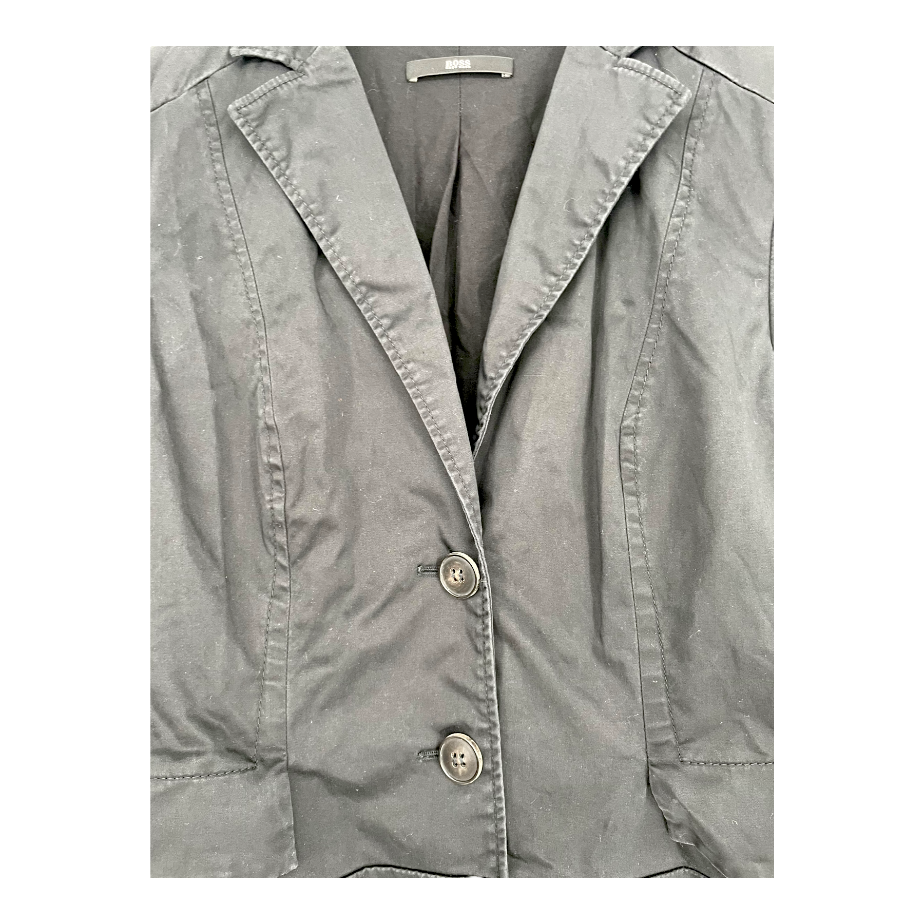 Hugo Boss blazer with two front buttons, two open front pockets and sewn detailing on the waist and on the sleeves. The item has fading on the seams, the color has faded as well and the item seems to have lost some of its shape.