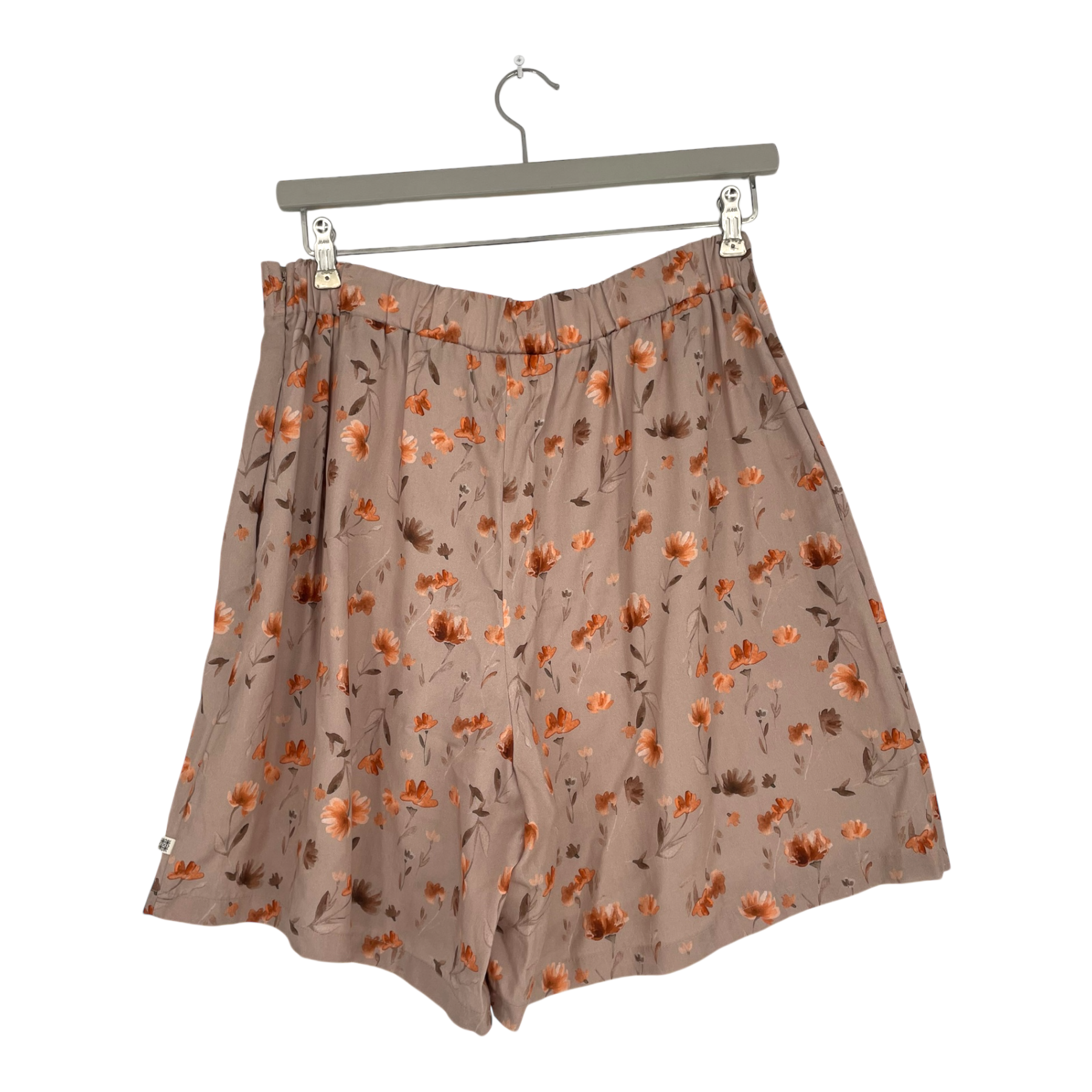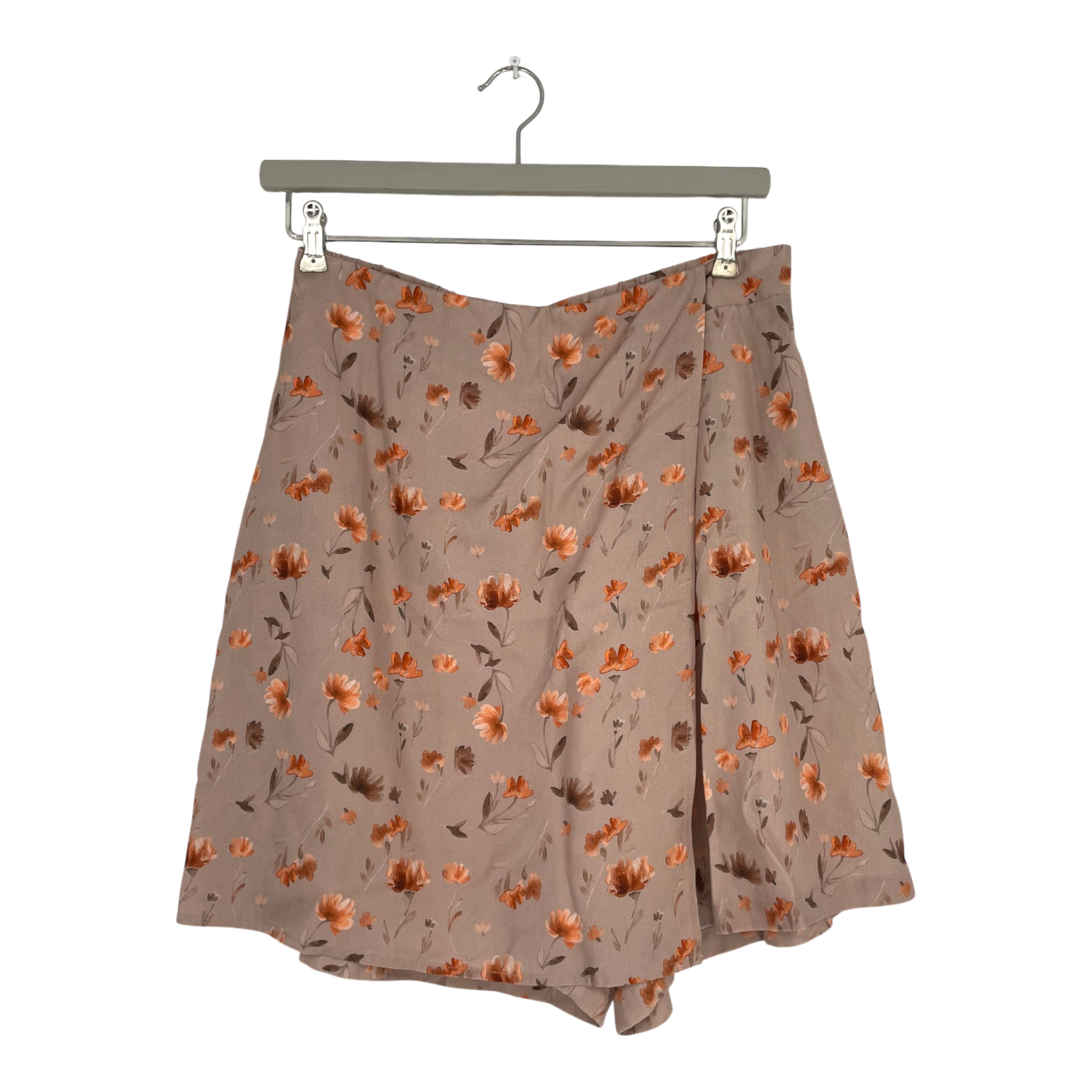 Kaiko skort/flowy shorts in a flower print. The skort has an overlapping fabric panel made to resemble a skirt covering the front. Pockets on the sides and a zipper on the back.