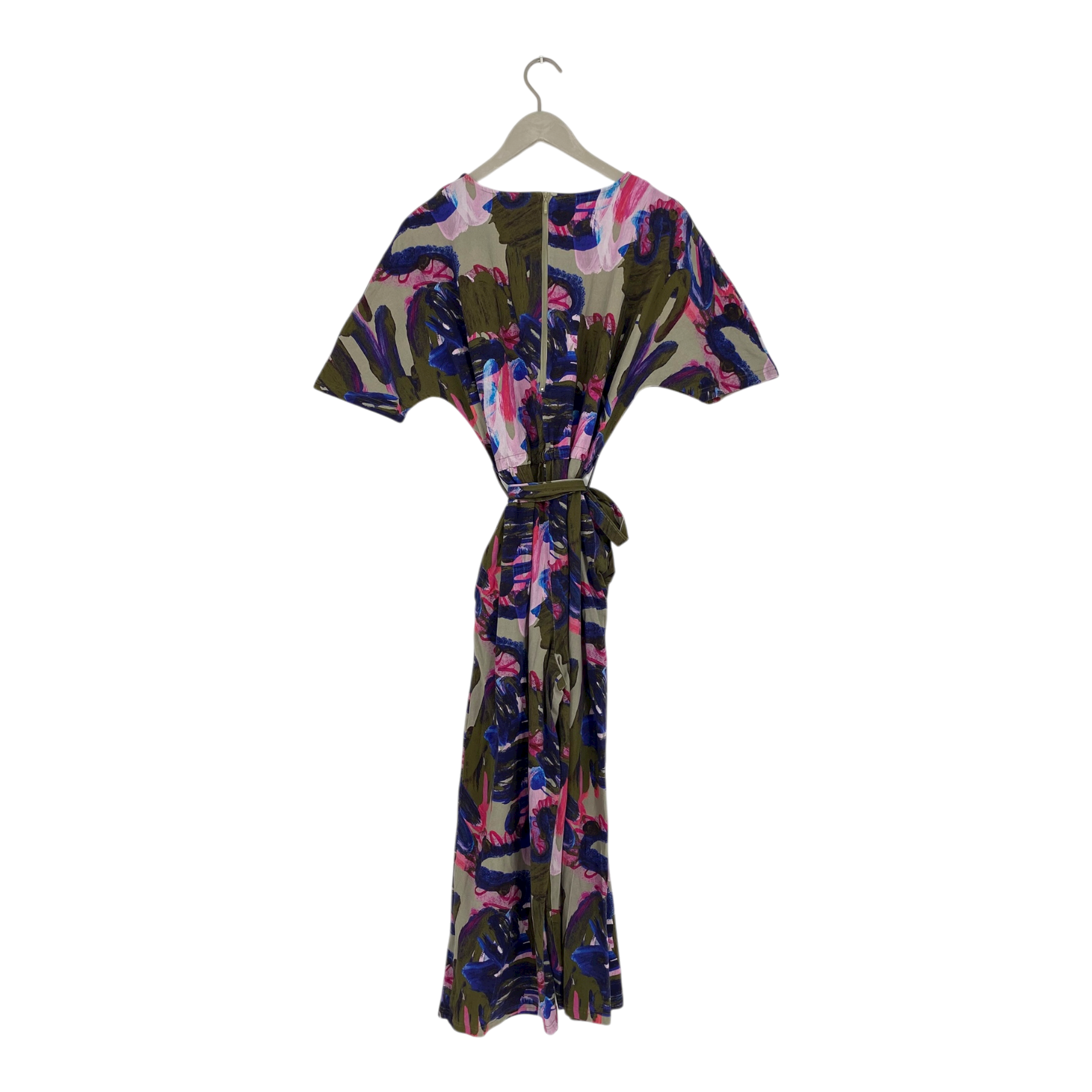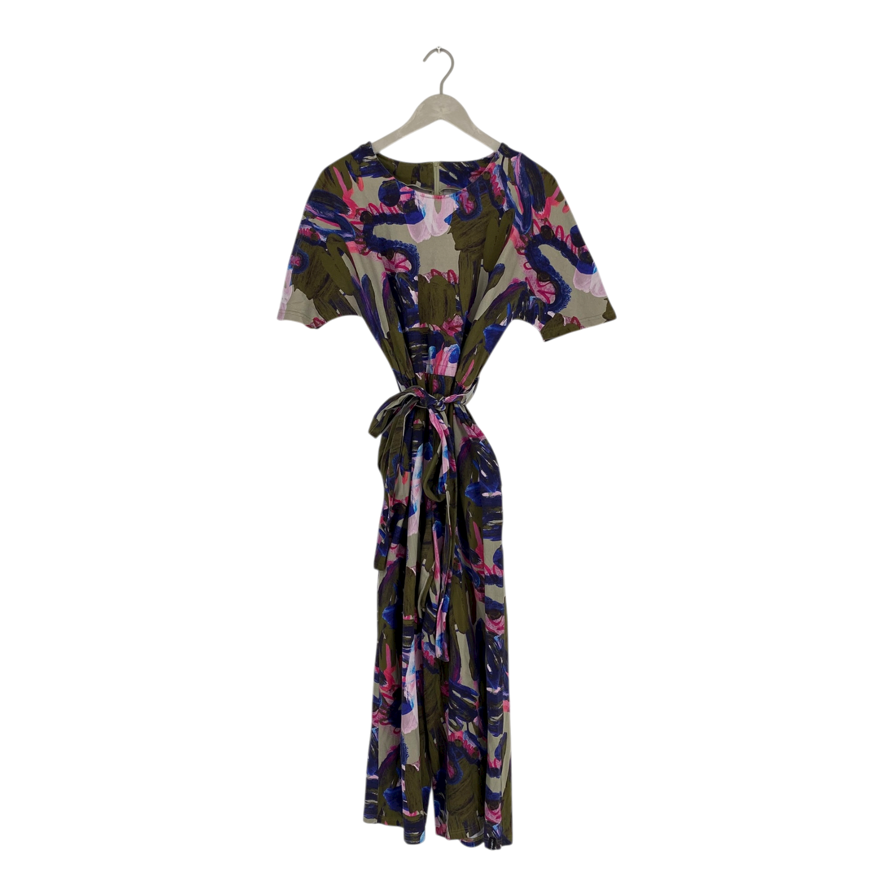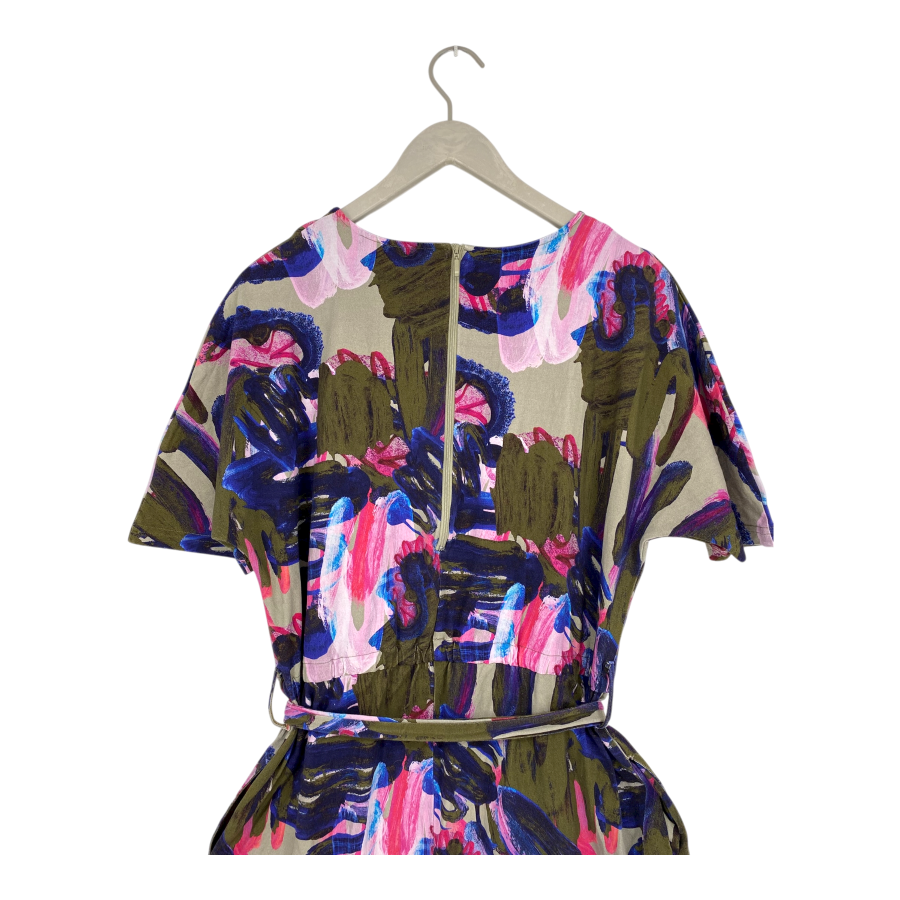 Aarrelabel women's jumpsuit has loose fit top and bottom, but is well fitting at waist with an elastic band and a removable belt. Pockets on the sides and a zipper on the back.