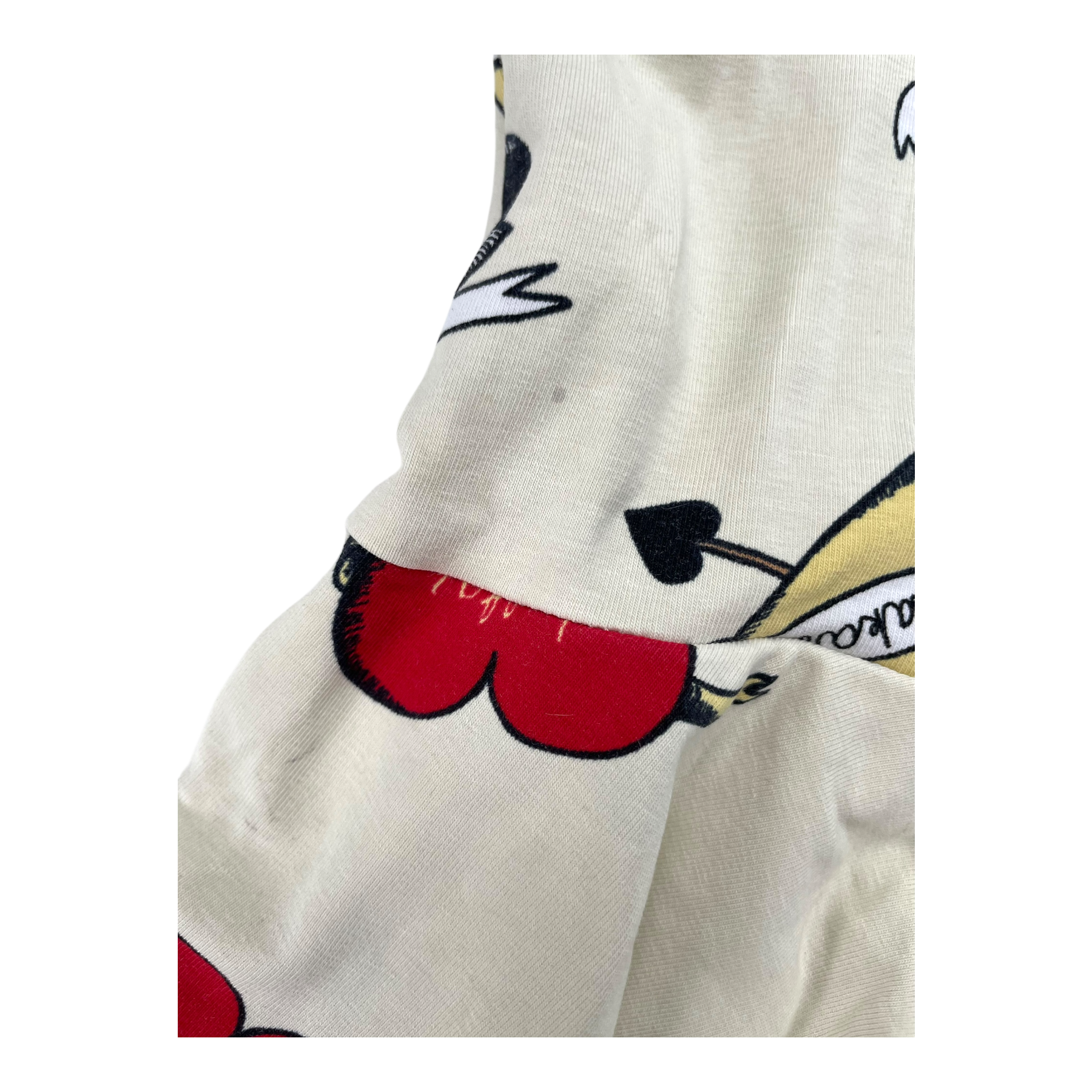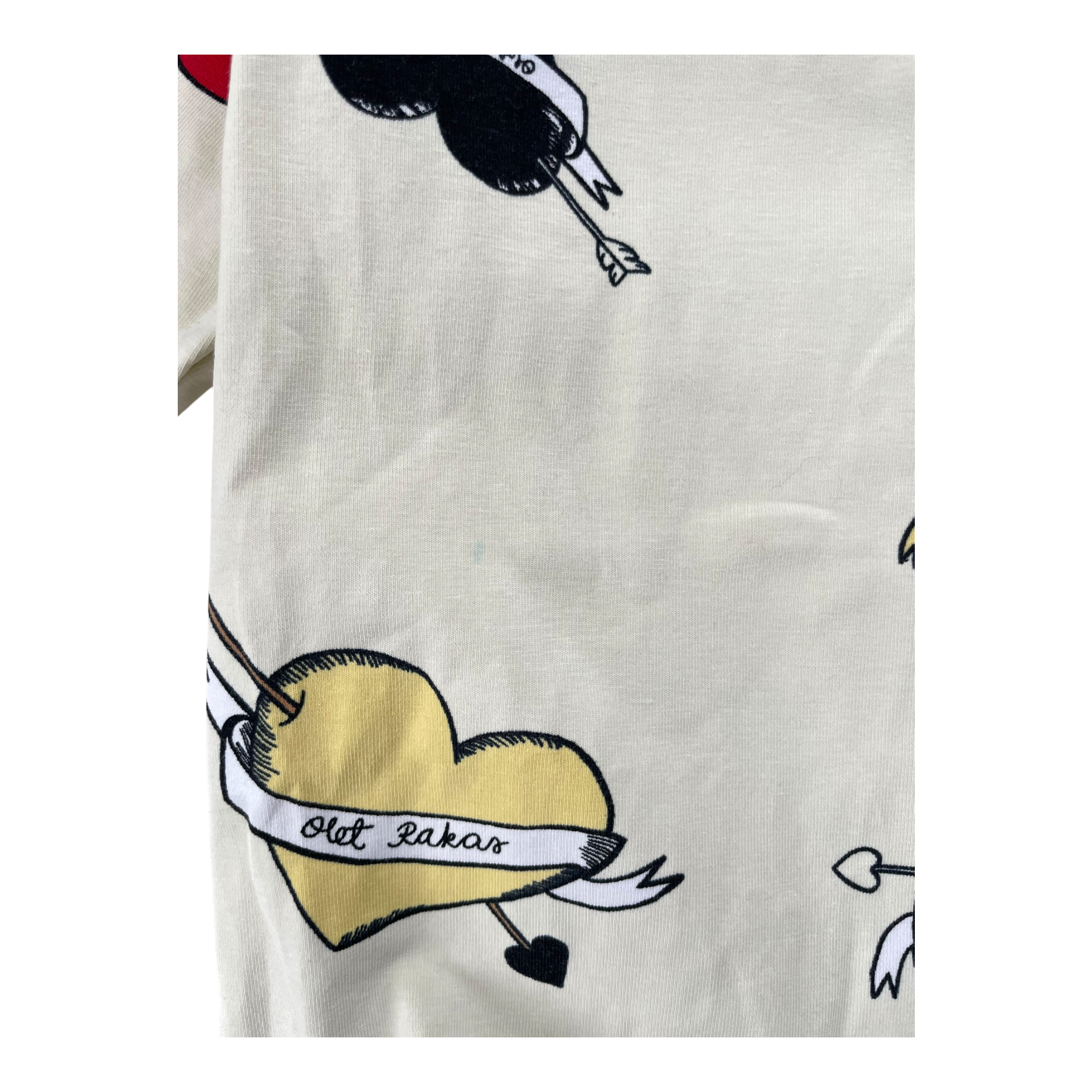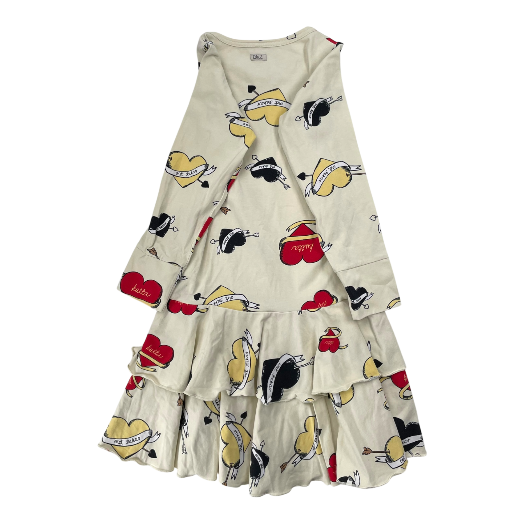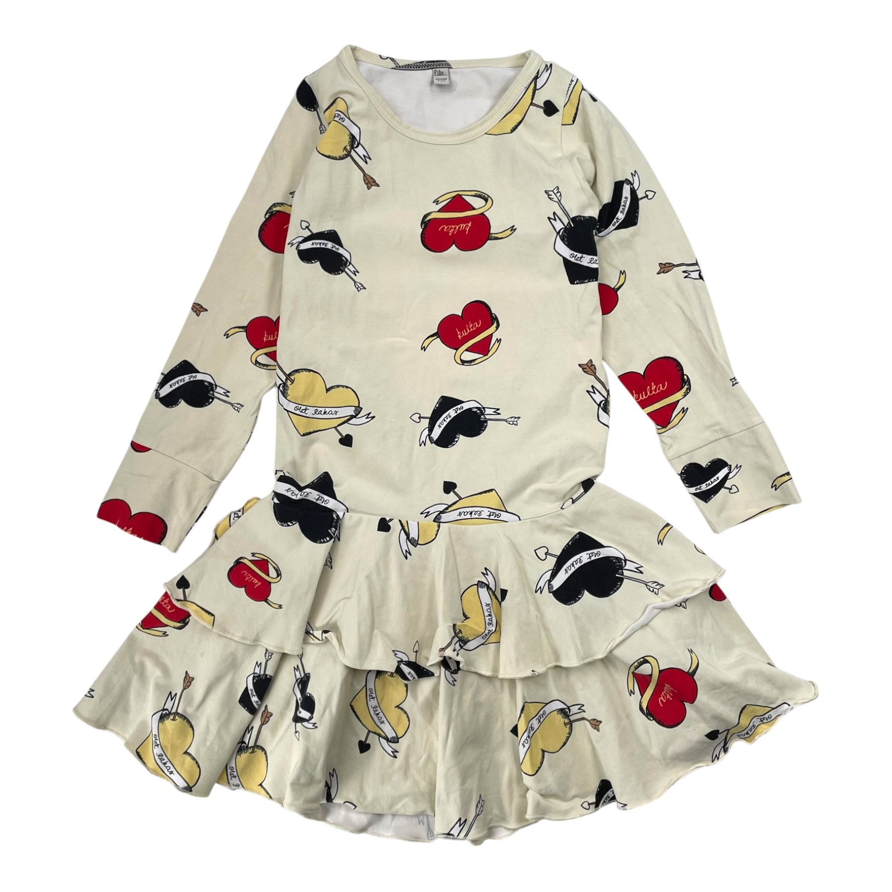 Blaa pink full sleeve frill dress in a heart print. The hearts have sayings such as "Olet rakas" and "kulta".