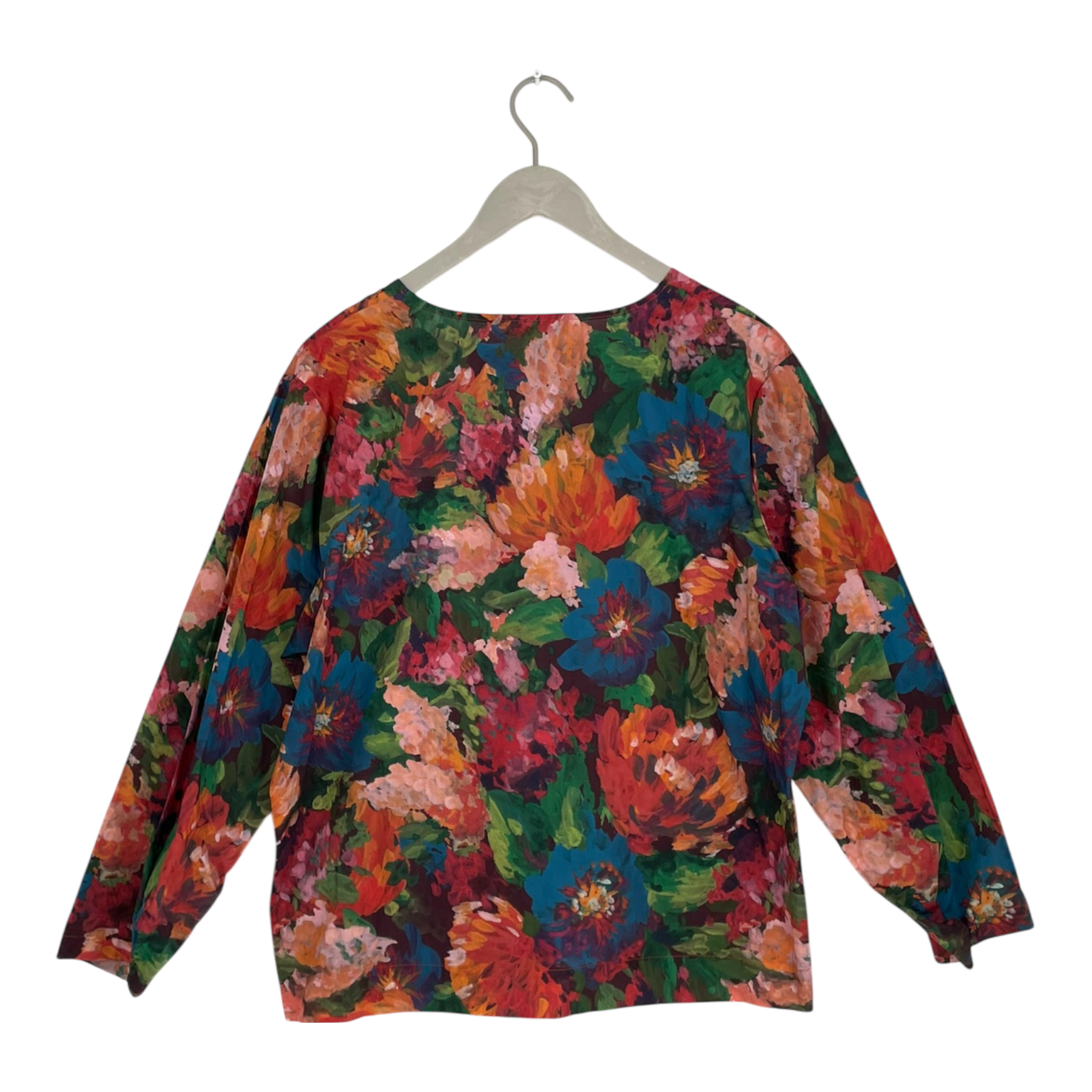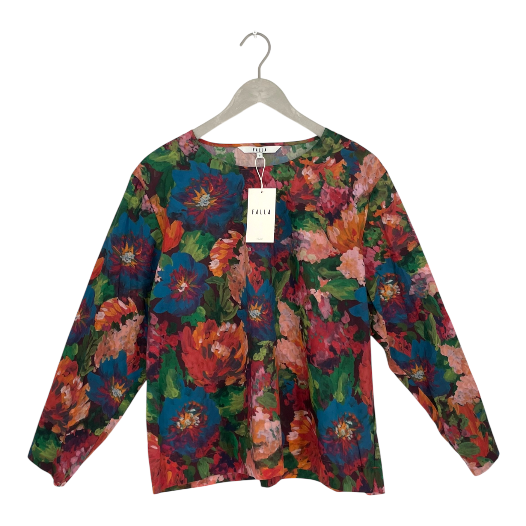 Falla Finland Kaneli Blouse is made from high-quality, lightweight cotton fabric featuring a vibrant floral print. The blouse has long sleeves and a round neckline. The sleeves include a button detail that allows you to adjust the width for a customizable fit.