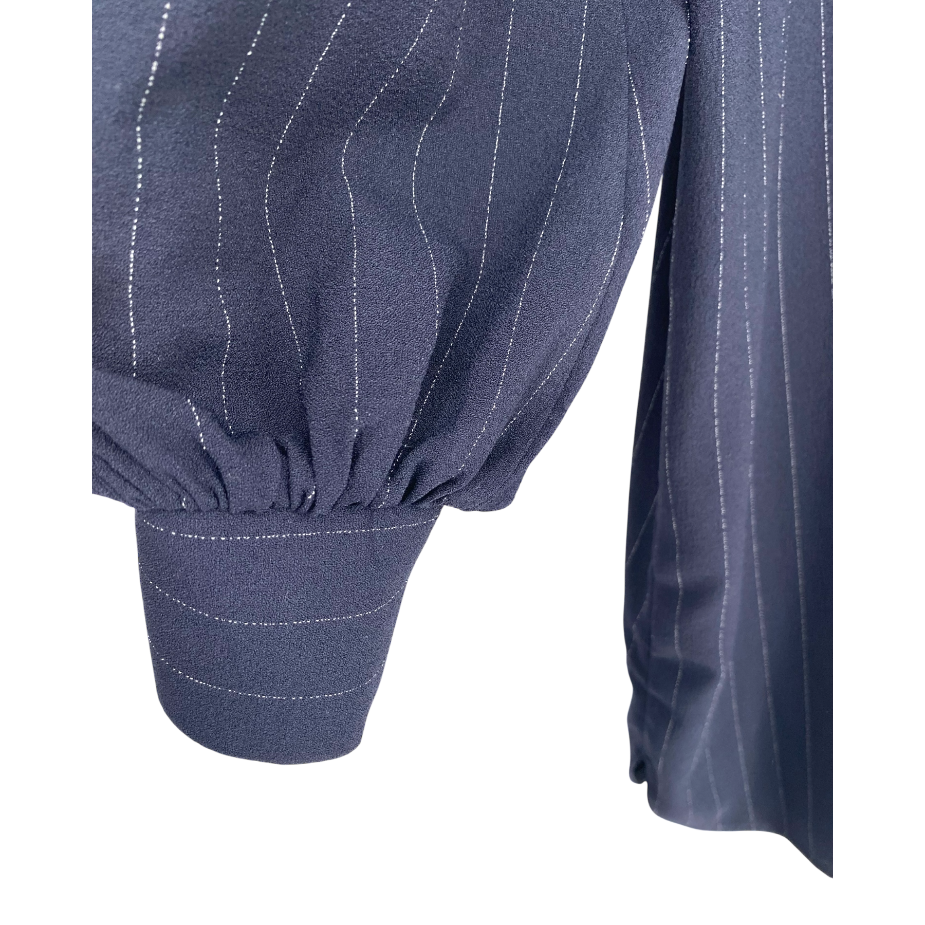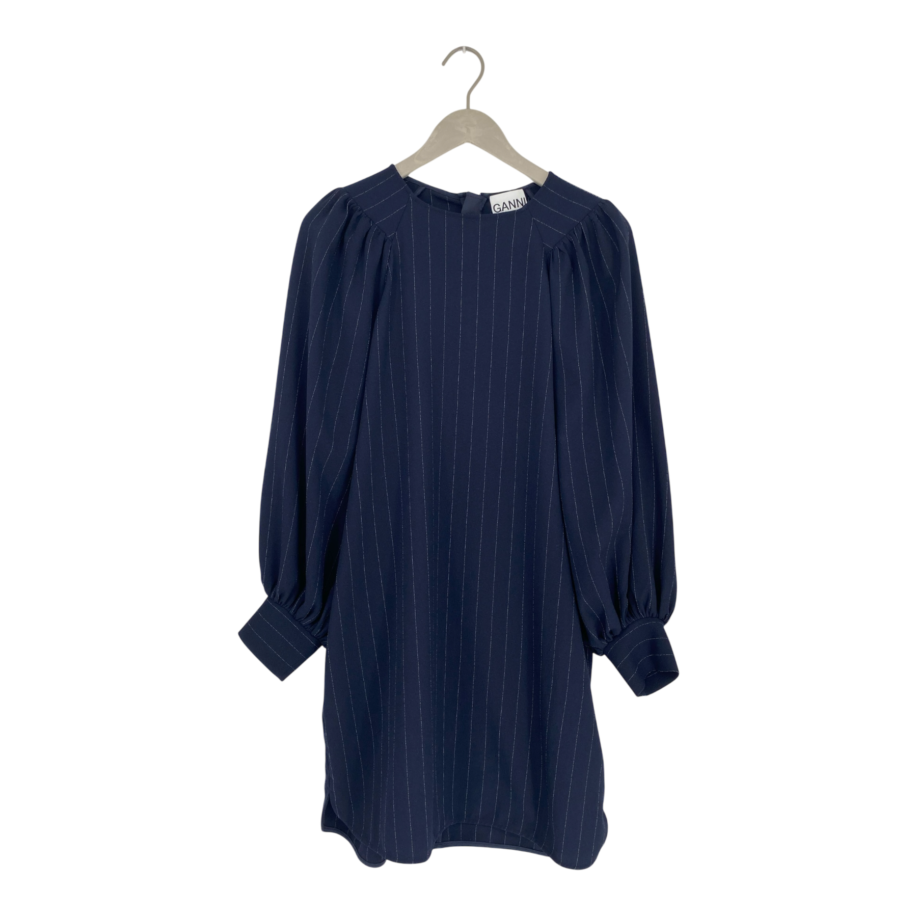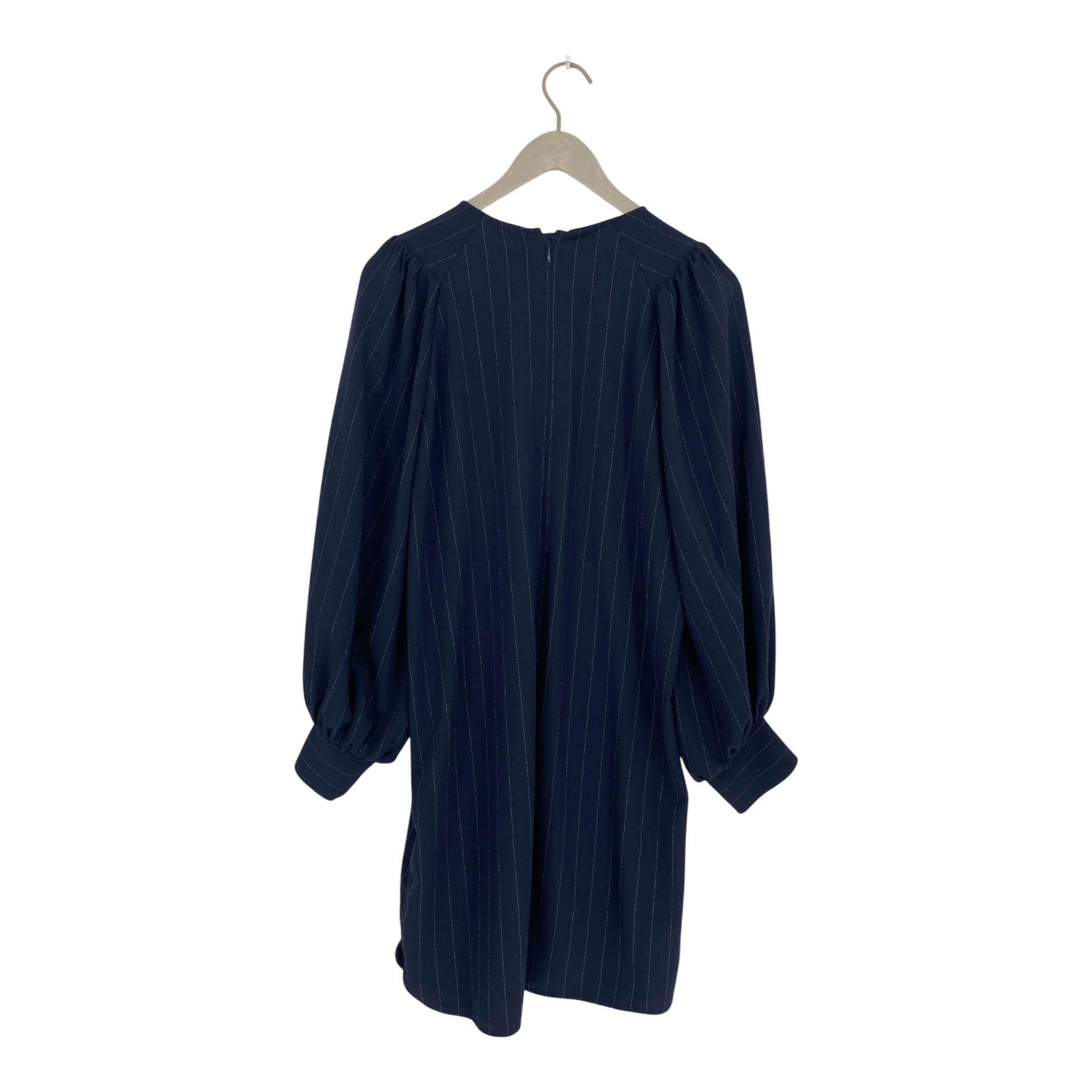 Ganni pinstripe dress, fluffed shoulders, small zipper on the back. A couple small threads sticking out on the sleeve.