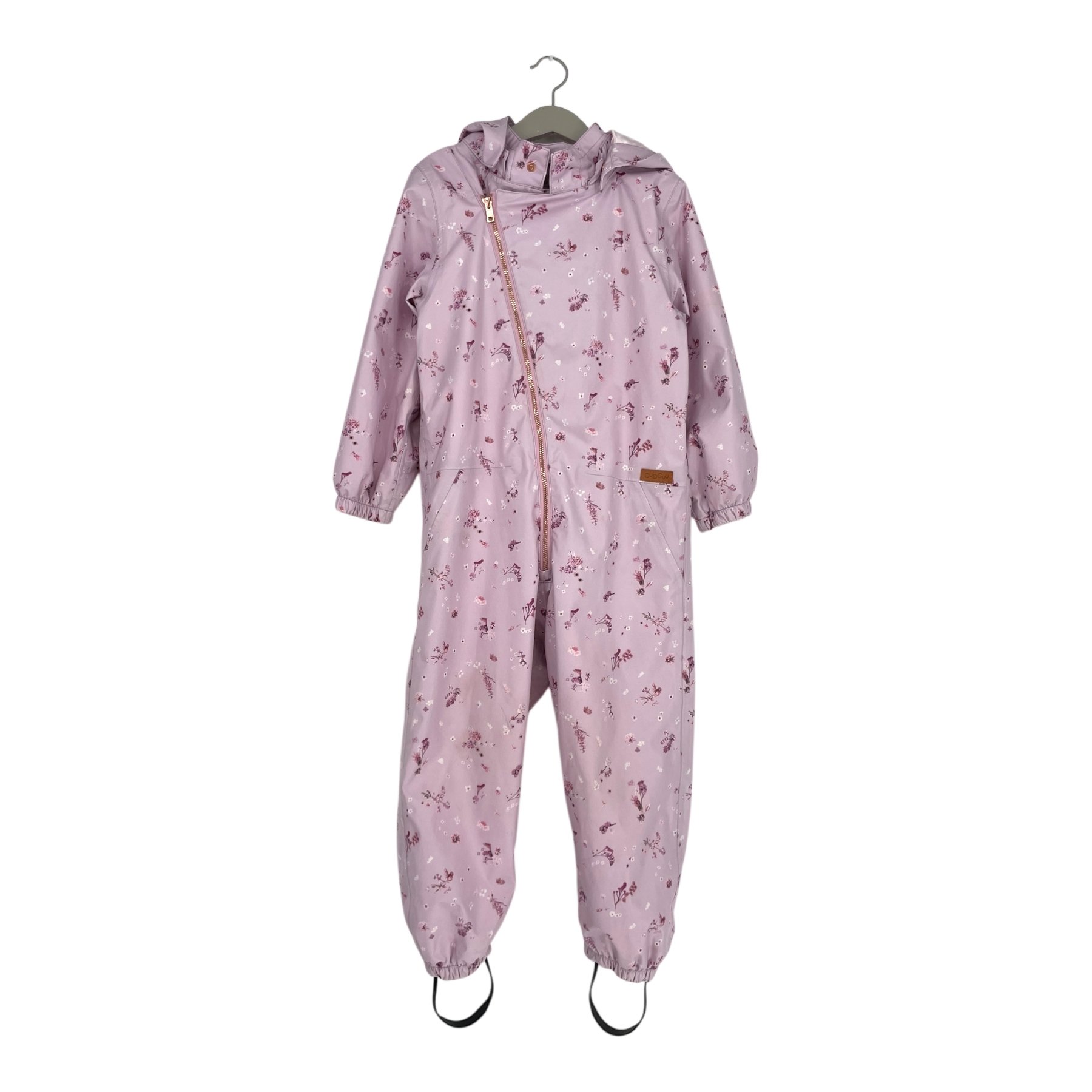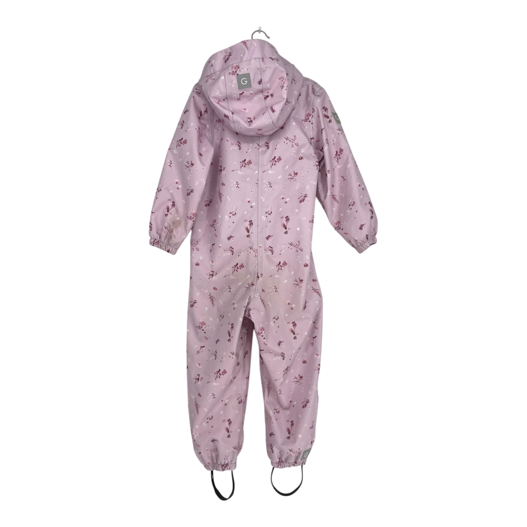 Gugguu mid season overall in flower print with a zipper, a removable hood, two pockets and rubber stirrups.