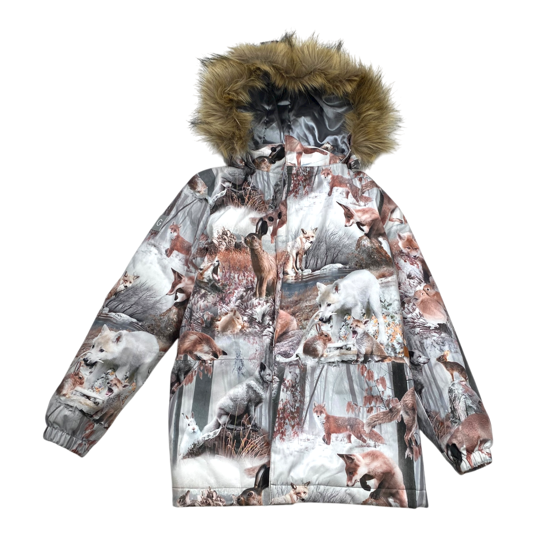 Gugguu winter parka is padded jacket with pockets and a fur lining in bear print.