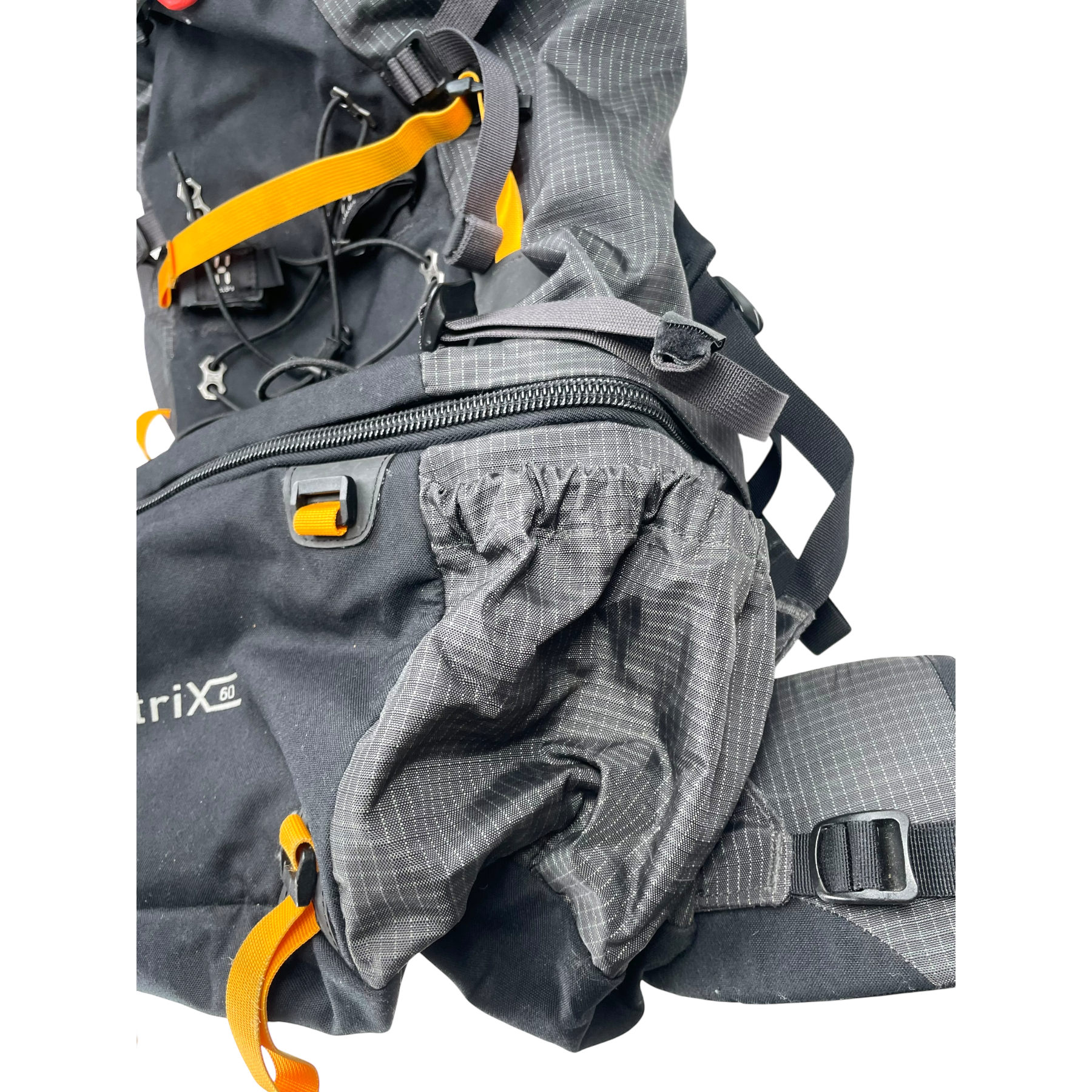 Haglöfs Matrix 60 hiking backpack with a 60L capacity. Multiple compartments and side release buckles for fastening. Sits very comfortably when worn thanks to the structured back.